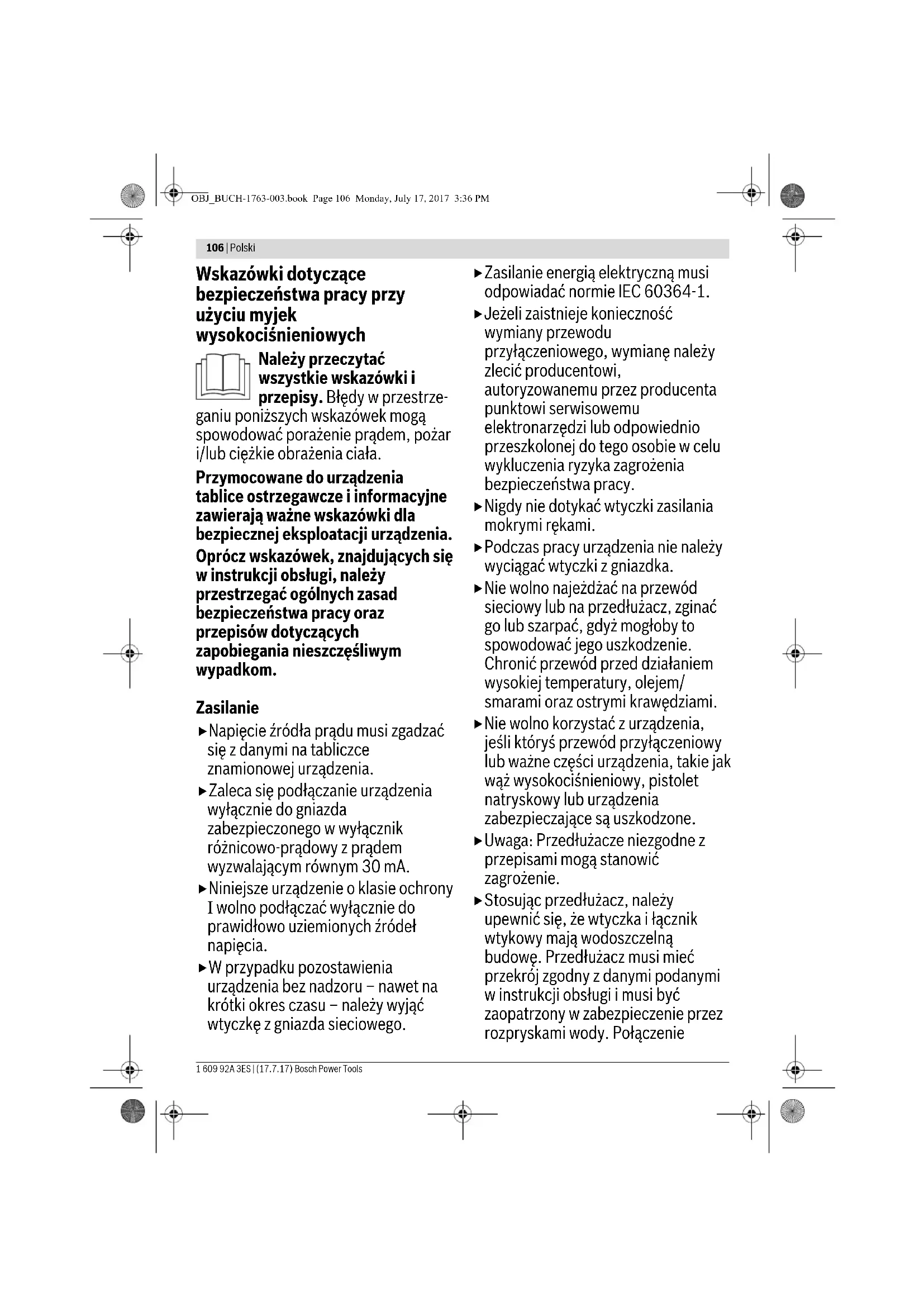 kabel przedłużający o długości maks. 20 m Połączenia przewodów (wtyczki i gniazda) powinny znajdować się w stanie suchym i nie mogą leżeć na ziemi. Zaleca się zastosowanie bębna, którego gniazdo wtykowe umieszczone jest nie niżej niż 60 mm nad podłożem. Wskazówka: Jeśli stosowany jest przedłużacz, powinien on być – zgodnie z przepisami bezpieczeństwa – uziemiony i podłączony za pomocą wtyczki z przewodem uziemiającym instalacji elektrycznej. Należy stosować się do wskazówek zawartych w instrukcji obsługi producenta przedłużacza oraz bębna, a także przestrzegać obowiązujących w danym kraju przepisów lokalnych. W razie wątpliwości należy skonsultować się z wykwalifikowanym elektrykiem albo zwrócić się do naj- bliższego punktu serwisowego firmy Bosch. Wskazówka dla produktów, nie sprzedawanych w Wielkiej Brytanii: UWAGA: Ze względu na bezpieczeństwo użytkownika wymagane jest, aby wtyk znajdujący się przy narzędziu ogrodowym połączony był z kablem przedłużającym Złącza przewodu przedłużającego powinny być zabezpieczone przed bryzgami wody, a także być wykonane z gumy lub posiadać osłonę gumową. Przedłużacz musi być zaopatrzony w uchwyt kablowy odciążający (z zabezpieczeniem przed wyrwaniem). Zasysanie wody ze zbiorników otwartych – Przykręcić wąż ssący z filtrem (specjalny wąż ssący o numerze art. F 016 800 335) do przyłącza wody. – Włączyć elektronarzędzie, po uprzednim ustawieniu niskiego ciśnienia. – Na zakończenie uruchomić urządzenie na ok. 10 sekund, a następnie wyłączyć je. Czynności tej dokonać wielokrotnie – aż woda pocieknie równomiernie i bez pęcherzyków powietrza. Należy uważać, gdyż niniejsze urządzenie nigdy nie powinno być uruchamiane bez wody. Praca urządzenia Włączanie Wąż doprowadzający wodę (nie wchodzi w skład dostawy) podłączyć do kranu z wodą i do urządzenia. Upewnić się, czy włącznik sieciowy znajduje się w pozycji „0“ i podłączyć urządzenie do źródła zasilania. Odkręcić kurek z wodą. Uruchomić blokadę, aby odsłonić spust . Nacisnąć spust do końca, aż do uzyskania równomiernego przepływu wody. W urządzeniu i wężu wysokociśnieniowym nie powinno się znajdować powietrze. Zwolnić spust. Pistolet skierować w dół. Uruchomić blokadę, aby odsłonić spust. Wcisnąć całkowicie spust. Wcisnąć włącznik/wyłącznik. Funkcja AutoStop Urządzenie automatycznie wyłącza silnik, natychmiast po zwolnieniu spustu, znajdującego się na rękojeści pistoletu. Wskazówki dotyczące pracy Wskazówki ogólne Należy upewnić się, czy myjka wysokociśnieniowa stoi na równym podłożu. Nie należy ciągnąć węża wysokociśnieniowego zbytnio do przodu. Nie należy też ciągnąć myjki wysokociśnieniowej za wąż. Może to spowodować niestabilną pozycję myjki wysokociśnieniowej lub jej upadek. Nie zaginać węża wysokociśnieniowego i nie jeździć po nim pojazdami silnikowymi. Wąż wysokociśnieniowy należy chronić przed ostrymi krawędziami oraz rogami. Nie stosować dyszy rotacyjnej do mycia pojazdów silnikowych. Wentyla bezpieczeństwa nie wolno w żaden niedozwolony sposób przestawiać lub regulować. Prętowy wskaźnik poziomu oleju Myjka wysokociśnieniowa dostarczana jest z zatyczką na zbiornik oleju stosowaną przy przechowywaniu urządzenia i z korkiem zaopatrzonym w otwór wentylacyjny (prętowy wskaźnik poziomu oleju). Wskazówki robocze dotyczące stosowania środków myjących Należy stosować wyłącznie środki czyszczące, które w sposób jednoznaczny określone zostały jako przystosowane do myjek wysokociśnieniowych. Aby chronić środowisko naturalne zalecamy oszczędne stosowanie środków czyszczących. Należy brać pod uwagę umieszczone na pojemniku zalecenia dotyczące rozcieńczenia. Wyborowa oferta środków czyszczących i konserwujących firmy Bosch gwarantuje bezusterkowe działanie urządzenia. OBJ_BUCH-1763-003.book Page 111 Monday, July 17, 2017 3:36 PM112 | Polski 1 609 92A 3ES | (17.7.17) Bosch Power Tools Zalecana metoda czyszczenia 1 etap: Usuwanie brudu Oszczędnie spryskać zabrudzone miejsce środkiem czyszczącym i odczekać przez krótki czas, aż zacznie działać. 2 etap: Usuwanie brudu Usunąć rozpuszczony brud usunąć za pomocą wysokiego ciśnienia. Wskazówka: Przy czyszczeniu pionowych powierzchni należy rozpocząć nakładanie środka czyszczącego od dołu i stopniowo przesuwać się ku górze. Spłukiwać od góry do dołu. Lokalizacja usterek Symptomy Możliwa przyczyna Usunięcie usterki Brak rozruchu silnika Odłączona wtyczka Podłączyć wtyczkę Gniazdko jest uszkodzone Podłączyć urządzenie do innego gniazdka Zadziałał bezpiecznik Wymienić bezpiecznik Przedłużacz jest uszkodzony Spróbować uruchomić urządzenie bez przedłużacza Zadziałał wyłącznik przeciwprzeciążeniowy silnika Chłodzić silnik 15 min. Zamarzniętęty Rozmrozić pompę, wąż doprowadzający wodę lub osprzęt Silnik zatrzymuje się Zadziałał bezpiecznik Wymienić bezpiecznik Nieprawidłowe napięcie zasilania Sprawdzić napięcie sieci – musi ono odpowiadać danym na tabliczce znamionowej urządzenia Zadziałał wyłącznik przeciwprzeciążeniowy silnika Chłodzić silnik 15 min. Bezpiecznik zadziałał Zbyt słaby bezpiecznik Podłączyć do obwodu elektrycznego, zabezpieczonego odpowiednio do mocy myjki wysokociśnieniowej Silnik działa, ale nie ma ciśnienia Dysza częściowo zatkana Wyczyścić dyszę Słychać pracę silnika, ale nie widać działania Niewystarczające napięcie sieciowe Skontrolować, czy napięcie sieciowe odpowiada danym podanym na tabliczce znamionowej Zbyt niskie napięcie spowodowane zastosowaniem przedłużacza Sprawdzić, czy użyty został odpowiedni przedłużacz Urządzenie było nieużywane przez dłuższy okres czasu Skontaktować się z autoryzowanym serwisem Bosch Problemy z funkcją AutoStop S