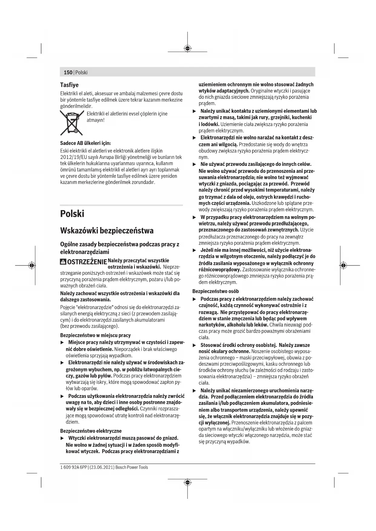 Karasoku Mahallesi 28028. Sokak No:20/A Merkez / ADANA Tel.: +903223599710 -3521379 Fax: +903223591323 E-mail: isiklar@isiklarelektrik.com Diğer servis adreslerini şurada bulabilirsiniz: www.bosch-pt.com/serviceaddresses Bosch Power Tools 1 609 92A 6PP | (23.06.2021)150 | Polski Tasfiye Elektrikli el aleti, aksesuar ve ambalaj malzemesi çevre dostu bir yöntemle tasfiye edilmek üzere tekrar kazanım merkezine gönderilmelidir. Elektrikli el aletlerini evsel çöplerin içine atmayın! Sadece AB ülkeleri için: Eski elektrikli el aletleri ve elektronik aletlere ilişkin 2012/19/EU sayılı Avrupa Birliği yönetmeliği ve bunların tek tek ülkelerin hukuklarına uyarlanması uyarınca, kullanım ömrünü tamamlamış elektrikli el aletleri ayrı ayrı toplanmak ve çevre dostu bir yöntemle tasfiye edilmek üzere yeniden kazanım merkezlerine gönderilmek zorundadır. Polski Wskazówki bezpieczeństwa Ogólne zasady bezpieczeństwa podczas pracy z elektronarzędziami OSTRZEŻENIE Należy przeczytać wszystkie ostrzeżenia i wskazówki. Nieprze- strzeganie poniższych ostrzeżeń i wskazówek może stać się przyczyną porażenia prądem elektrycznym, pożaru i/lub po- ważnych obrażeń ciała. Należy zachować wszystkie ostrzeżenia i wskazówki dla dalszego zastosowania. Pojęcie "elektronarzędzie" odnosi się do elektronarzędzi za- silanych energią elektryczną z sieci (z przewodem zasilają- cym) i do elektronarzędzi zasilanych akumulatorami (bezprzewodu zasilającego). Bezpieczeństwo w miejscu pracy u Miejsce pracy należy utrzymywać w czystości i zapew- nić dobre oświetlenie. Nieporządek i brak właściwego oświetlenia sprzyjają wypadkom. u Elektronarzędzi nie należy używać w środowiskach za- grożonym wybuchem, np. w pobliżu łatwopalnych cie- czy, gazów lub pyłów. Podczas pracy elektronarzędziem wytwarzają się iskry, które mogą spowodować zapłon py- łów lub oparów. u Podczas użytkowania elektronarzędzia należy zwrócić uwagę na to, aby dzieci i inne osoby postronne znajdo- wały się w bezpiecznej odległości. Czynniki rozprasza- jące mogą spowodować utratę kontroli nad elektronarzę- dziem. Bezpieczeństwo elektryczne u Wtyczki elektronarzędzi muszą pasować do gniazd. Nie wolno w żadnej sytuacji i w żaden sposób modyfi- kować wtyczek. Podczas pracy elektronarzędziami z uziemieniem ochronnym nie wolno stosować żadnych wtyków adaptacyjnych. Oryginalne wtyczki i pasujące do nich gniazda sieciowe zmniejszają ryzyko porażenia prądem. u Należy unikać kontaktu z uziemionymi elementami lub zwartymi z masą, takimi jak rury, grzejniki, kuchenki ilodówki. Uziemienie ciała zwiększa ryzyko porażenia prądem elektrycznym. u Elektronarzędzi nie wolno narażać na kontakt z desz- czem ani wilgocią. Przedostanie się wody do wnętrza obudowy zwiększa ryzyko porażenia prądem elektrycz- nym. u Nie używać przewodu zasilającego do innych celów. Nie wolno używać przewodu do przenoszenia ani prze- suwania elektronarzędzia; nie wolno też wyjmować wtyczki z gniazda, pociągając za przewód. Przewód należy chronić przed wysokimi temperaturami, należy go trzymać zdala od oleju, ostrych krawędzi i rucho- mych części urządzenia. Uszkodzone lub splątane prze- wody zwiększają ryzyko porażenia prądem elektrycznym. u W przypadku pracy elektronarzędziem na wolnym po- wietrzu, należy używać przewodu przedłużającego, przeznaczonego do zastosowań zewnętrznych. Użycie przedłużacza przeznaczonego do pracy na zewnątrz zmniejsza ryzyko porażenia prądem elektrycznym. u Jeżeli nie ma innej możliwości, niż użycie elektrona- rzędzia w wilgotnym otoczeniu, należy podłączyć je do źródła zasilania wyposażonego w wyłącznik ochronny różnicowoprądowy. Zastosowanie wyłącznika ochronne- go różnicowoprądowego zmniejsza ryzyko porażenia prą- dem elektrycznym. Bezpieczeństwo osób u Podczas pracy z elektronarzędziem należy zachować czujność, każdą czynność wykonywać ostrożnie i z rozwagą. Nie przystępować do pracy elektronarzę- dziem w stanie zmęczenia lub będąc pod wpływem narkotyków, alkoholu lub leków. Chwila nieuwagi pod- czas pracy może grozić bardzo poważnymi obrażeniami ciała. u Stosować środki ochrony osobistej. Należy zawsze nosić okulary ochronne. Noszenie osobistego wyposa- żenia ochronnego – maski przeciwpyłowej, obuwia zpo- deszwami przeciwpoślizgowymi, kasku ochronnego lub środków ochrony słuchu (w zależności od rodzaju i zasto- sowania elektronarzędzia) – zmniejsza ryzyko obrażeń ciała. u Należy unikać niezamierzonego uruchomienia narzę- dzia. Przed podłączeniem elektronarzędzia do źródła zasilania i/lub podłączeniem akumulatora, podniesie- niem albo transportem urządzenia, należy upewnić się, że włącznik elektronarzędzia znajduje się w pozy- cji wyłączonej. Przenoszenie elektronarzędzia z palcem opartym na włączniku/wyłączniku lub włożenie do gniaz- da sieciowego wtyczki włączonego narzędzia, może stać się przyczyną wypadków. 1 609 92A 6PP | (23.06.2021) Bosch Power ToolsPolski | 151 u Przed włączeniem elektronarzędzia należy usunąć wszystkie narzędzia nastawcze i klucze maszynowe. Narzędzia lub klucze, pozostawione wruchomych czę- ściach urządzenia, mogą spowodować obrażenia ciała. u Należy unikać nienaturalnych pozycji przy pracy. Na- leży dbać o stabilną pozycję przy pracy i zachowanie równowagi. Dzięki temu można będzie łatwiej zapano- wać nad elektronarzędziem w nieprzewidzianych sytu- acjach. u Należy nosić odpowiednią odzież. Nie należy nosić luźnej odzieży ani biżuterii. Włosy, ubranie i rękawice należy trzymać zdaleka od ruchomych części. Luźna odzież, biżuteria lub długie włosy mogą zostać pochwyco- ne przez ruchome części. u Jeżeli producent przewidział możliwość podłączenia odkurzacza lub systemu odsysania pyłu, należy upew- 