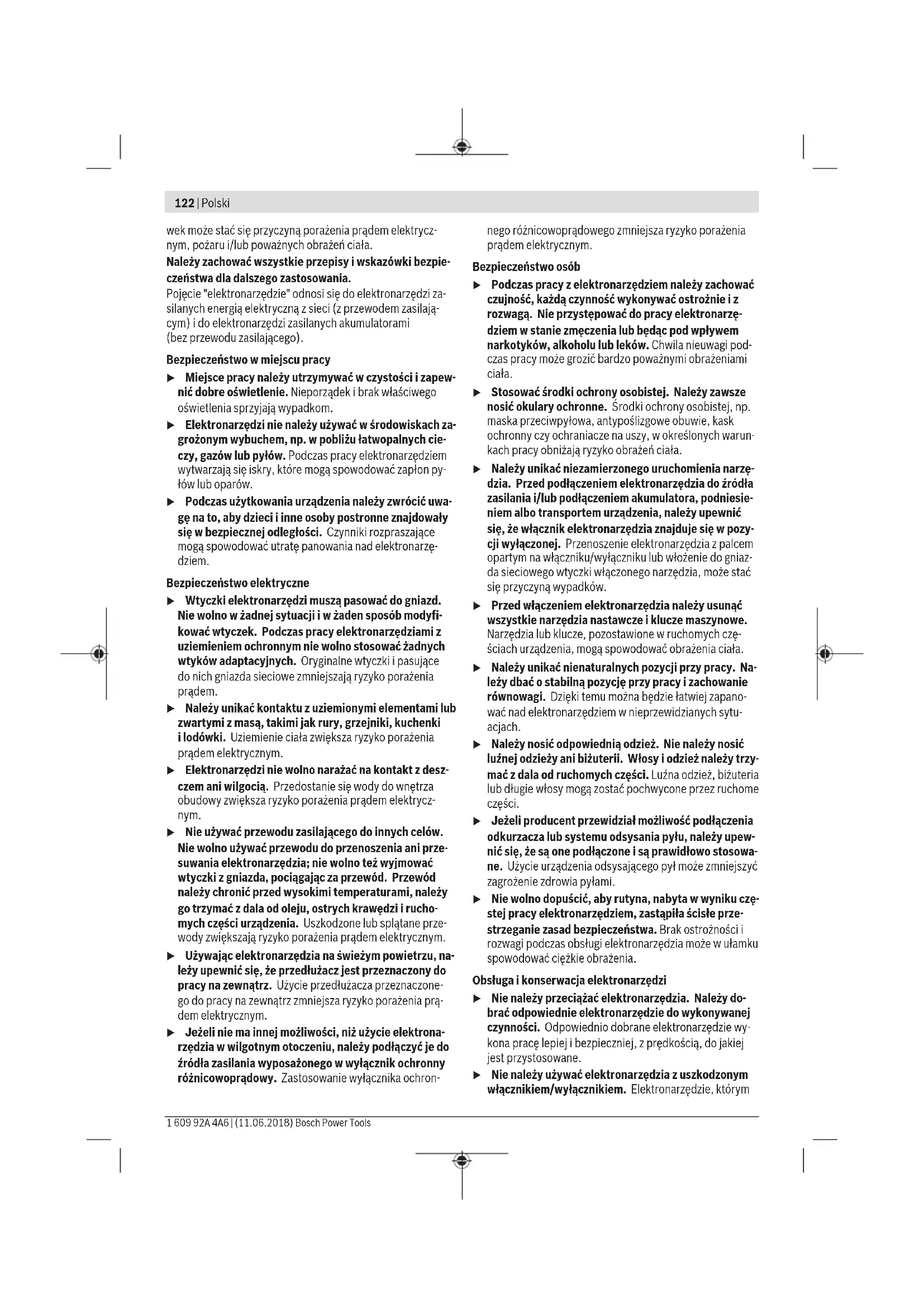 Denizli Tel.: 0258 2620666 Bulut Elektrik İstasyon Cad. No: 52/B Devlet Tiyatrosu Karşısı Elazığ Tel.: 0424 2183559 Körfez Elektrik Sanayi Çarşısı 770 Sok. No: 71 Erzincan Tel.: 0446 2230959 Ege Elektrik İnönü Bulvaro No: 135 Muğla Makasarası Fethiye Fethiye Tel.: 0252 6145701 Değer İş Bobinaj İsmetpaşa Mah. İlk Belediye Başkan Cad. 5/C Şahinbey Gaziantep Tel.: 0342 2316432 Çözüm Bobinaj İsmetpaşa Mah. Eski Şahinbey Belediyesi altı Cad. No: 3/C Gaziantep Tel.: 0342 2319500 Onarım Bobinaj Raifpaşa Cad. No: 67 İskenderun Hatay Tel.: 0326 6137546 Günşah Otomotiv Beylikdüzü Sanayi Sit. No: 210 Beylikdüzü İstanbul Tel.: 0212 8720066 Aygem 10021 Sok. No: 11 AOSB Çiğli İzmir Tel.: 0232 3768074 Sezmen Bobinaj Ege İş Merkezi 1201/4 Sok. No: 4/B Yenişehir İzmir Tel.: 0232 4571465 OBJ_BUCH-2907-001.book Page 71 Wednesday, July 27, 2016 9:32 AM72 | Polski 1 609 92A 2P0 | (27.7.16) Bosch Power Tools Ankaralı Elektrik Eski Sanayi Bölgesi 3. Cad. No: 43 Kayseri Tel.: 0352 3364216 Asal Bobinaj Eski Sanayi Sitesi Barbaros Cad. No: 24 Samsun Tel.: 0362 2289090 Üstündağ Elektrikli Aletler Nusretiye Mah. Boyacılar Aralığı No: 9 Tekirdağ Tel.: 0282 6512884 Nakliye Alet içindeki lityum iyon (Li-Ion) aküler tehlikeli madde taşıma yönetmeliği hükümlerine tabidir. Aküler başka bir yükümlülük olmaksızın kullanıcı tarafından caddeler üzerinde taşınabilir. Üçüncü kişiler eliyle yollanma durumunda (örneğin hava yolu ile veya nakliye şirketleri ile) paketleme ve etiketlemeye ilişkin özel hükümlere uyulmalıdır. Bu nedenle gönderi paketlenir- ken bir tehlikeli madde uzmanından yardım alınmalıdır. Aküleri sadece ve ancak gövdelerinde hasar yoksa gönderin. Açık kontakları kapatın ve aküyü ambalaj içinde hareket etme- yecek biçimde paketleyin. Lütfen olası ek ulusal yönetmelik hükümlerine de uyun. Tasfiye Elektrikli el aletleri, aküler, aksesuar ve ambalaj mal- zemesi çevre dostu yeniden kazanım merkezine gön- derilmek zorundadır. Elektrikli el aletlerini ve aküleri/bataryaları evsel çöplerin içine atmayın! Sadece AB üyesi ülkeler için: 2012/19/EU yönetmeliği uyarınca kullanım ömrünü tamamlamış elektrikli el aletleri ve 2006/66/EC yönetmeliği uyarınca arızalı veya kullanım ömrünü tamamlamış aküler/ bataryalar ayrı ayrı toplanmak ve çevre dos- tu tasfiye için bir geri dönüşüm merkezine yollanmak zorundadır. Aküler/Bataryalar: Li-Ion: Lütfen bölüm “Nakliye”, sayfa içindeki uyarılara uyun 72. Değişiklik haklarımız saklıdır. Polski Wskazówki bezpieczeństwa Ogólne przepisy bezpieczeństwa dla elektrona- rzędzi Należy przeczytać wszystkie wskazówki i przepisy. Błędy w przestrzeganiu poniższych wskazówek mogą spowodować porażenie prądem, pożar i/lub ciężkie obrażenia ciała. Należy starannie przechowywać wszystkie przepisy i wskazówki bezpieczeństwa dla dalszego zastosowania. Użyte w poniższym tekście pojęcie »elektronarzędzie« odnosi się do elektronarzędzi zasilanych energią elektryczną z sieci (z przewodem zasilającym) i do elektronarzędzi zasilanych akumulatorami (bez przewodu zasilającego). Bezpieczeństwo miejsca pracy Stanowisko pracy należy utrzymywać w czystości i do- brze oświetlone. Nieporządek w miejscu pracy lub nie- oświetlona przestrzeń robocza mogą być przyczyną wypadków. Nie należy pracować tym elektronarzędziem w otocze- niu zagrożonym wybuchem, w którym znajdują się np. łatwopalne ciecze, gazy lub pyły. Podczas pracy elektro- narzędziem wytwarzają się iskry, które mogą spowodować zapłon. Podczas użytkowania urządzenia zwrócić uwagę na to, aby dzieci i inne osoby postronne znajdowały się w bez- piecznej odległości. Odwrócenie uwagi może spowodo- wać utratę kontroli nad narzędziem. Bezpieczeństwo elektryczne Wtyczka elektronarzędzia musi pasować do gniazda. Nie wolno zmieniać wtyczki w jakikolwiek sposób. Nie wolno używać wtyków adapterowych w przypadku elektronarzędzi z uziemieniem ochronnym. Niezmienio- ne wtyczki i pasujące gniazda zmniejszają ryzyko poraże- nia prądem. Należy unikać kontaktu z uziemionymi powierzchniami jak rury, grzejniki, piece i lodówki. Ryzyko porażenia prądem jest większe, gdy ciało użytkownika jest uziemio- ne. Urządzenie należy zabezpieczyć przed deszczem i wil- gocią. Przedostanie się wody do elektronarzędzia pod- wyższa ryzyko porażenia prądem. Nigdy nie należy używać przewodu do innych czynno- ści. Nigdy nie należy nosić elektronarzędzia, trzymając je za przewód, ani używać przewodu do zawieszenia urządzenia; nie wolno też wyciągać wtyczki z gniazdka pociągając za przewód. Przewód należy chronić przed wysokimi temperaturami, należy go trzymać z dala od oleju, ostrych krawędzi lub ruchomych części urządze- nia. Uszkodzone lub splątane przewody zwiększają ryzyko porażenia prądem. OSTRZEZENIE OBJ_BUCH-2907-001.book Page 72 Wednesday, July 27, 2016 9:32 AMPolski | 73 Bosch Power Tools 1 609 92A 2P0 | (27.7.16) W przypadku pracy elektronarzędziem pod gołym nie- bem, należy używać przewodu przedłużającego, dosto- sowanego również do zastosowań zewnętrznych. Uży- cie właściwego przedłużacza (dostosowanego do pracy na zewnątrz) zmniejsza ryzyko porażenia prądem. Jeżeli nie da się uniknąć zastosowania elektronarzę- dzia w wilgotnym otoczeniu, należy użyć wyłącznika ochronnego różnicowo-prądowego. Zastosowanie wyłącznika ochronnego różnicowo-prądowego zmniejsza ryzyko porażenia prądem. Bezpieczeństwo osób Podczas pracy z elektronarzędziem należy zachować ostrożność, każdą czynność wykonywać uważnie i z rozwagą. Nie należy używać elektronarzędzia, gdy jest się zmęczonym lub będąc pod wpływem narkotyków, alkoholu lub lekarstw. Moment nieuwagi przy użyciu elektronarzędzia może stać się przyczyną poważnych ura- zów