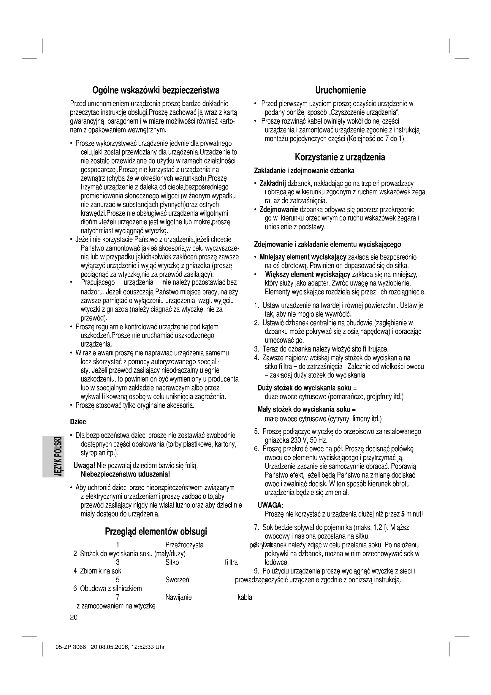dzybanek nalezy zȩć w celu przelania soku. Po nalożeni poukrywki na dzbanek,łąna w nim przychowywoć suk w lodówce. - Po uzyciu urzadzenia prosze wciagnac wtyczke z sieci i zdacocyszeci urzadzenia zgodnie z ponijsza instrukcja.