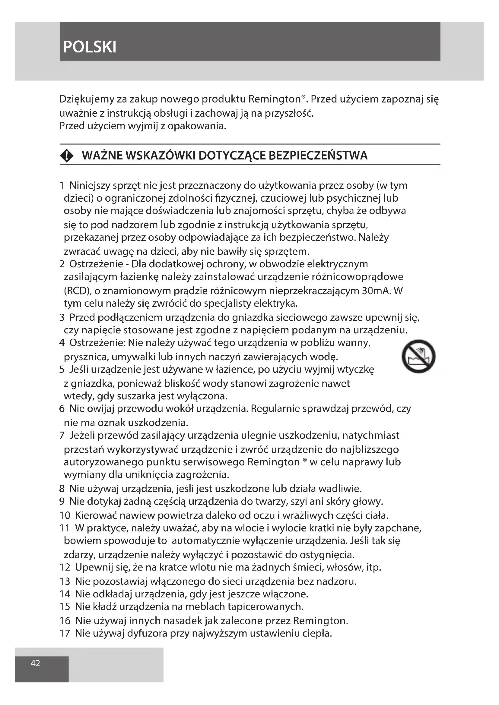 5 Ješli urzadzenie jest uzywane w faziance, po uzyciu wyjmij wtyczkę z gniażdka, poniewź bliskość wody stanowy zagrozenia nawe wtedy, gdy suszarka jest wylączona.