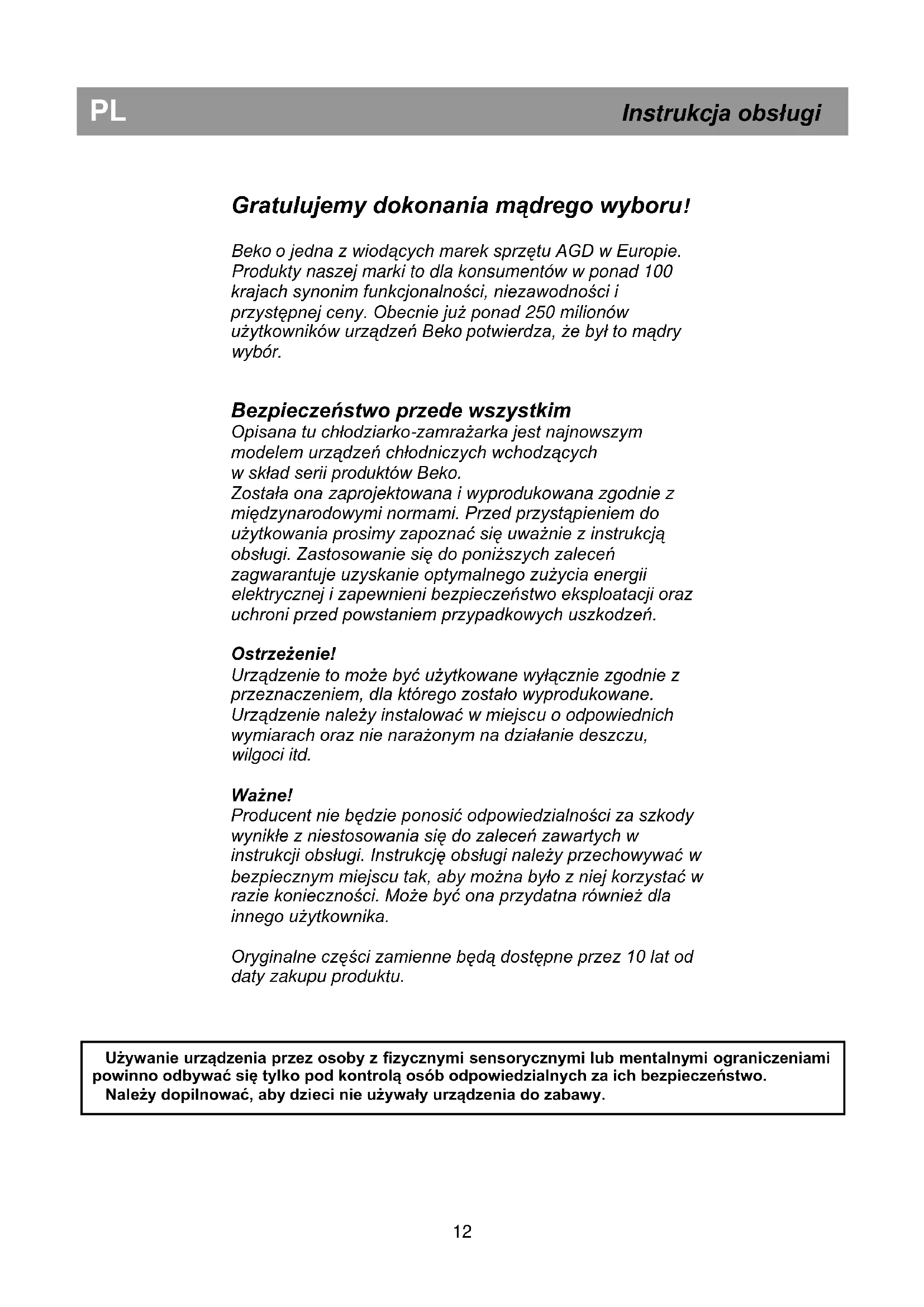 Bezpieczeństwo przede wszystkim Opisana tu chłodziarko-zamrażarka jest najnowszym modelem urządzeń chłodniczych wchodzących w skład serii produktów Beko. Została ona zaprojektowana i wyprodukowana zgodnie z międzynarodowymi normami. Przed przystąpieniem do użytkowania prosimy zapoznać się uważnie z instrukcją obsługi. Zastosowanie się do poniższych zaleceń zagwarantuje uzyskanie optymalnego zużycia energii elektrycznej i zapewnieni bezpieczeństwo eksploatacji oraz uchroni przed powstaniem przypadkowych uszkodzeń. Ostrzeżenie! Urządzenie to może być użytkowane wyłącznie zgodnie z przeznaczeniem, dla którego zostało wyprodukowane. Urządzenie należy instalować w miejscu o odpowiednich wymiarach oraz nie narażonym na działanie deszczu, wilgoci itd. Ważne! Producent nie będzie ponosić odpowiedzialności za szkody wynikłe z niestosowania się do zaleceń zawartych w instrukcji obsługi. Instrukcję obsługi należy przechowywać w bezpiecznym miejscu tak, aby można było z niej korzystać w razie konieczności. Może być ona przydatna również dla innego użytkownika. Oryginalne części zamienne będą dostępne przez 10 lat od daty zakupu produktu.