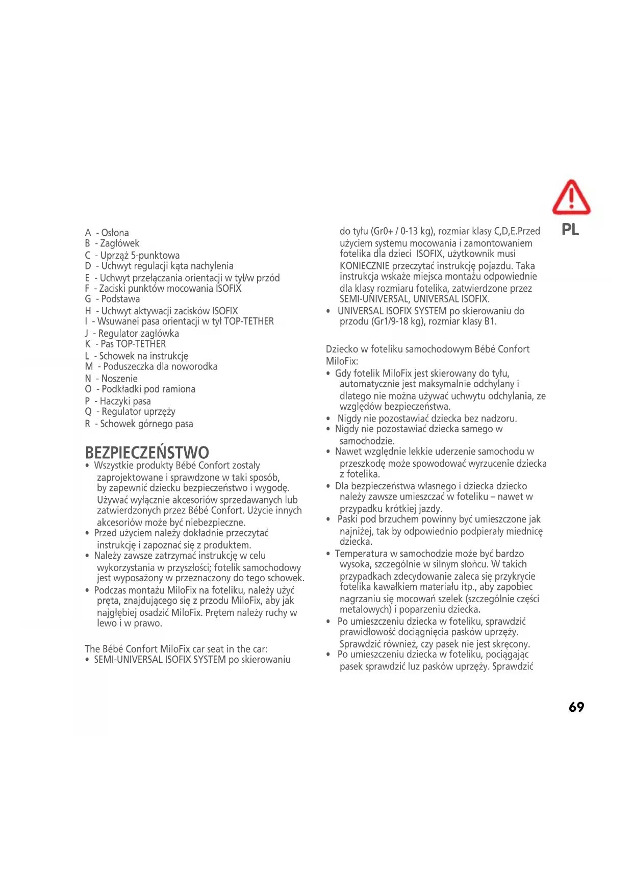 A - Osłona B - Zagłówek C - Uprząż 5-punktowa D - Uchwyt regulacji kąta nachylenia E - Uchwyt przełączania orientacji w tył/w przód F - Zaciski punktów mocowania ISOFIX G - Podstawa H - Uchwyt aktywacji zacisków ISOFIX I - Wsuwanei pasa orientacji w tył TOP-TETHER J - Regulator zagłówka K - Pas TOP-TETHER L - Schowek na instrukcję M - Poduszeczka dla noworodka N - Noszenie O - Podkładki pod ramiona P - Haczyki pasa Q - Regulator uprzęży R - Schowek górnego pasa BEZPIECZEŃSTWO