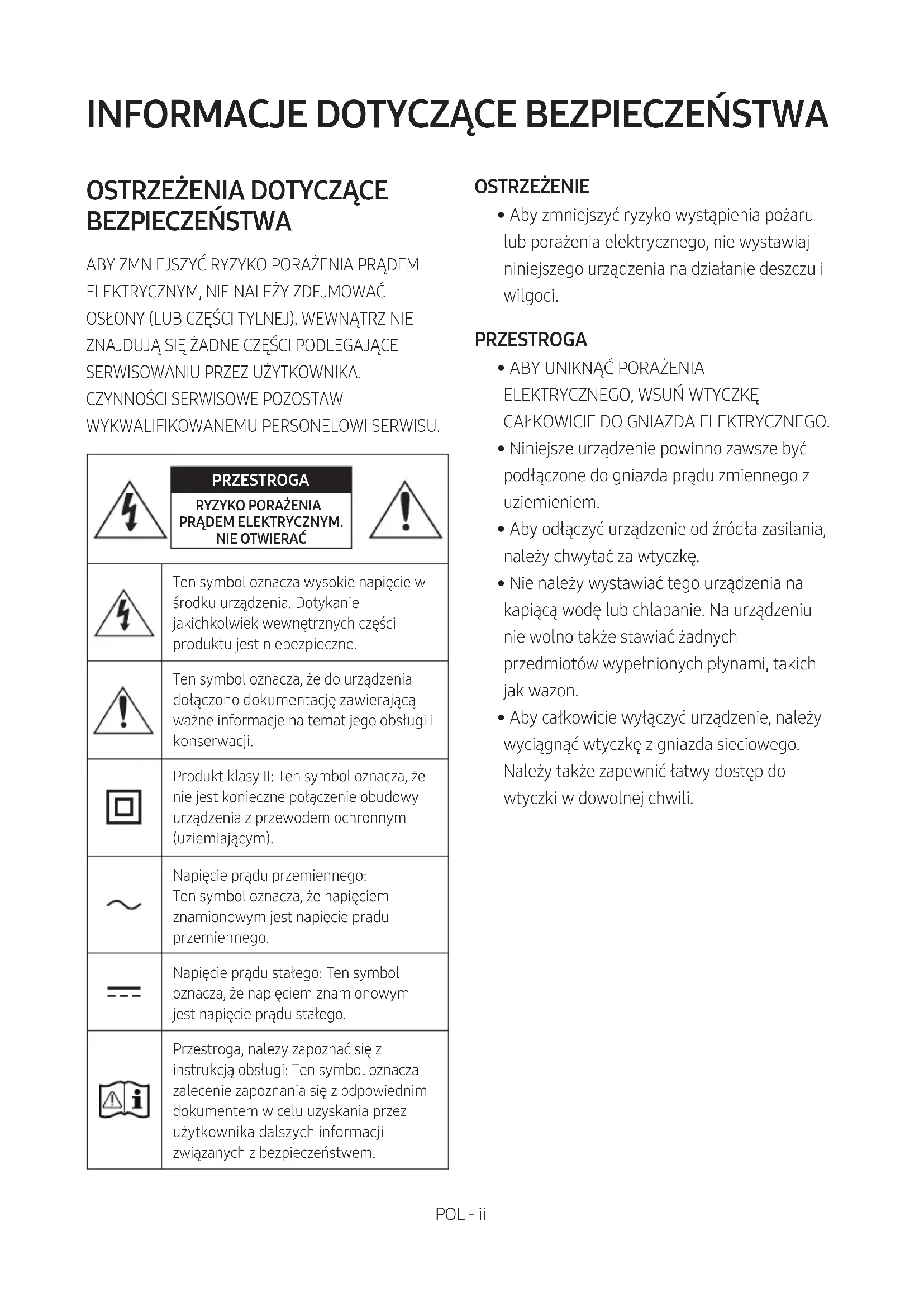 - Aby całkowicie wyłączyć urządzenie, należy wyciągnąć wtyczkę z gniazda sieciowego. Należy także zapewnić łatwy dostęp do wtyczki w dowolnej chwili.POL - iii