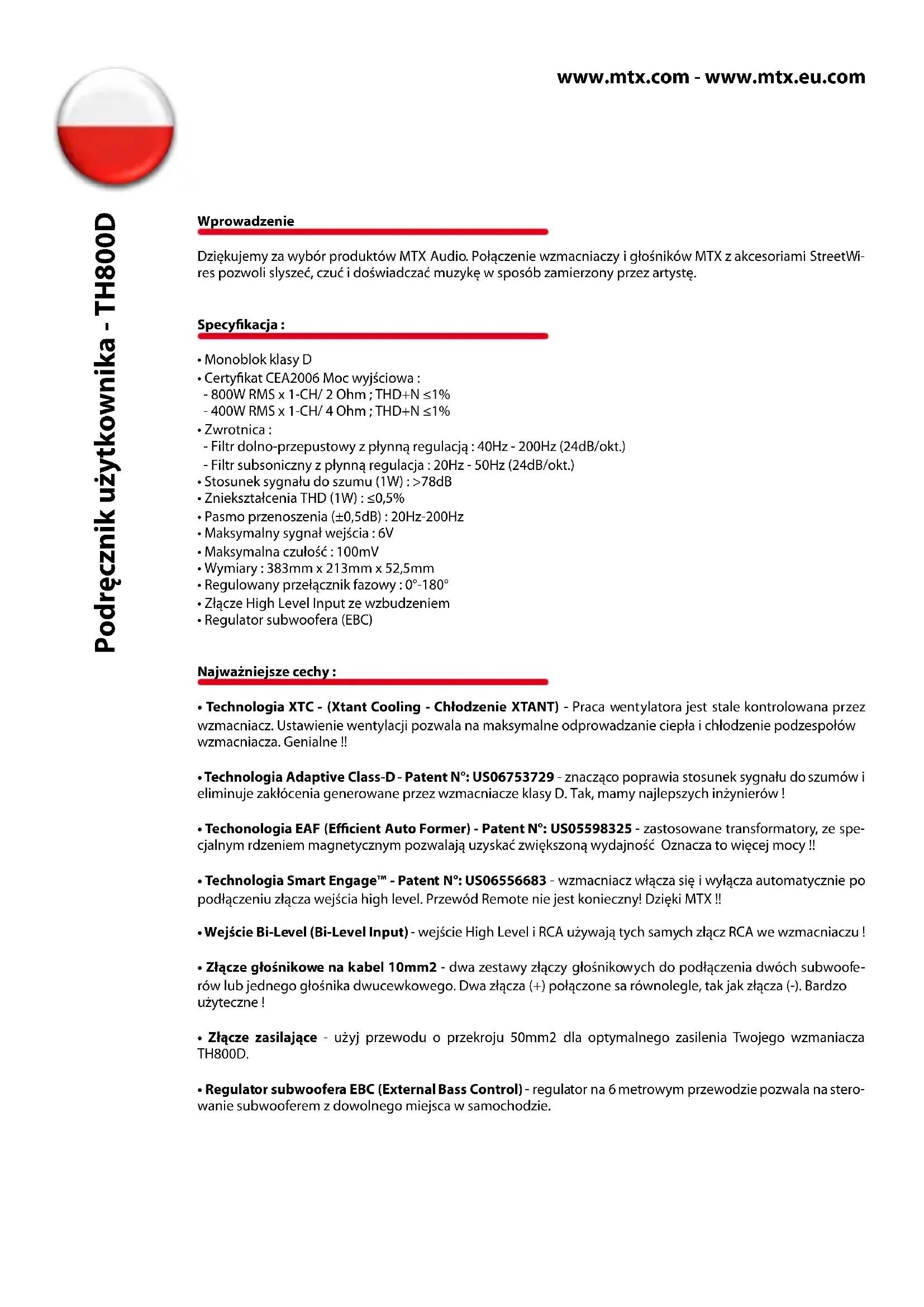 INSTRUKCJA OBSŁUGI TH800D MTX Audio