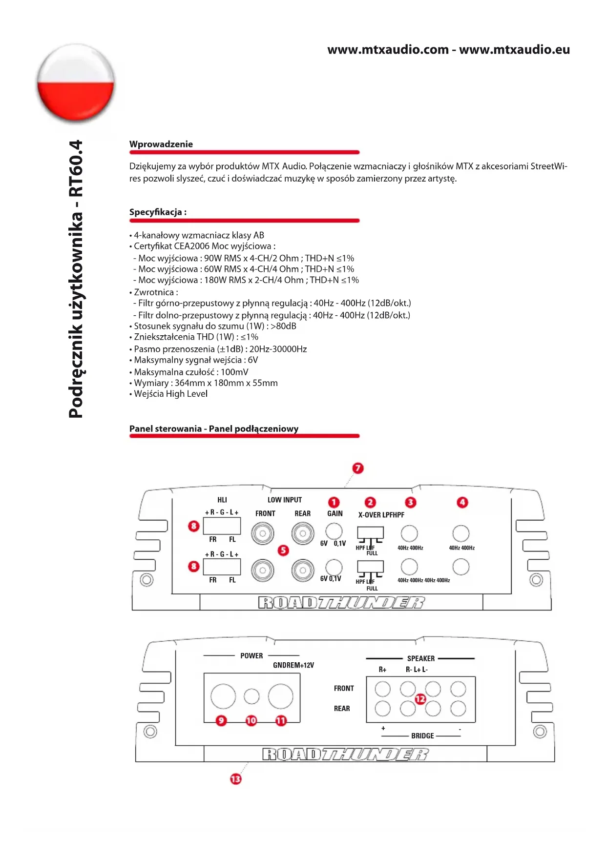 - Ustaw potencjometr w pozycji „FULL” aby wyłączyć zwrotnice. Regulacja ltra górno-przepustowego (HPF) : Częstotliwośc może być regulowana w zakresie od 40 do 400Hz Regulacja ltra dolno-przepustowego (LPF) : Częstotliwość może być regulowana w zakresie od 40Hz do 400Hz Złącze RCA (LOW INPUT) : podłącz jednostke sterująca do wzmacniacza za pomocą kabli sygnałowych RCA. Mini- malna wartość sygnału wyjściowego jednostki sterującej to 100mV. Zawsze używaj wysokiej jakości ekranowa- nych przewodów sygnałowych by wyeliminować zakłócenia. Zasilanie: wzmacniacz jest włączony : dioda LED świeci na czerwono. Jeśli nastąpiło zwarcie lub przegrzanie wzmacniacza - dioda LED miga. Wejścia High Level (HLI) : Pozwala na podłączenie wzmacniacza bez konieczności stosowania przewodów sygna- łowych. Użyj dołączonych adapterów aby podłączyć jednostkę sterującą do wzmacniacza za pomocą wejścia High Level. Uwaga: W trybie High Level konieczne jest podłączenie przewodu wzbudzenia wzmacniacza (remote). Złącze zasilania (+12V) : jest główne źródło zasilania wzmacniacza i musi być bezpośrednio podłączone do dodatniej klemy akumulatora. Zwróć uwagę na prawidłowe ułożenie przewodu zasilającego w samochodzie. Unikaj układania przewodu wraz z kablami sygnałowymi, antenowymi lub w pobliżu innego sprzętu elektronicz- nego. Ważne jest również korzystanie z wysokiej jakości przewodów o odpowiednim przekroju. Do zasialania wzmacniacza MTX RT60.4 zaleca się uzywanie przewodów o przekroju 10mm2. Terminal wzbudzenia wzmacniacza (Remote - REM) : wzmacniacz może zostać uruchomiony przez ten terminal po zasileniu napięciem 12V. Napięcie 12V dostarczne jest z gniazda „remote” bądź z przewodu sterowania anteną elektryczną jednostki sterującej. Złącze (GND) : do prawidłowego podłączenia masy użyj krótkiego przewodu o identycznym przekroju jak prze- wód zasilający. Usuń lakier w miejscu podłączenia masy do elementu karoserii samochodu aby uzyskać optymal- ne przewodzenie. Właściwie wykonane uziemienie wpływa znacząco na wydajność wzmacniacza. Złącza głośnikowe (SPEAKER) : podłącz do nich przewody głośnikowe. Kontroluj prawidłowość połączeń w całym systemie. Nieprawidłowe podłączenie przewodów spowoduje niewłaściwą pracę głośnika i utratę jakości dźwię- ku. Do mostkowania wzmacniacza użyj prawego (+) terminala oraz lewego (-) ! Ostrzeżenie : Nie mostkuj wzmacniacza o oporności mniejszej niż 4Ω. Bezpieczniki (FUSE) : spalony bezpiecznik zastąp nowym o tej samej wartości. Nigdy nie używaj bezpiecznika o większym natężeniu. Uwaga : bezpieczniki znajdują się na spodzie wzmacniaczawww.mtxaudio.com - www.mtxaudio.eu Podręcznik użytkownika - RT60.4 Montaż i podłączanie Rekomendujemy instalacje wzmacniaczy RoadTHUNDER u autoryzowanego sprzedawcy produktów MTX Audio. Nieprawidłowe podłączenie może spowodować poważne uszkodzenie wzmacniacza, głośnika lub instalacji elek- trycznej w samochodzie. Przed uruchomieniem systemu ponownie sprawdź poprawność wszystkich połączeń.