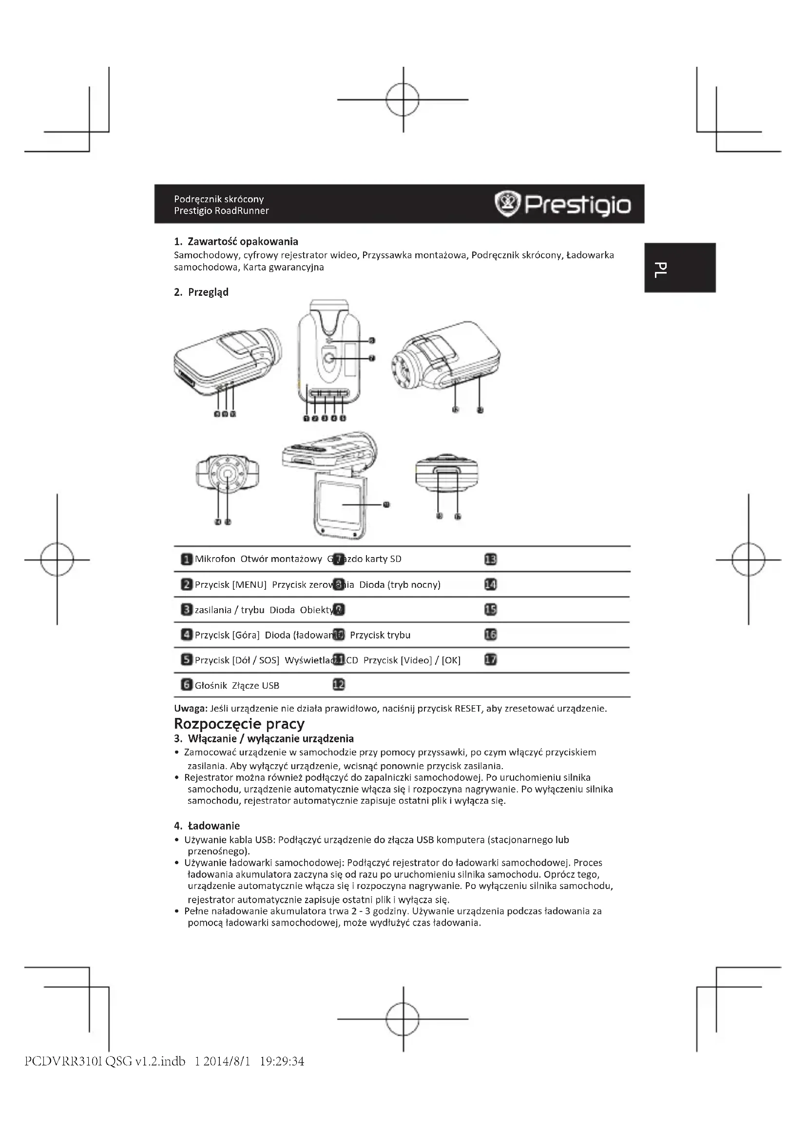 - Wykrycie ruchu: Aby włączyć tę funkcję, w trybie gotowości wcisnąć przycisk [Menu]. Urządzenie automatycznie rozpocznie nagrywanie po wykryciu ruchu i zakończy gdy ruch nie jest wykrywany. PCDVRR310I QSG v1.2.indb 2 2014/8/1 19:29:34Podręcznik skrócony Prestigio RoadRunner