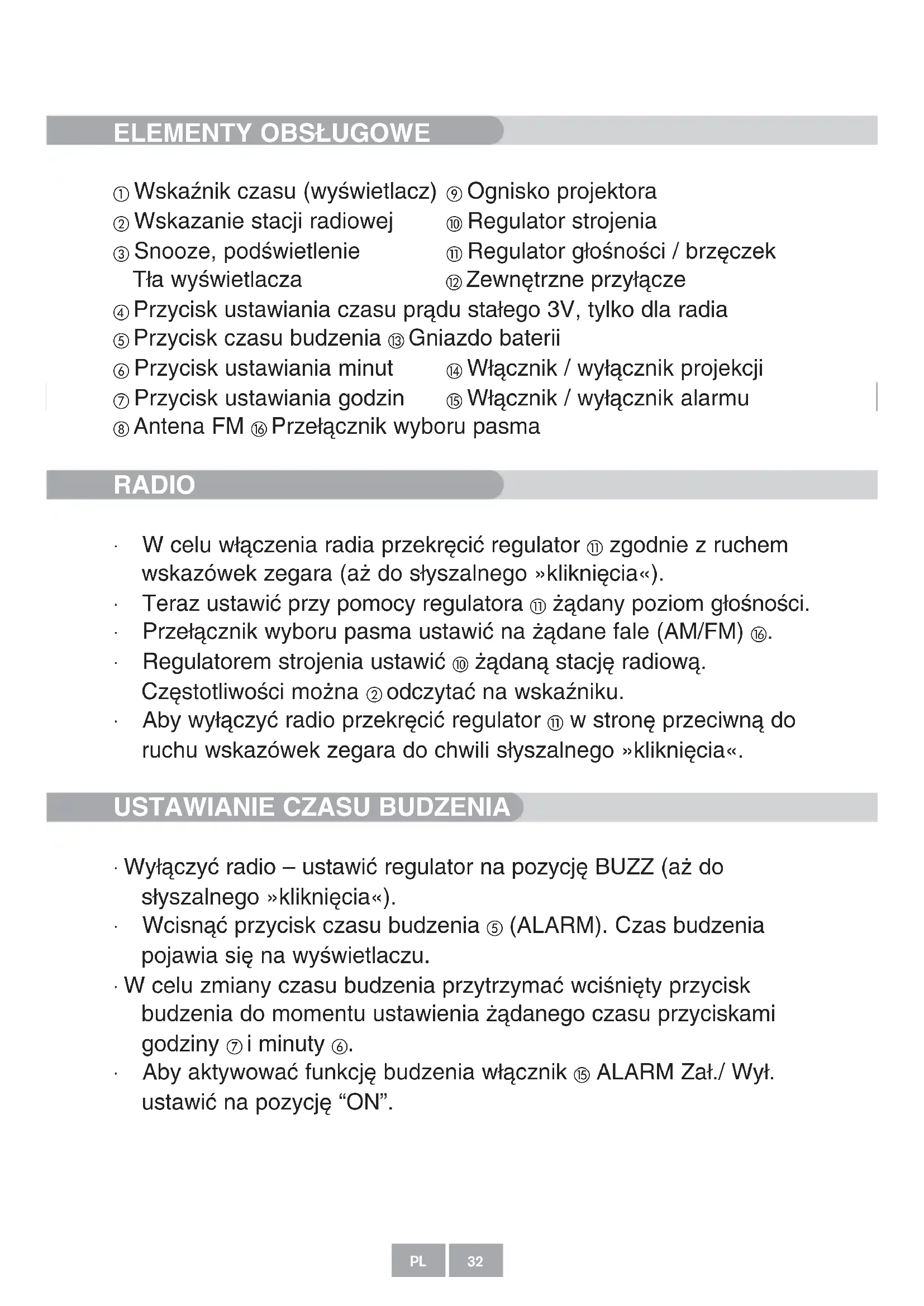 - ¢ı˘Óı›Ù ÛÙËÓ ·ÚÌfi‰È· ¤ÓˆÛË Û˘ÏÏÔÁ‹˜ ·ÔÚÚÈÌ̿وÓ. 31GR Manual Projektionsuhr pt9 01.12.2003 14:49 Uhr Seite 31ELEMENTY OBS¸UGOWE Wskaênik czasu (wyÊwietlacz) Ognisko projektora Wskazanie stacji radiowej Regulator strojenia Snooze, podÊwietlenie Regulator g∏oÊnoÊci / brz´czek T∏a wyÊwietlacza Zewn´trzne przy∏àcze Przycisk ustawiania czasu pràdu sta∏ego 3V, tylko dla radia Przycisk czasu budzenia Gniazdo baterii Przycisk ustawiania minut W∏àcznik / wy∏àcznik projekcji Przycisk ustawiania godzin W∏àcznik / wy∏àcznik alarmu Antena FM Prze∏àcznik wyboru pasma RADIO
