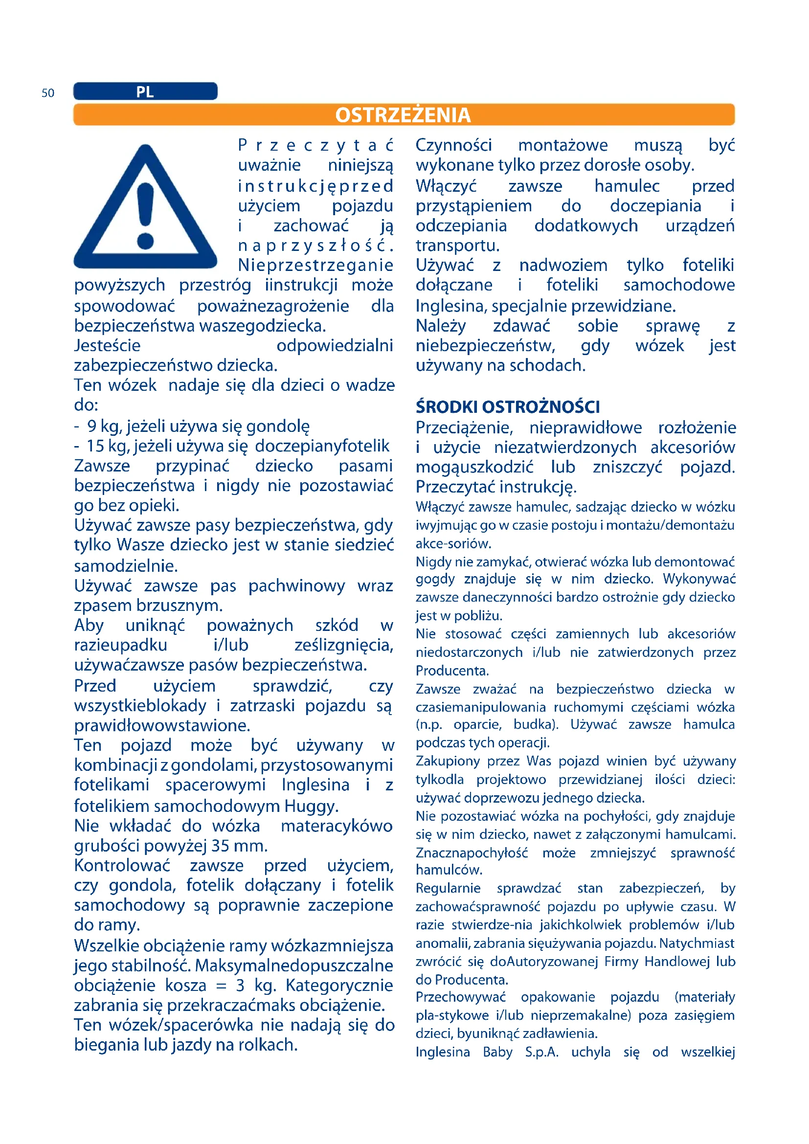 Przeczytać uważnie niniejszą instrukcjęprzed użyciem pojazdu i zachować ją naprzyszłość. Nieprzestrzeganie powyższych przestróg iinstrukcji może spowodować poważnezagrożenie dla bezpieczeństwa waszegodziecka. Jesteście odpowiedzialni zabezpieczeństwo dziecka. Ten wózek nadaje się dla dzieci o wadze do: - 9 kg, jeżeli używa się gondolę - 15 kg, jeżeli używa się doczepianyfotelik Zawsze przypinać dziecko pasami bezpieczeństwa i nigdy nie pozostawiać go bez opieki. Używać zawsze pasy bezpieczeństwa, gdy tylko Wasze dziecko jest w stanie siedzieć samodzielnie. Używać zawsze pas pachwinowy wraz zpasem brzusznym. Aby uniknąć poważnych szkód w razieupadku i/lub ześlizgnięcia, używaćzawsze pasów bezpieczeństwa. Przed użyciem sprawdzić, czy wszystkieblokady i zatrzaski pojazdu są prawidłowowstawione. Ten pojazd może być używany w kombinacji z gondolami, przystosowanymi fotelikami spacerowymi Inglesina i z fotelikiem samochodowym Huggy. Nie wkładać do wózka materacykówo grubości powyżej 35 mm. Kontrolować zawsze przed użyciem, czy gondola, fotelik dołączany i fotelik samochodowy są poprawnie zaczepione do ramy. Wszelkie obciążenie ramy wózkazmniejsza jego stabilność. Maksymalnedopuszczalne obciążenie kosza = 3 kg. Kategorycznie zabrania się przekraczaćmaks obciążenie. Ten wózek/spacerówka nie nadają się do biegania lub jazdy na rolkach. Czynności montażowe muszą być wykonane tylko przez dorosłe osoby. Włączyć zawsze hamulec przed przystąpieniem do doczepiania i odczepiania dodatkowych urządzeń transportu. Używać z nadwoziem tylko foteliki dołączane i foteliki samochodowe Inglesina, specjalnie przewidziane. Należy zdawać sobie sprawę z niebezpieczeństw, gdy wózek jest używany na schodach.