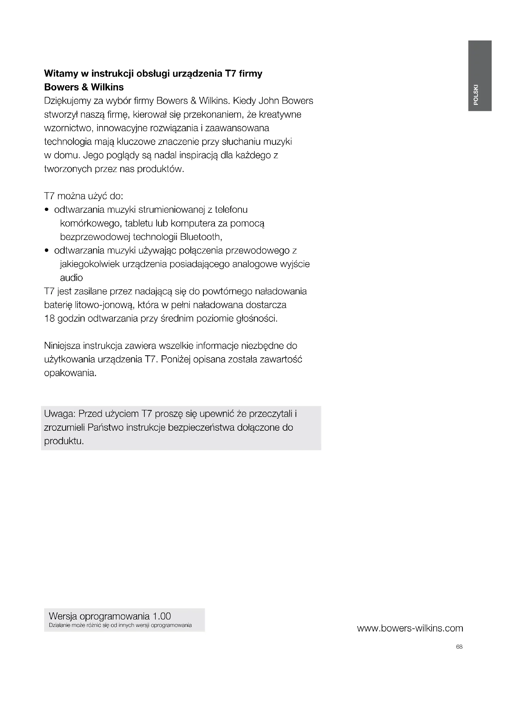 POLSKI www.bowers-wilkins.com Witamy w instrukcji obsługi urządzenia T7 rmy Bowers & Wilkins Dziękujemy za wybór rmy Bowers & Wilkins. Kiedy John Bowers stworzył naszą rmę, kierował się przekonaniem, że kreatywne wzornictwo, innowacyjne rozwiązania i zaawansowana technologia mają kluczowe znaczenie przy słuchaniu muzyki w domu. Jego poglądy są nadal inspiracją dla każdego z tworzonych przez nas produktów. T7 można użyć do: