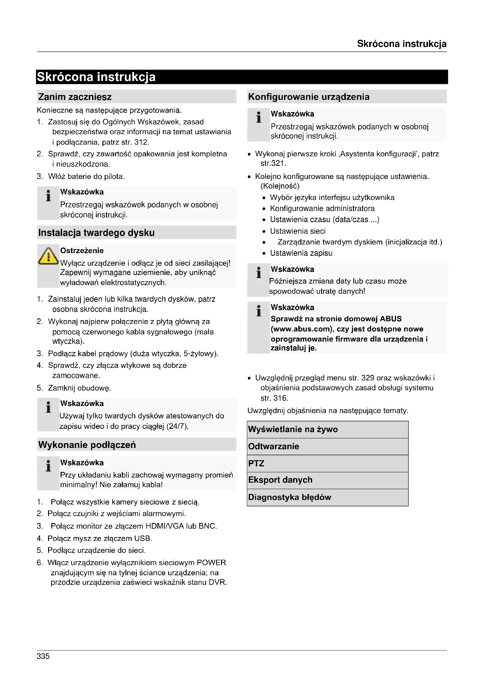 i Przestrzegaj wskazówek podanych w osobnej skróconej instrukcji oraz na płycie CD lub w załączonej dokumentacji w zakresie „Sterowania przez interfejs WWW” oraz „Oprogramowania”. Znajdziesz je w Internecie pod adresem www.abus.com.