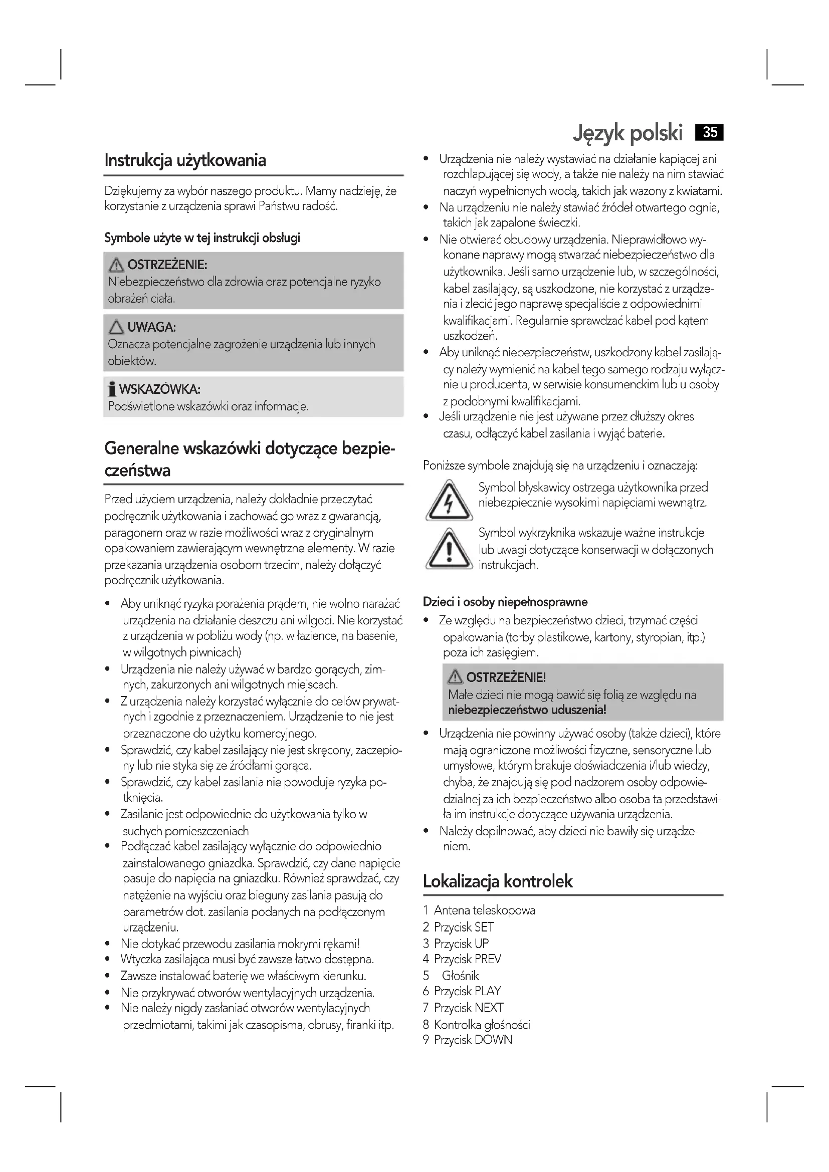 - Należydopilnować,abydzieciniebawiłysięurządze- niem. Lokalizacja kontrolek 1 Antena teleskopowa 2 Przycisk SET 3 Przycisk UP 4 Przycisk PREV 5 Głośnik 6 Przycisk PLAY 7 Przycisk NEXT 8 Kontrolka głośności 9 Przycisk DOWNJęzyk polski