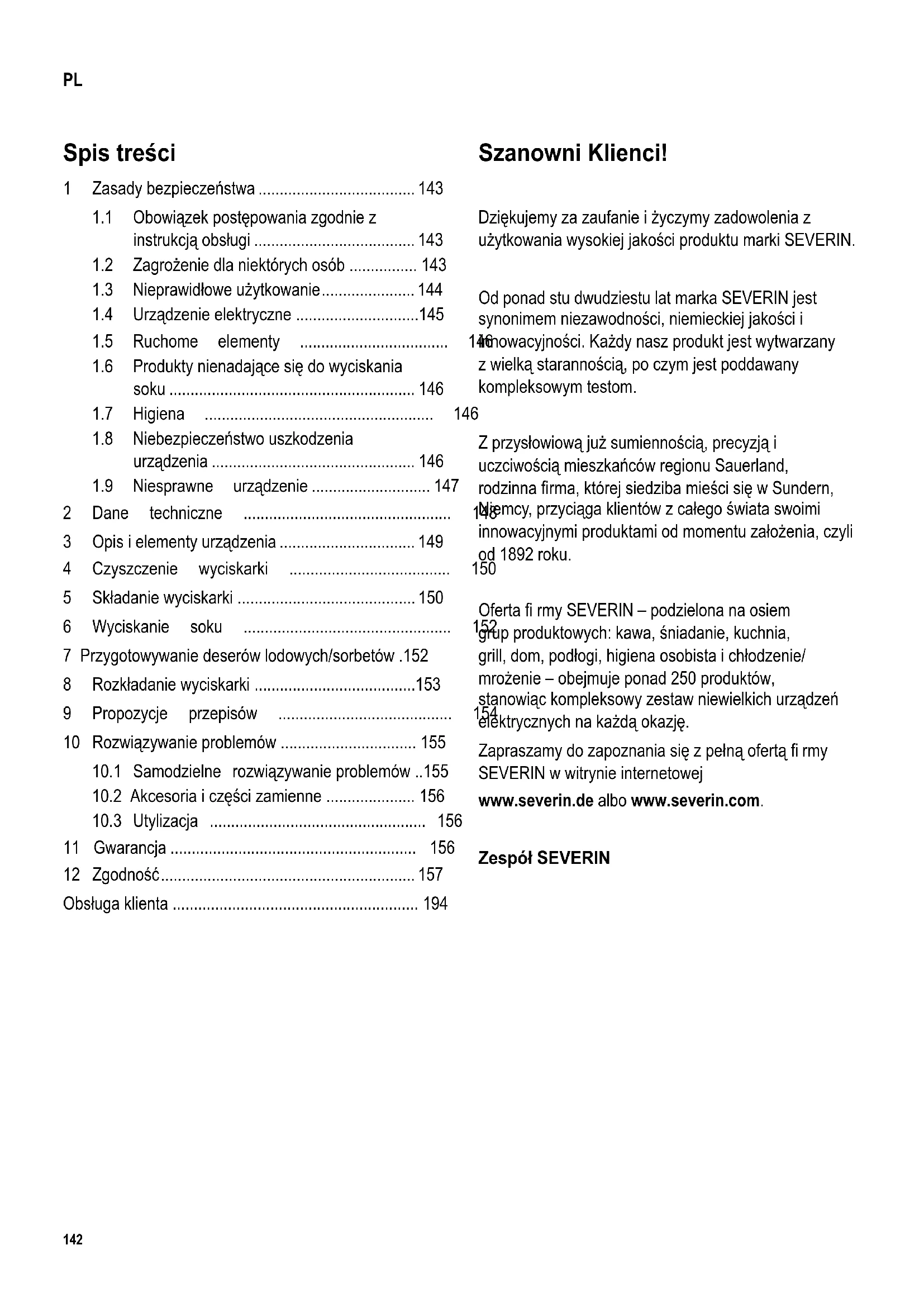 - Urządzenie nie zawiera żadnych komponentów, które użytkownik mógłby samodzielnie konserwować lub naprawiać. Wszelkie naprawy mogą być wykonywane wyłą cznie przez Serwis fi rmy SEVERIN (zob. punkt „Obsługa klienta” na stronie 194).148