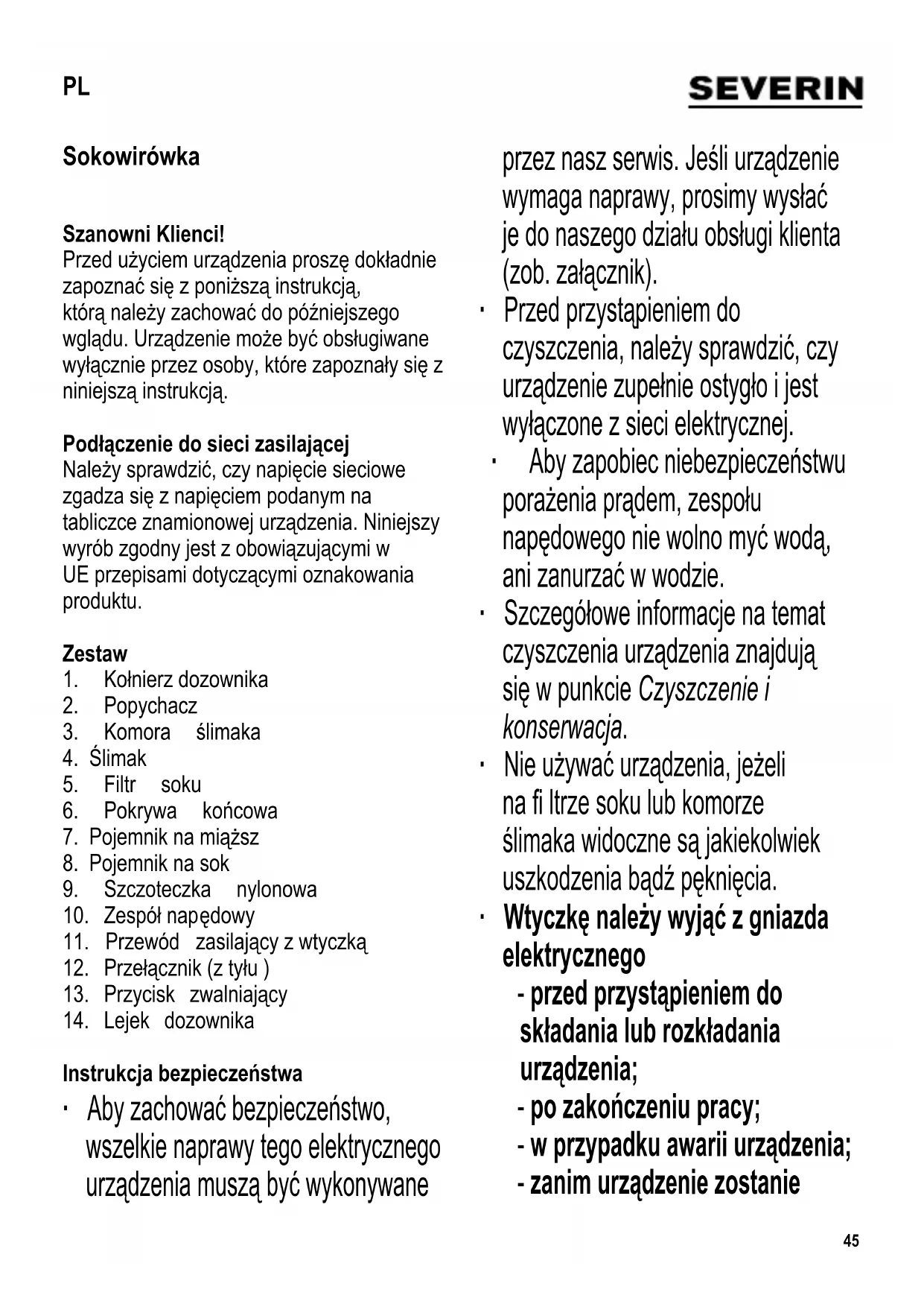 Instrukcja bezpieczeństwa ∙ Aby zachować bezpieczeństwo, wszelkie naprawy tego elektrycznego urządzenia muszą być wykonywane przez nasz serwis. Jeśli urządzenie wymaga naprawy, prosimy wysłać je do naszego działu obsługi klienta (zob. załącznik). ∙ Przed przystąpieniem do czyszczenia, należy sprawdzić, czy urządzenie zupełnie ostygło i jest wyłączone z sieci elektrycznej. ∙ Aby zapobiec niebezpieczeństwu porażenia prądem, zespołu napędowego nie wolno myć wodą, ani zanurzać w wodzie. ∙ Szczegółowe informacje na temat czyszczenia urządzenia znajdują się w punkcie Czyszczenie i konserwacja. ∙ Nie używać urządzenia, jeżeli na fi ltrze soku lub komorze ślimaka widoczne są jakiekolwiek uszkodzenia bądź pęknięcia. ∙ Wtyczkę należy wyjąć z gniazda elektrycznego - przed przystąpieniem do składania lub rozkładania urządzenia; - po zakończeniu pracy; - w przypadku awarii urządzenia; - zanim urządzenie zostanie PL46 pozostawione bez nadzoru; - przed przystąpieniem do czyszczenia urządzenia. ∙ Ostrzeżenie: Nieprawidłowe użytkowanie urządzenia może doprowadzić do poważnych obrażeń ciała. ∙ Urządzenie przeznaczone jest do zastosowań domowych lub podobnych, jak np. w - sklepach, biurach i innych podobnych miejscach pracy – przez pracowników; - agroturystyce; - hotelach, motelach itp. oraz innych podobnych lokalach (przez klientów); - pensjonatach. ∙ Osoby o ograniczonych zdolnościach fi zycznych, czuciowych lub psychicznych albo nieposiadające stosownego doświadczenia lub wiedzy, mogą korzystać z urządzenia tylko wówczas, kiedy znajdują się pod nadzorem lub zostały poinstruowane, jak używać urządzenia i są w pełni świadome wszelkich zagrożeń i wymaganych środków ostrożności. ∙ Nie dopuszczać do używania urządzenia przez dzieci. Nie dopuszczać dzieci w pobliże urządzenia lub jego przewodu zasilającego. ∙ Nie dopuszczać do używania urządzenia jako zabawki przez dzieci. ∙ Ostrzeżenie: Nie pozwalać, aby dzieci miały dostęp do elementów opakowania, ponieważ może to doprowadzić do niebezpiecznego wypadku, np. uduszenia. ∙ Przed użyciem należy dokładnie sprawdzić, czy główny korpus urządzenia i wszystkie elementy czynnościowe są sprawne i nie noszą śladów uszkodzenia. Jeżeli urządzenie np. spadło na twardą powierzchnię albo przewód zasilający został narażony na zbyt silne szarpnięcie, nie nadaje się ono do dalszego użytku: nawet najmniejsza, niewidoczna usterka powstała z tego powodu, może mieć ujemny wpływ na działanie urządzenia i bezpieczeństwo użytkownika. ∙ Nie zostawiać urządzenia podłączonego do zasilania bez nadzoru. ∙ Bezpieczeństwo korzystania z urządzenia wymaga, by do dociskania produktów wprowadzonych do lejka dozownika bezwzględnie używać popychacza. W żadnym wypadku nie wolno do tego celu używać palców. ∙ Po wyłączeniu silnik jeszcze przez chwilę będzie się obracać. Przed otwarciem urządzenia zawsze należy odczekać, aż47 silnik całkowicie się zatrzyma. ∙ Urządzenie oraz przewód zasilający nie powinny stykać się z gorącymi powierzchniami, ani być poddawane działaniu wysokich temperatur. ∙ Wyjmując wtyczkę z gniazdka nigdy nie należy szarpać za przewód. Nie należy pozostawiać przewodu zasilającego swobodnie zwisającego bez nadzoru. ∙ Za szkody wynikłe z nieprawidłowego używania sprzętu lub użytkowania niezgodnego z instrukcją obsługi winę ponosi wyłącznie użytkownik. Porady dotyczące odwirowywania soku ∙ Do odwirowywania soku nadają się niemal wszystkie popularne owoce, a więc jabłka, gruszki, śliwki, truskawki, winogrona, pomarańcze, melony, kiwi, ananasy, mango czy papaje. ∙ Do wydajnego odwirowywania soku nadają si ę również marchew, kalarepa, seler oraz ogórek. Można też przetwarzać szpinak, rukolę oraz różne gatunki sałaty. ∙ Na przykład jabłka, marchewki, ogórki i selery dają bardzo pożywny sok. ∙ Doskonały sok na śniadanie można zrobić z grejpfruta, marchewek i jabłek. ∙ Banany nie nadają się do sokowirówki, ponieważ zawierają bardzo niewiele soku. ∙ Umyć owoce lub warzywa, po czym pokroić je w większe kawałki i usunąć pestki lub nasiona, aby nie dopuścić do uszkodzenia urządzenia. ∙ Aby uzyskać więcej soku, twarde owoce i warzywa, jak np. marchew, koper włoski czy kalarepa, można pokroić w mniejsze kawałki. Krótki okres nieprzerwanej pracy Urządzenie nie jest przeznaczone do pracy