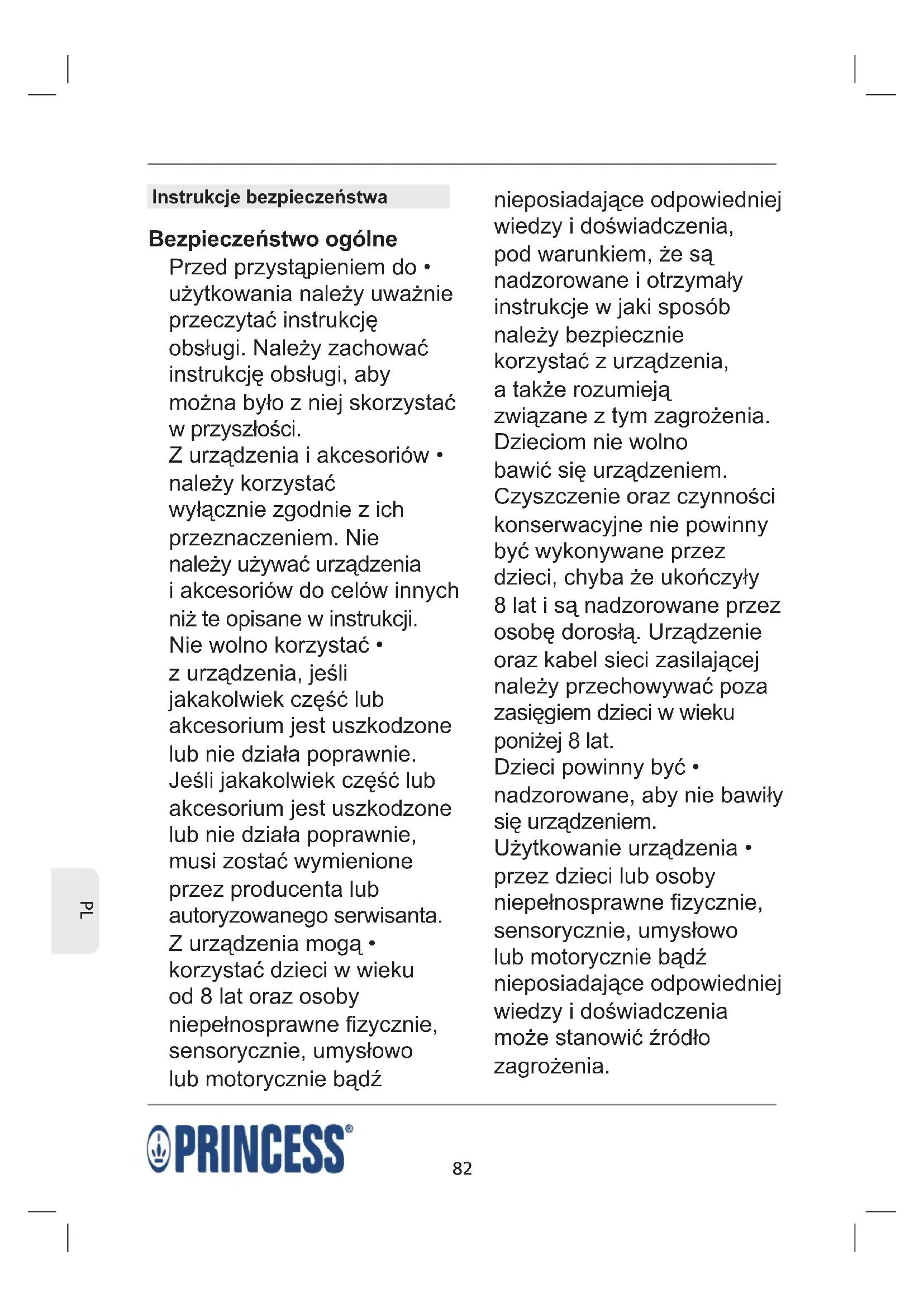 Instrukcje bezpieczeństwa Bezpieczeństwo ogólne Przed przystąpieniem do • użytkowania należy uważnie przeczytać instrukcję obsługi. Należy zachować instrukcję obsługi, aby można było z niej skorzystać w przyszłości. Z urządzenia i akcesoriów • należy korzystać wyłącznie zgodnie z ich przeznaczeniem. Nie należy używać urządzenia i akcesoriów do celów innych niż te opisane w instrukcji. Nie wolno korzystać • z urządzenia, jeśli jakakolwiek część lub akcesorium jest uszkodzone lub nie działa poprawnie. Jeśli jakakolwiek część lub akcesorium jest uszkodzone lub nie działa poprawnie, musi zostać wymienione przez producenta lub autoryzowanego serwisanta. Z urządzenia mogą • korzystać dzieci w wieku od 8 lat oraz osoby niepełnosprawne fizycznie, sensorycznie, umysłowo lub motorycznie bądź nieposiadające odpowiedniej wiedzy i doświadczenia, pod warunkiem, że są nadzorowane i otrzymały instrukcje w jaki sposób należy bezpiecznie korzystać z urządzenia, a także rozumieją związane z tym zagrożenia. Dzieciom nie wolno bawić się urządzeniem. Czyszczenie oraz czynności konserwacyjne nie powinny być wykonywane przez dzieci, chyba że ukończyły 8 lat i są nadzorowane przez osobę dorosłą. Urządzenie oraz kabel sieci zasilającej należy przechowywać poza zasięgiem dzieci w wieku poniżej 8 lat. Dzieci powinny być • nadzorowane, aby nie bawiły się urządzeniem. Użytkowanie urządzenia • przez dzieci lub osoby niepełnosprawne fizycznie, sensorycznie, umysłowo lub motorycznie bądź nieposiadające odpowiedniej wiedzy i doświadczenia może stanowić źródło zagrożenia.83