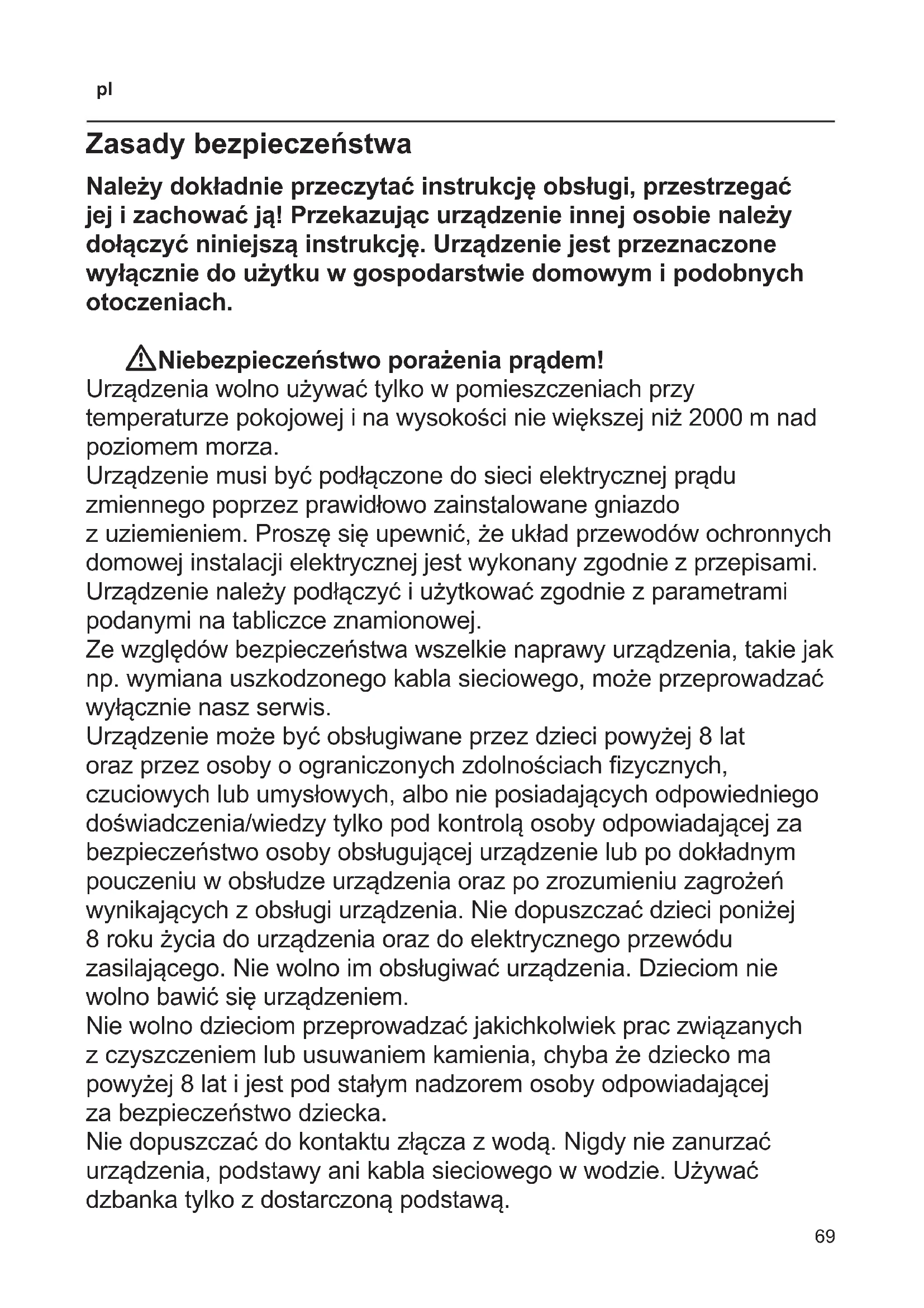 Zasady bezpieczeństwa Należy dokładnie przeczytać instrukcję obsługi, przestrzegać jej i zachować ją! Przekazując urządzenie innej osobie należy dołączyć niniejszą instrukcję. Urządzenie jest przeznaczone wyłącznie do użytku w gospodarstwie domowym i podobnych otoczeniach. WNiebezpieczeństwo porażenia prądem! Urządzenia wolno używać tylko w pomieszczeniach przy temperaturze pokojowej i na wysokości nie większej niż 2000 m nad poziomem morza. Urządzenie musi być podłączone do sieci elektrycznej prądu zmiennego poprzez prawidłowo zainstalowane gniazdo z uziemieniem. Proszę się upewnić, że układ przewodów ochronnych domowej instalacji elektrycznej jest wykonany zgodnie z przepisami. Urządzenie należy podłączyć i użytkować zgodnie z parametrami podanymi na tabliczce znamionowej. Ze względów bezpieczeństwa wszelkie naprawy urządzenia, takie jak np. wymiana uszkodzonego kabla sieciowego, może przeprowadzać wyłącznie nasz serwis. Urządzenie może być obsługiwane przez dzieci powyżej 8 lat oraz przez osoby o ograniczonych zdolnościach zycznych, czuciowych lub umysłowych, albo nie posiadających odpowiedniego doświadczenia/wiedzy tylko pod kontrolą osoby odpowiadającej za bezpieczeństwo osoby obsługującej urządzenie lub po dokładnym pouczeniu w obsłudze urządzenia oraz po zrozumieniu zagrożeń wynikających z obsługi urządzenia. Nie dopuszczać dzieci poniżej 8 roku życia do urządzenia oraz do elektrycznego przewódu zasilającego. Nie wolno im obsługiwać urządzenia. Dzieciom nie wolno bawić się urządzeniem. Nie wolno dzieciom przeprowadzać jakichkolwiek prac związanych z czyszczeniem lub usuwaniem kamienia, chyba że dziecko ma powyżej 8 lat i jest pod stałym nadzorem osoby odpowiadającej za bezpieczeństwo dziecka. Nie dopuszczać do kontaktu złącza z wodą. Nigdy nie zanurzać urządzenia, podstawy ani kabla sieciowego w wodzie. Używać dzbanka tylko z dostarczoną podstawą.