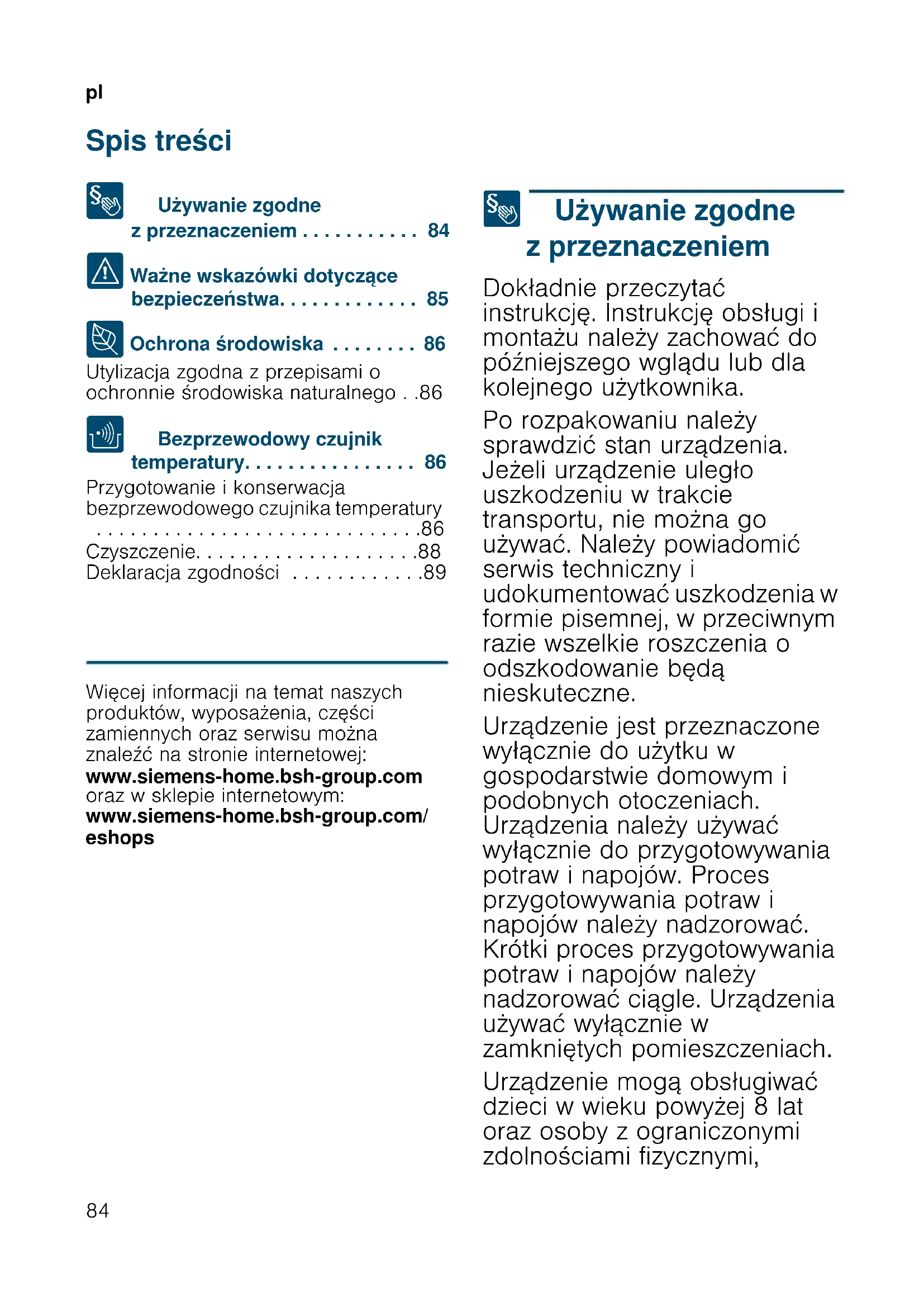- Spis treści plInstrukcja obsługi 8 Używanie zgodne z przeznaczeniem p. 84