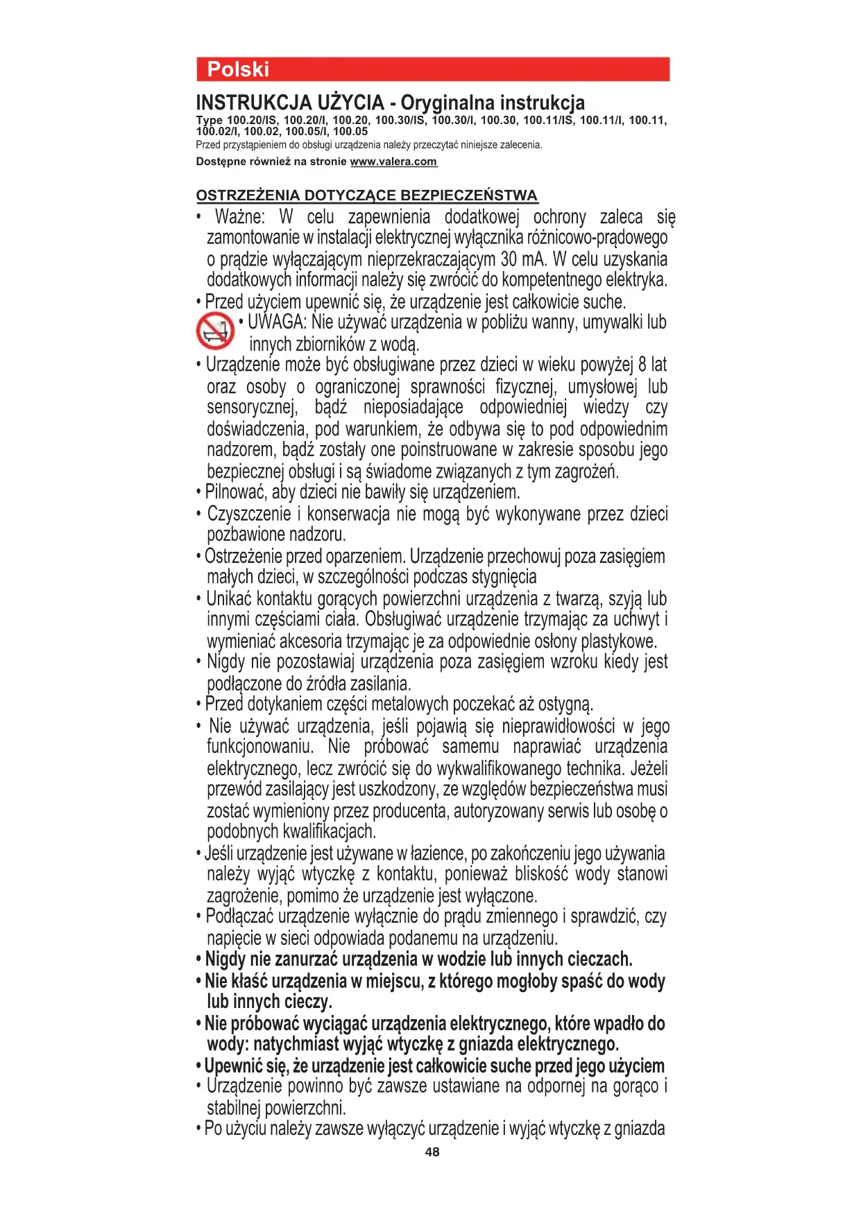 jeszcze ciepłe włosy, zamykając ich łuski i usuwając nadmiar ciepła, co pozwala utrwalić ich ułożenie. Zamontować nakładkę na urządzeniu, tak jak pokazano na rys. 2. Postępować zgodnie z instrukcjami pokazanymi na rys. 3 i 4. VALERA jest zastrzezonym znakiem towarowym firmy Ligo Electric SA - Szwajcaria Symbol na produkcie lub opakowaniu oznacza, że tego produktu nie wolno traktować, tak jak innych odpadów domowych. Należy oddać go do właściwego punktu skupu surowców wtórnych zajmującego się złomowanym sprzętem elektrycznym i elektronicznym. Właściwa utylizacja i złomowanie pomaga w eliminacji niekorzystnego wpływu złomowanych produktów na naturalne środowisko oraz zdrowie. Aby uzyskać szczegółowe dane dotyczące możliwości recyklingu niniejszego urządzenia, należy skontaktować się z lokalnym Urzędem Miasta, służbami oczyszczania miasta lub sklepem, w którym produkt został zakupiony. 00060777 int 2018_12_Layout 1 05/02/2019 16:45 Pagina 5051 ΟΔΗΓΙΕΣ ΧΡΗΣΗΣ - Πρωτότυπες οδηγίες Τύπος 100.20/IS, 100.20/I, 100.20, 100.30/IS, 100.30/I, 100.30, 100.11/IS, 100.11/I, 100.11, 100.02/I, 100.02, 100.05/I, 100.05 Διαβάστε προσεκτικά τις οδηγίες αυτές πριν χρησιμοποιήσετε τη συσκευή. Τα προϊόντα είναι επίσης διαθέσιμα στην ιστοσελίδα www.valera.com ΟΔΗΓΙΕΣ ΑΣΦΑΛΕΙΑΣ