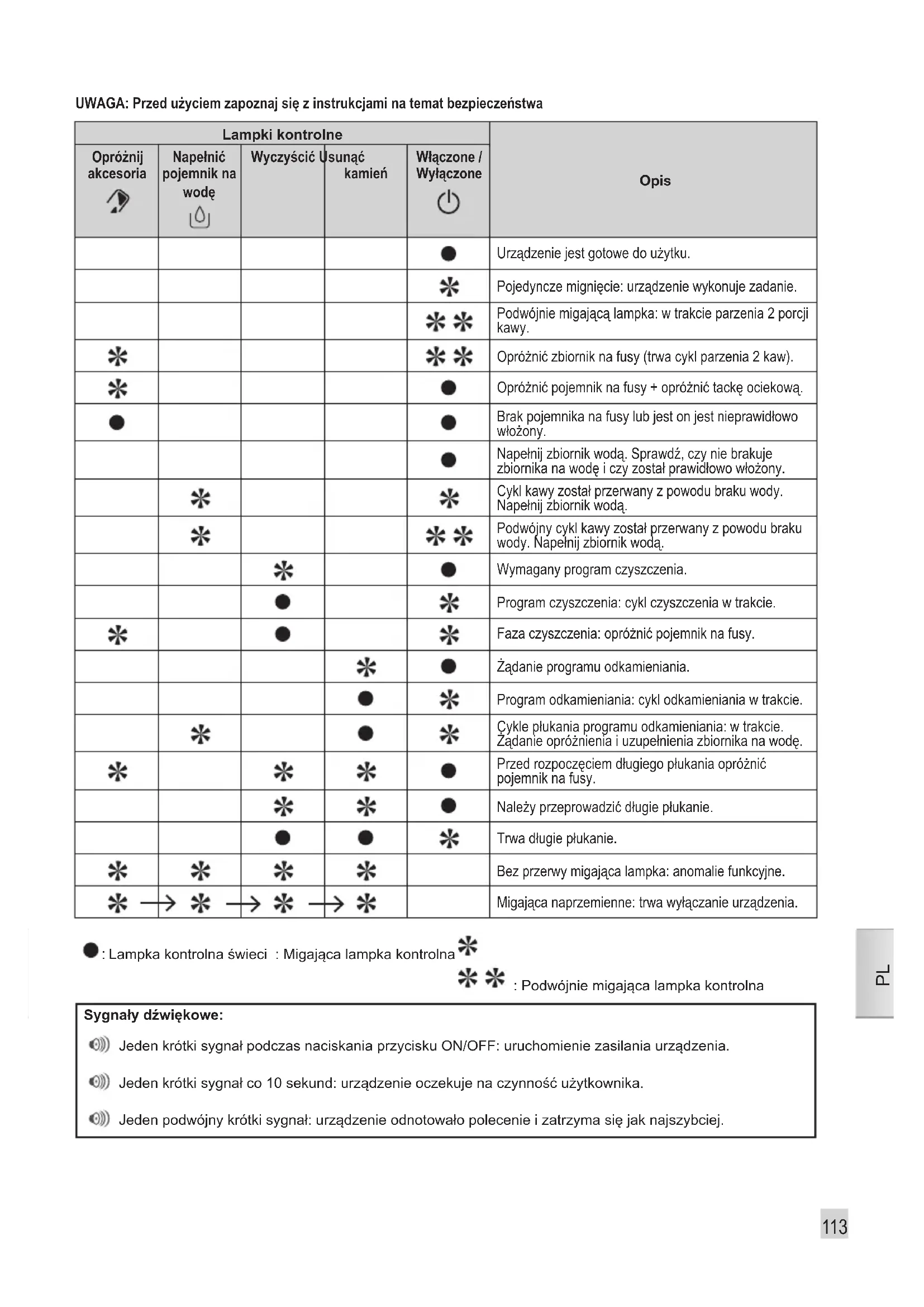 Niebezpieczeństwo: Ostrzeżenie przed zagrożeniem poważnymi lub śmiertelnymi obrażeniami ciała. Symbol błyskawicy ostrzega przez niebezpieczeństwem związanym z obecnością prądu elektrycznego. Uwaga: Ostrzeżenie przed ewentualnym doprowadzeniem do nieprawidłowego działania, uszkodzenia lub zniszczenia urządze- nia. Ważne: Uwaga ogólna lub ważna dla działania urządzenia. Piktogramy i sygnały ostrzegawcze Opróżnić pojemnik na fusy po kawie i tackę ociekową: jeśli pojemnik na fusy nie zostanie prawidłowo wsunięty lub jeśli zostanie włożony na miejsce zanim miną 4 sekundy, kontrolka będzie się nadal świecić. Napełnić zbiornik wody Ustawienie grubości mielenia ziaren kawy CLEAN Przeprowadzić czyszczenie Standard kawa mocna CALC Przeprowadzić odkamienianie Przycisk pary CLEAN + CALC Przeprowadzić płukanie długie Płukanie/konserwacja115