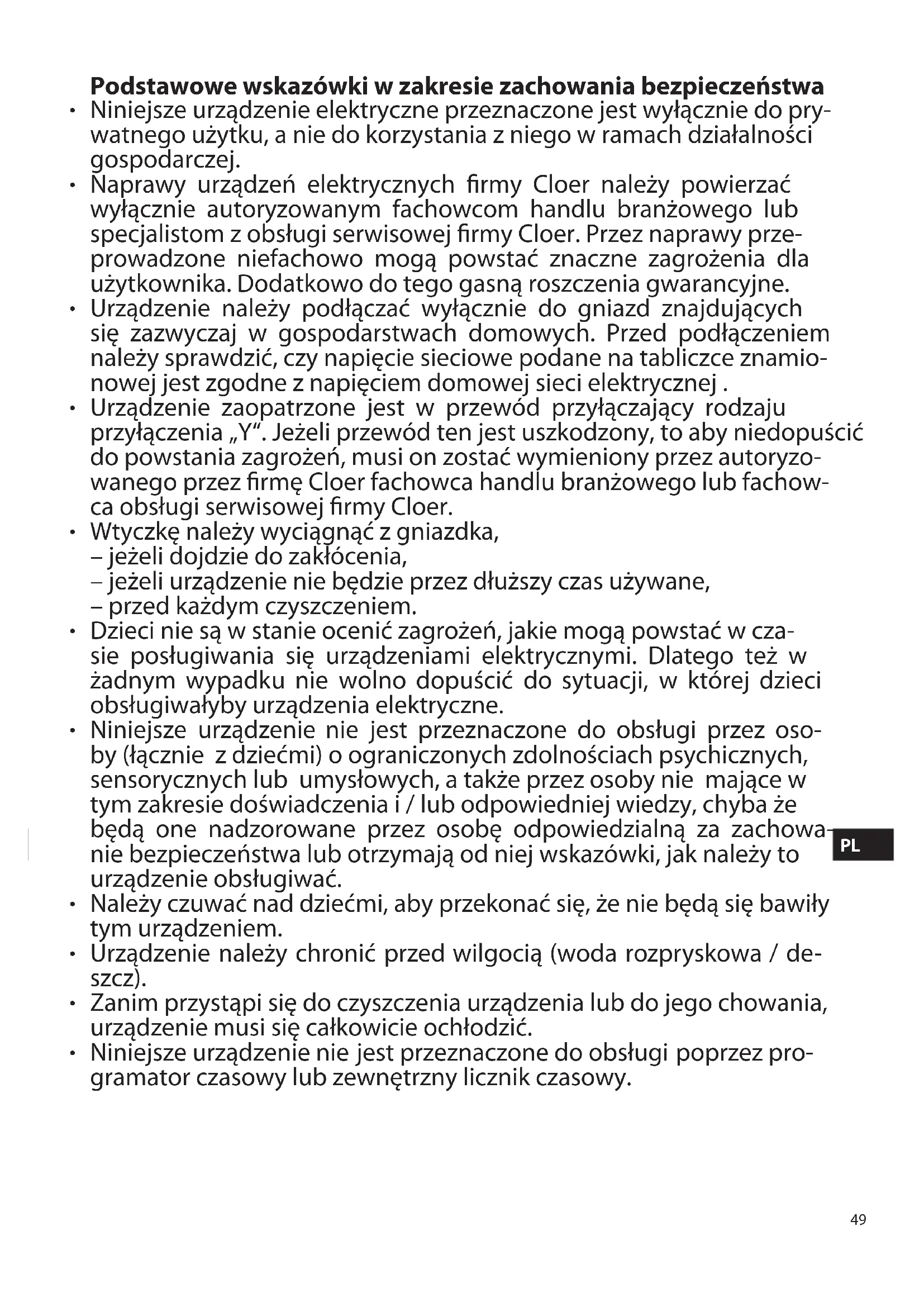 - Urzadzenia zaopatrzone jest w przyłączajcy rodzaju przyłączenia „Y". Jeźeli przyȩd ten jest uszkodzony, to aby niedopusuści do powstania zagrożen, musi on zostac wymiemeny przyez autoryzanego przyez firmę Cloer fachowca handlu branżowej lub fachowa obstrugi serwisowejfirmy Cloer.