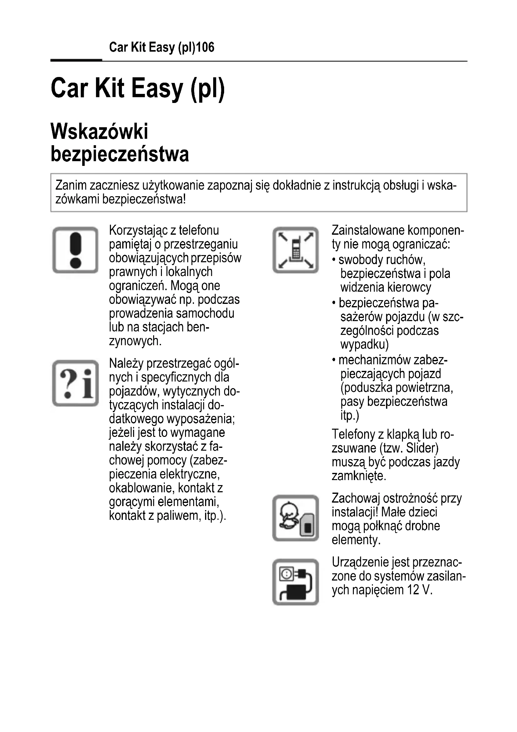 - Držáky na výměnu Produkty lze zakoupit v odborných prodejnách nebo v internetovém obchodě na adrese: V zemích, v nichž není produkt prodáván autorizovanými prodejci, nejsou nabízeny servisní služby (výměna, příp. oprava přístroje). Napájení 10,8 V až 16 V Spotřeba proudu max. 1 A / max. 1 mA (v klidu) Provozní teplota ÷20 °C až +55 °C Výkon reproduktoru max. 1,3 W Siemens Original Accessories www.siemens- mobile.com/shopCar Kit Easy (pl)106 Car Kit Easy (pl) Wskazówki bezpieczeństwa Zanim zaczniesz użytkowanie zapoznaj się dokładnie z instrukcją obsługi i wska- zówkami bezpieczeństwa! Korzystając z telefonu pamiętaj o przestrzeganiu obowiązujących przepisów prawnych i lokalnych ograniczeń. Mogą one obowiązywać np. podczas prowadzenia samochodu lub na stacjach ben- zynowych. Należy przestrzegać ogól- nych i specyficznych dla pojazdów, wytycznych do- tyczących instalacji do- datkowego wyposażenia; jeżeli jest to wymagane należy skorzystać z fa- chowej pomocy (zabez- pieczenia elektryczne, okablowanie, kontakt z gorącymi elementami, kontakt z paliwem, itp.). Zainstalowane komponen- ty nie mogą ograniczać: