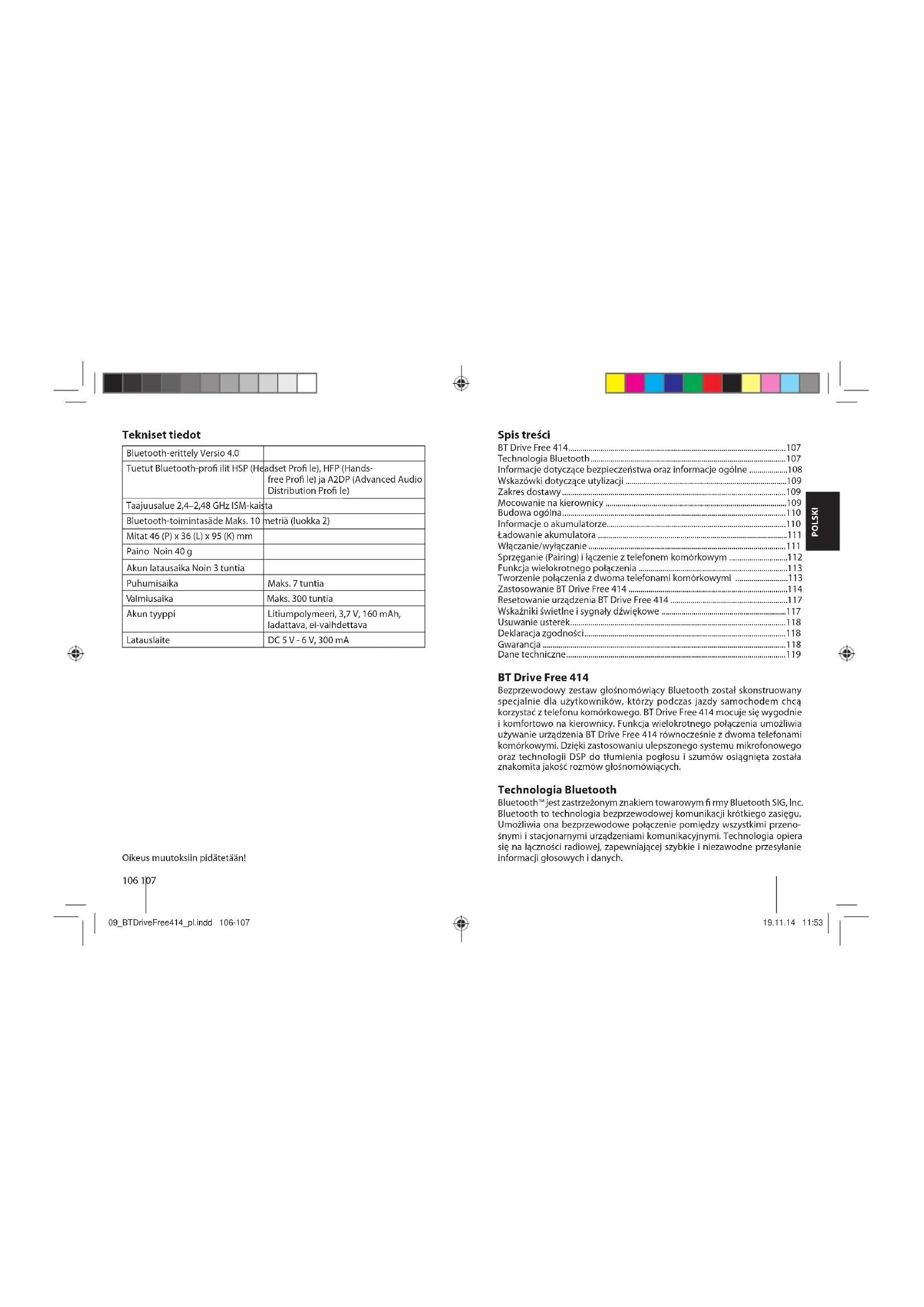 almiusaika Maks. 300 tuntia Akun tyyppi Litiumpolymeeri, 3,7 V, 160 mAh, ladattava, ei-vaihdettava Latauslaite DC 5 V - 6 V, 300 mA Oikeus muutoksiin pidätetään! 09_BTDriveFree414_pl.indd 106-10709_BTDriveFree414_pl.indd 106-107 19.11.14 11:5319.11.14 11:53108 109 POLSKI Technologia Bluetooth korzysta z dostępnego na całym świecie pasma ISM (Industrial Scienti c & Medical). W paśmie ISM (2,4 GHz do 2,48 GHz) trans- misja Bluetooth przełącza się z prędkością 1600 zmian na sekundę pomiędzy 79 różnymi kanałami w zasięgu do ok. 10 metrów (klasa 2). Informacje dotyczące bezpieczeństwa oraz informacje ogólne – Należy uważnie przeczytać instrukcję obsługi i stosować się do zawartych w niej wskazówek. – Należy przestrzegać lokalnych przepisów dotyczących używania telefonów komórkowych i zestawów głośnomówiących podczas jazdy samochodem. BT Drive Free 414 wolno obsługiwać wyłącznie, gdy pozwala na to sytuacja na drodze oraz gdy obsługujący urządzenie nie stanowi zagrożenia dla innych użytkowników ruchu drogowego. – W celu uniknięcia uszkodzeń i nieprawidłowego działania nie dopuścić, aby urządzenie spadło z dużej wysokości. – Urządzenie należy chronić przed wilgocią, wodą i innymi płynami. Jeśli mimo to urządzenie zostało narażone na działanie wody, wilgoci lub innych płynów, nie należy go używać, gdyż w przeciwnym razie może dojść do uszkodzenia urządzenia i obrażeń ciała wskutek porażenia elektrycznego lub wybuchu. – Urządzenia nie należy wystawiać na działanie zewnętrznych źródeł ciepła, na przykład bezpośredniego działania promieni słonecznych. Może to spowodować wybuch, jak również zmniejszyć moc lub trwałość akumulatorów. – Nie wolno dokonywać żadnych zmian i napraw urządzenia ani rozkładać na części pierwsze. (W szczególności nie wolno tego robić z akumulatorem, gdyż istnieje niebezpieczeństwo wybuchu.) Następstwem takich czynności jest natychmiastowa utrata gwarancji. – Nie kłaść na urządzeniu ciężkich przedmiotów. – Używać wyłącznie dostarczonej ładowarki. – Naprawy i prace serwisowe mogą być wykonywane wyłącznie przez wykwali kowane centrum serwisowe lub przez producenta. – W przypadku nie korzystania z urządzenia przez dłuższy czas lub podczas burzy odłączyć urządzenie od zasilania. Wskazówki dotyczące utylizacji Stare urządzenie należy oddać do utylizacji w punkcie zbiórki zużyte- go sprzętu. Zakres dostawy W zakres dostawy wchodzą: – BT Drive Free 414 – Adapter samochodowy do ładowania DC 12 V – Kabel USB do ładowania – Instrukcja obsługi Mocowanie na kierownicy Za pomocą rzepu przymocuj BT Drive Free 414 do kierownicy. Mocno zapnij rzep, aby urządzenie nie odpadło podczas jazdy. Przesuń BT Drive Free 414 na wewnętrzny krąg kierownicy i ustaw w takiej pozycji, aby podczas ma- newrowania kierownicą urządzenie Ci nie przeszkadzało. Ostrzeżenie: Urządzenia BT Drive Free 414 nie wolno umieszczać w obrębie otwarcia poduszki powietrznej. 09_BTDriveFree414_pl.indd 108-10909_BTDriveFree414_pl.indd 108-109 19.11.14 11:5319.11.14 11:53110 111 POLSKI Budowa ogólna Przycisk MF (podświetlony przycisk wielofunkcyjny) Głośnik Zmniejszanie głośności (–) Zwiększanie głośności (+) Mikrofon Gniazdo do ładowania (przyłącze mini USB) Rzep do mocowania na kierownicy Informacje o akumulatorze Urządzenie ma wbudowany akumulator litowo-polimerowy. Akumulator jest niewymienny. Nie wolno wyjmować akumulatora z urządzenia, ponie- waż prowadzi to do uszkodzenia urządzenia. Pełna wydajność akumulatora jest uzyskiwana dopiero po 2-3 pełnych cyklach ładowania i rozładowania. Akumulator można ładować i rozładowywać kilkaset razy, jednak z czasem zmniejsza się jego pojemność. Gdy tylko akumulator zostanie całkowicie naładowany, należy odłączyć urządzenie BT Drive Free 414 od zasilania, ponieważ przeładowanie prowadzi do skrócenia żywotności akumulatora. Jeśli naładowany akumulator nie jest używany, zmniejsza się jego pojemność. Uwaga: Należy dopilnować, żeby akumulator był całkowicie naładowany, jeśli urządzenie nie będzie używane przez dłuższy czas. Aby uniknąć głębokiego rozładowania akumulatora, należy ładować urządzenie BT Drive Free 414 przynajmniej co 2 miesiące. Ładowanie akumulatora BT Drive Free 414 zasilane jest bateriami akumulatorowymi. Przed pierwszym użyciem urządzenia należy całkowicie naładować akumulator. Przed rozpo- częciem ładowania zapoznaj się z punktem „Informacje o akumulatorze”. Do ładowania zdejmij BT Drive Free 414 z kierownicy. Gniazdo do ładowania znajduje się na obudowie od strony przylegającej do kierownicy. Za pomocą kabla USB połącz urządzenie BT Drive Free 414 z adapterem samochodowym do ładowania. Adapter samochodowy do ładowania włóż do zapalniczki samochodowej. Urządzenie BT Drive Free 414 można również naładować od komputera za pomocą kabla USB. Wskazówka: W momencie podłączenia ładowarki urządzenie BT Drive Free 414 wyłącza się. W trakcie ładowania przycisk MF świeci się na czerwono. Po całkowitym nała- dowaniu akumulatora przycisk MF świeci się na niebiesko. Proces ładowania akumulatora trwa ok. 3 godzin. Po naładowaniu akumulatora odłącz BT Drive Free 414 od ładowarki. W pełni naładowany akumulator wystarcza na prowadzenie rozmów przez ok. 7 godzin i na pozostawanie urządzenia w trybie czuwania (Stand-by) do 300 godzin. Jeśli akumulator jest słabo naładowany, przycisk MF miga co 3 sekundy na czerwono, a co 60 sekund emitowany jest sygnał dźwiękowy. Włączanie/wyłączanie Włączanie W celu włączenie naciśnij i przytrzymaj przycisk MF przez 3 sekundy, aż usłyszysz sygnał o wysokim tonie, a przycisk MF zaświeci się na niebiesko. Następnie przycisk MF miga na niebiesko i urządzenie jest włączone. 09_BTDriveFree414_pl.indd 110-11109_B