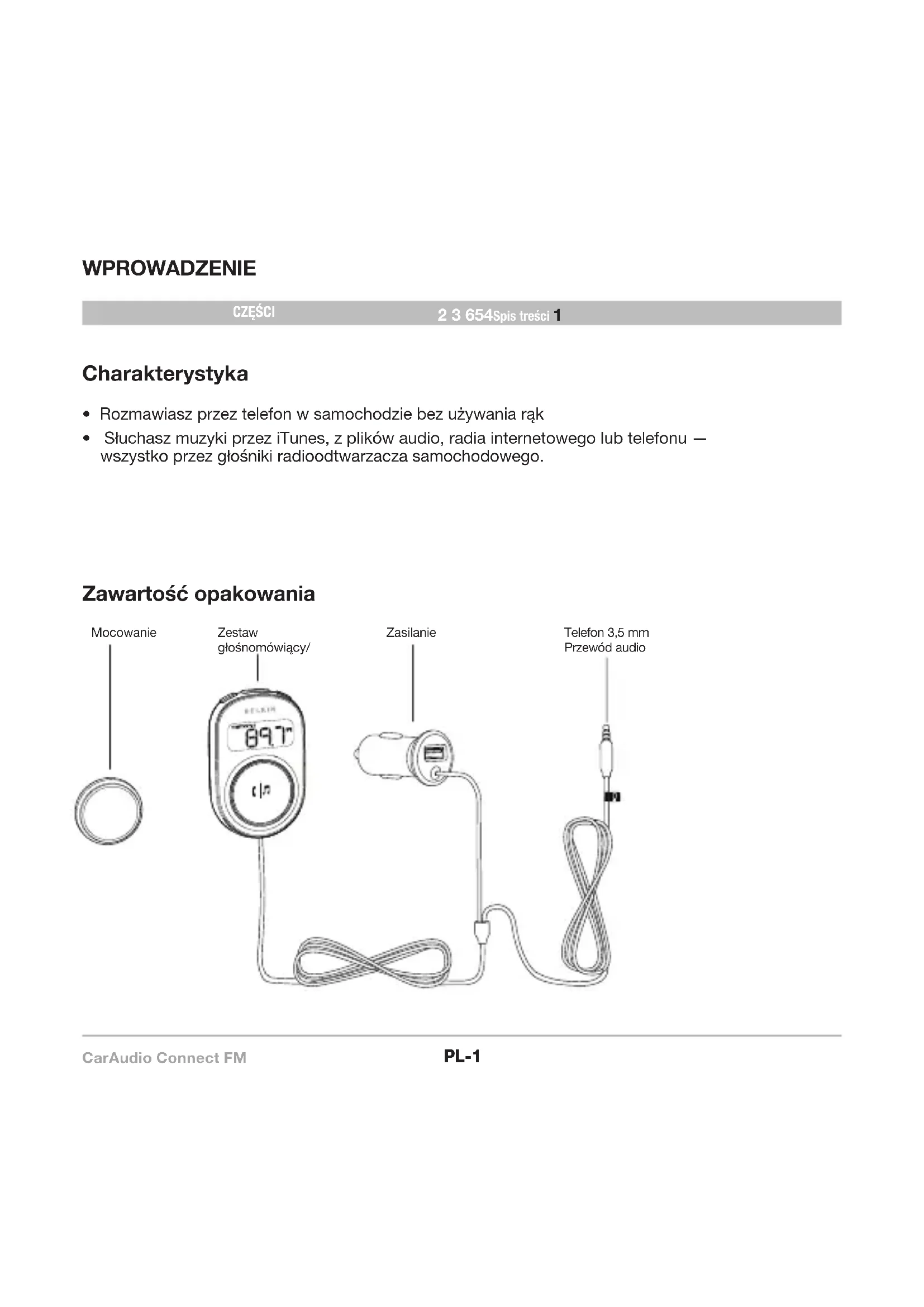 - Słuchasz muzyki przez iTunes, z plików audio, radia internetowego lub telefonu — wszystko przez głośniki radioodtwarzacza samochodowego. Zawartość opakowania MocowanieZestaw głośnomówiący/ Telefon 3,5 mmPrzewód audioZasilanieCarAudio Connect FM PL-2 CZĘŚCI 1 3 654Spis treści 2