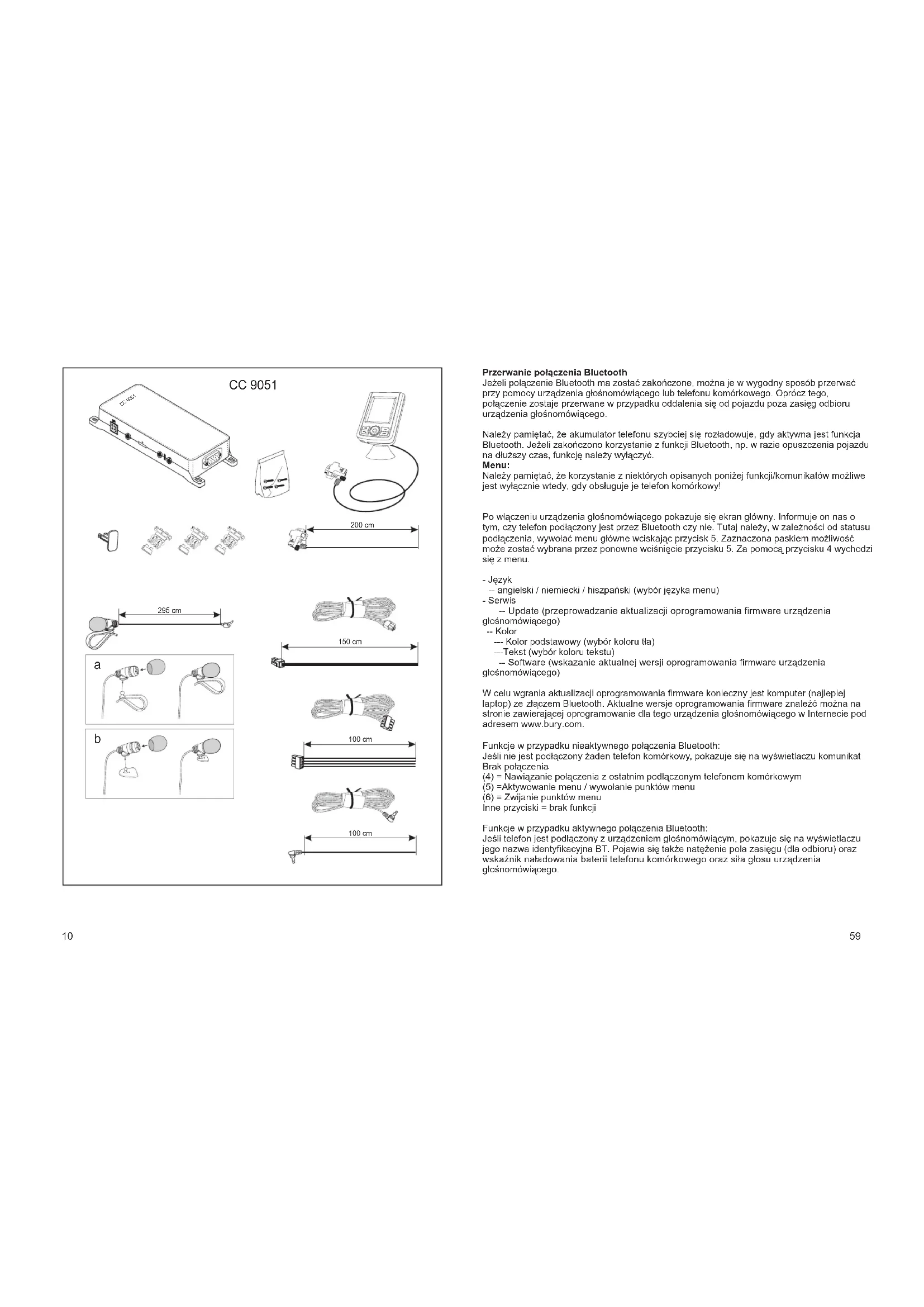 150 cmCC 9050 CC 90505910 Przerwanie po³¹czenia Bluetooth Menu: Je¿eli po³¹czenie Bluetooth ma zostaæ zakoñczone, mo¿na je w wygodny sposób przerwaæ przy pomocy urz¹dzenia g³oœnomówi¹cego lub telefonu komórkowego. Oprócz tego, po³¹czenie zostaje przerwane w przypadku oddalenia siê od pojazdu poza zasiêg odbioru urz¹dzenia g³oœnomówi¹cego. Nale¿y pamiêtaæ, ¿e akumulator telefonu szybciej siê roz³adowuje, gdy aktywna jest funkcja Bluetooth. Je¿eli zakoñczono korzystanie z funkcji Bluetooth, np. w razie opuszczenia pojazdu na d³u¿szy czas, funkcjê nale¿y wy³¹czyæ. Nale¿y pamiêtaæ, ¿e korzystanie z niektórych opisanych poni¿ej funkcji/komunikatów mo¿liwe jest wy³¹cznie wtedy, gdy obs³uguje je telefon komórkowy! Po w³¹czeniu urz¹dzenia g³oœnomówi¹cego pokazuje siê ekran g³ówny. Informuje on nas o tym, czy telefon pod³¹czony jest przez Bluetooth czy nie. Tutaj nale¿y, w zale¿noœci od statusu pod³¹czenia, wywo³aæ menu g³ówne wciskaj¹c przycisk 5. Zaznaczona paskiem mo¿liwoœæ mo¿e zostaæ wybrana przez ponowne wciœniêcie przycisku 5. Za pomoc¹ przycisku 4 wychodzi siê z menu. - Jêzyk -- angielski / niemiecki / hiszpañski (wybór jêzyka menu) - Serwis -- Update (przeprowadzanie aktualizacji oprogramowania firmware urz¹dzenia g³oœnomówi¹cego) -- Kolor --- Kolor podstawowy (wybór koloru t³a) ---Tekst (wybór koloru tekstu) -- Software (wskazanie aktualnej wersji oprogramowania firmware urz¹dzenia g³oœnomówi¹cego) W celu wgrania aktualizacji oprogramowania firmware konieczny jest komputer (najlepiej laptop) ze z³¹czem Bluetooth. Aktualne wersje oprogramowania firmware znaleŸæ mo¿na na stronie zawieraj¹cej oprogramowanie dla tego urz¹dzenia g³oœnomówi¹cego w Internecie pod adresem www.bury.com. Funkcje w przypadku nieaktywnego po³¹czenia Bluetooth: Jeœli nie jest pod³¹czony ¿aden telefon komórkowy, pokazuje siê na wyœwietlaczu komunikat Brak po³¹czenia (4) = Nawi¹zanie po³¹czenia z ostatnim pod³¹czonym telefonem komórkowym (5) =Aktywowanie menu / wywo³anie punktów menu (6) = Zwijanie punktów menu Inne przyciski = brak funkcji Funkcje w przypadku aktywnego po³¹czenia Bluetooth: Jeœli telefon jest pod³¹czony z urz¹dzeniem g³oœnomówi¹cym, pokazuje siê na wyœwietlaczu jego nazwa identyfikacyjna BT. Pojawia siê tak¿e natê¿enie pola zasiêgu (dla odbioru) oraz wskaŸnik na³adowania baterii telefonu komórkowego oraz si³a g³osu urz¹dzenia g³oœnomówi¹cego.