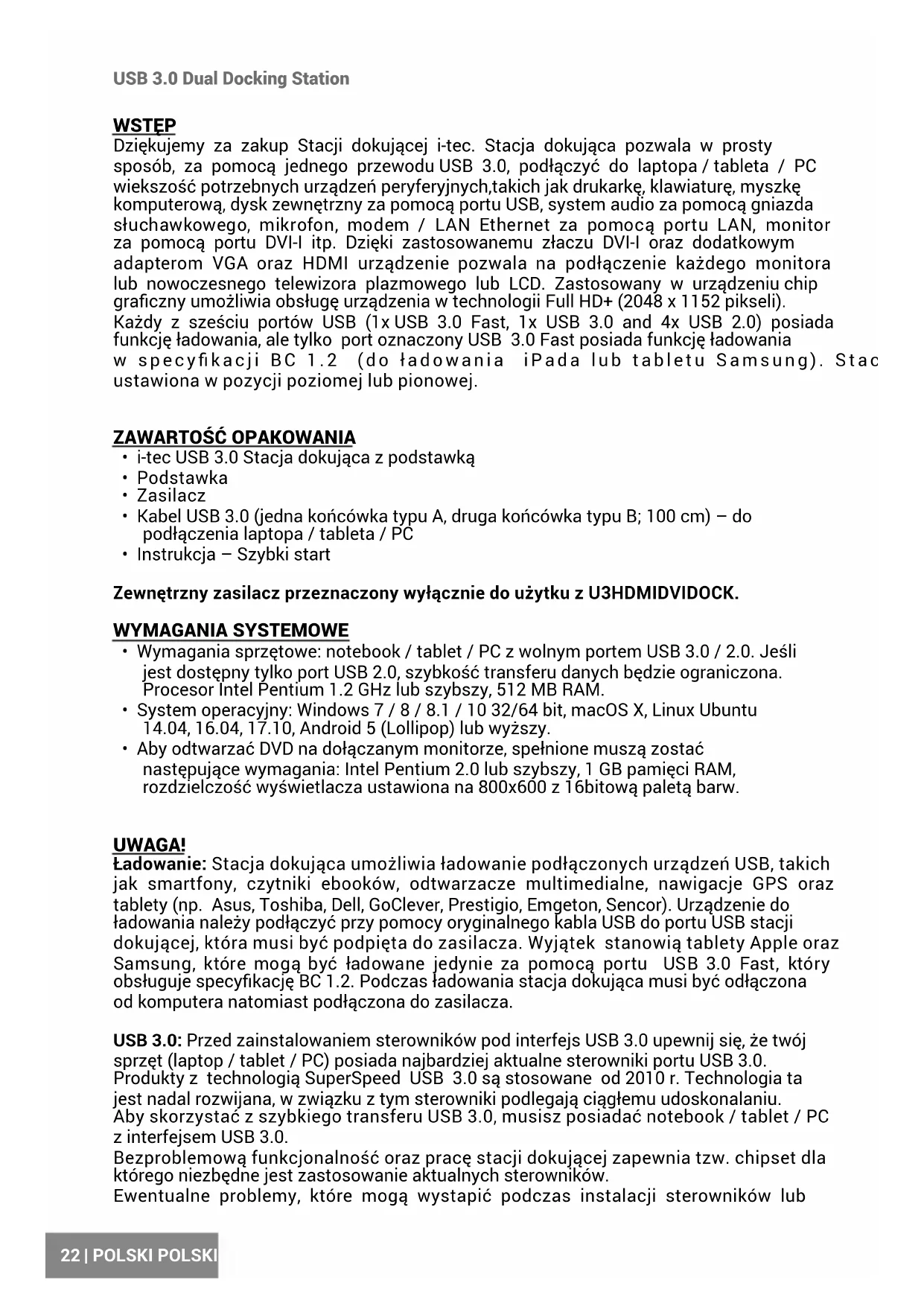 USB 3.0 Dual Docking Station POLSKI POLSKI WSTĘP Dziękujemy za zakup Stacji dokującej i-tec. Stacja dokująca pozwala w prosty sposób, za pomocą jednego przewodu USB 3.0, podłączyć do laptopa / tableta / PC wiekszość potrzebnych urządzeń peryferyjnych,takich jak drukarkę, klawiaturę, myszkę komputerową, dysk zewnętrzny za pomocą portu USB, system audio za pomocą gniazda słuchawkowego, mikrofon, modem / LAN Ethernet za pomocą portu LAN, monitor za pomocą portu DVI-I itp. Dzięki zastosowanemu złaczu DVI-I oraz dodatkowym adapterom VGA oraz HDMI urządzenie pozwala na podłączenie każdego monitora lub nowoczesnego telewizora plazmowego lub LCD. Zastosowany w urządzeniu chip graczny umożliwia obsługę urządzenia w technologii Full HD+ (2048 x 1152 pikseli). Każdy z sześciu portów USB (1x USB 3.0 Fast, 1x USB 3.0 and 4x USB 2.0) posiada funkcję ładowania, ale tylko port oznaczony USB 3.0 Fast posiada funkcję ładowania w specykacji BC 1.2 (do ładowania iPada lub tabletu Samsung). Stacja może być ustawiona w pozycji poziomej lub pionowej. ZAWARTOŚĆ OPAKOWANIA