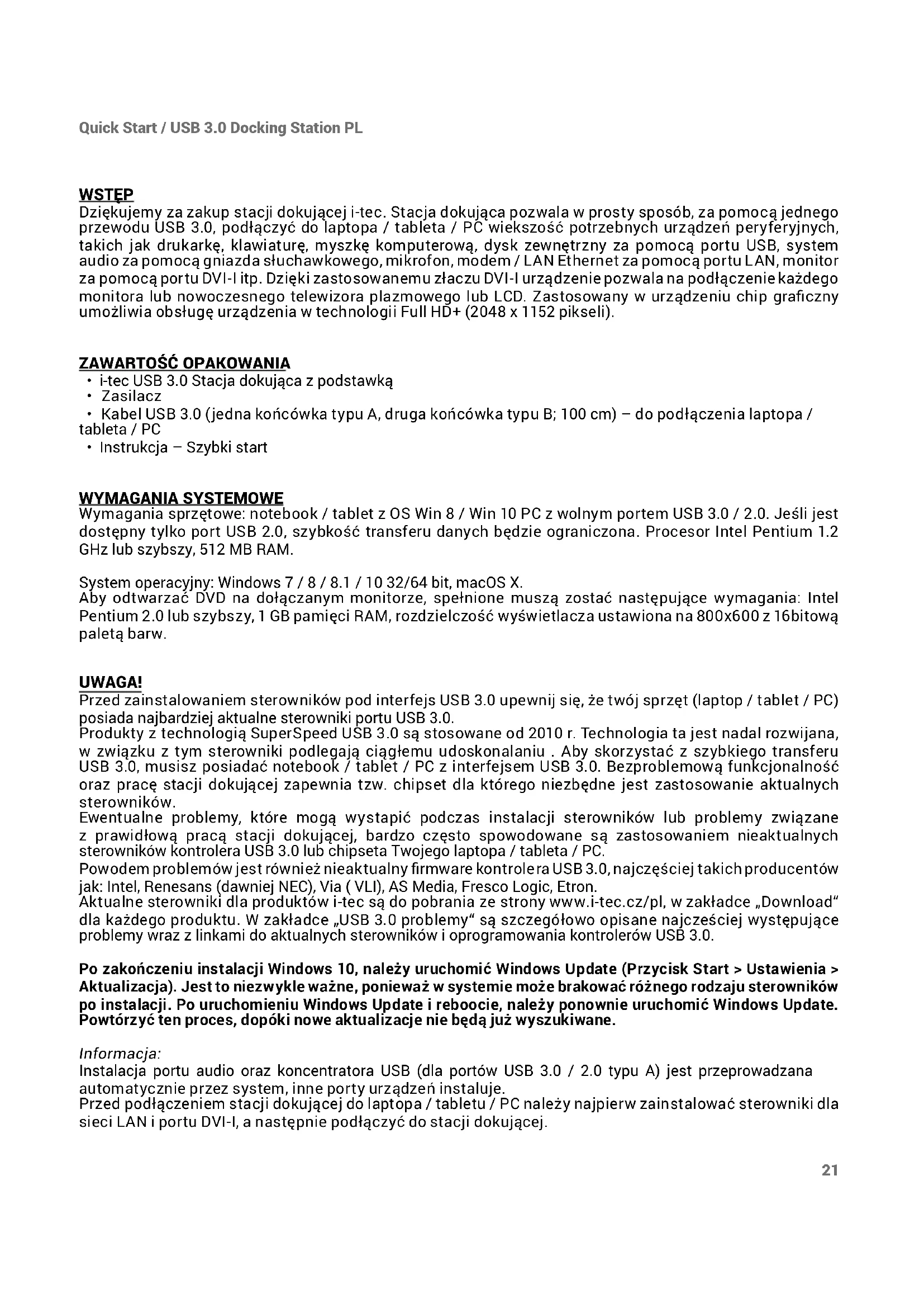 - Instrukcja – Szybki start WYMAGANIA SYSTEMOWE Wymagania sprzętowe: notebook / tablet z OS Win 8 / Win 10 PC z wolnym portem USB 3.0 / 2.0. Jeśli jest dostępny tylko port USB 2.0, szybkość transferu danych będzie ograniczona. Procesor Intel Pentium 1.2 GHz lub szybszy, 512 MB RAM. System operacyjny: Windows 7 / 8 / 8.1 / 10 32/64 bit, macOS X. Aby odtwarzać DVD na dołączanym monitorze, spełnione muszą zostać następujące wymagania: Intel Pentium 2.0 lub szybszy, 1 GB pamięci RAM, rozdzielczość wyświetlacza ustawiona na 800x600 z 16bitową paletą barw. UWAGA! Przed zainstalowaniem sterowników pod interfejs USB 3.0 upewnij się, że twój sprzęt (laptop / tablet / PC) posiada najbardziej aktualne sterowniki portu USB 3.0. Produkty z technologią SuperSpeed USB 3.0 są stosowane od 2010 r. Technologia ta jest nadal rozwijana, w związku z tym sterowniki podlegają ciągłemu udoskonalaniu . Aby skorzystać z szybkiego transferu USB 3.0, musisz posiadać notebook / tablet / PC z interfejsem USB 3.0. Bezproblemową funkcjonalność oraz pracę stacji dokującej zapewnia tzw. chipset dla którego niezbędne jest zastosowanie aktualnych sterowników. Ewentualne problemy, które mogą wystapić podczas instalacji sterowników lub problemy związane z prawidłową pracą stacji dokującej, bardzo często spowodowane są zastosowaniem nieaktualnych sterowników kontrolera USB 3.0 lub chipseta Twojego laptopa / tableta / PC. Powodem problemów jest również nieaktualny firmware kontrole ra USB 3.0, najczęściej takich producentów jak: Intel, Renesans (dawniej NEC), Via ( VLI), AS Media, Fresco Logic, Etron. Aktualne sterowniki dla produktów i-tec są do pobrania ze strony www.i-tec.cz/pl, w zakładce „Download“ dla każdego produktu. W zakładce „USB 3.0 problemy“ są szczegółowo opisane najcześciej występujące problemy wraz z linkami do aktualnych sterowników i oprogramowania kontrolerów USB 3.0. Po zakończeniu instalacji Windows 10, należy uruchomić Windows Update (Przycisk Start > Ustawienia > Aktualizacja). Jest to niezwykle ważne, ponieważ w systemie może brakować różnego rodzaju sterowników po instalacji. Po uruchomieniu Windows Update i reboocie, należy ponownie uruchomić Windows Update. Powtórzyć ten proces, dopóki nowe aktualizacje nie będą już wyszukiwane. Informacja: Instalacja portu audio oraz koncentratora USB (dla portów USB 3.0 / 2.0 typu A) jest przeprowadzana automatycznie przez system, inne porty urządzeń instaluje. Przed podłączeniem stacji dokującej do laptopa / tabletu / PC należy najpierw zainstalować sterowniki dla sieci LAN i portu DVI-I, a następnie podłączyć do stacji dokującej.22 Quick Start / USB 3.0 Docking StationPL INSTALACJA STEROWNIKA W SYSTEMIE WINDOWS 7 / 8 / 8.1 / 10 (32/64 BIT) Przed pierwszym użyciem nie podłączać stacji dokującej do laptopa / tableta / PC, dopóki nie zostaną zainstalowane odpowiednie sterowniki dla sieci LAN oraz portu DVI-I. Sterowniki należy zainstalować przed pierwszym użyciem stacji dokującej. Pobierz wymagane oprogramowanie z naszej strony www.i-tec.cz/pl z zakładki „Download“ dla tego produktu. Aby zainstalować sterowniki, wykonaj następujące czynności: Aby zainstalować sterowniki dla sieci LAN oraz portu DVI-I, uruchom pobrany ze strony internetowej plik, wybierz język instalacji i postępuj zgodnie z instrukcjami wyświetlanymi na ekranie. Informacja: Do zainstalowania sterowników portu DVI-I w systemie Windows 7 / 8 / 8.1 / 10 użyj konta użytkownika „Administrator“. Podczas instalacji sterowników ekran może migać, jednak jest to standardowy proces. Po zakończeniu instalacji zalecane jest ponowne uruchomienie laptopa / tableta / PC. INSTALACJA URZĄDZENIA (PODŁĄCZENIE STACJI DOKUJĄCEJ DO LAPTOPA / TABLETA / PC)