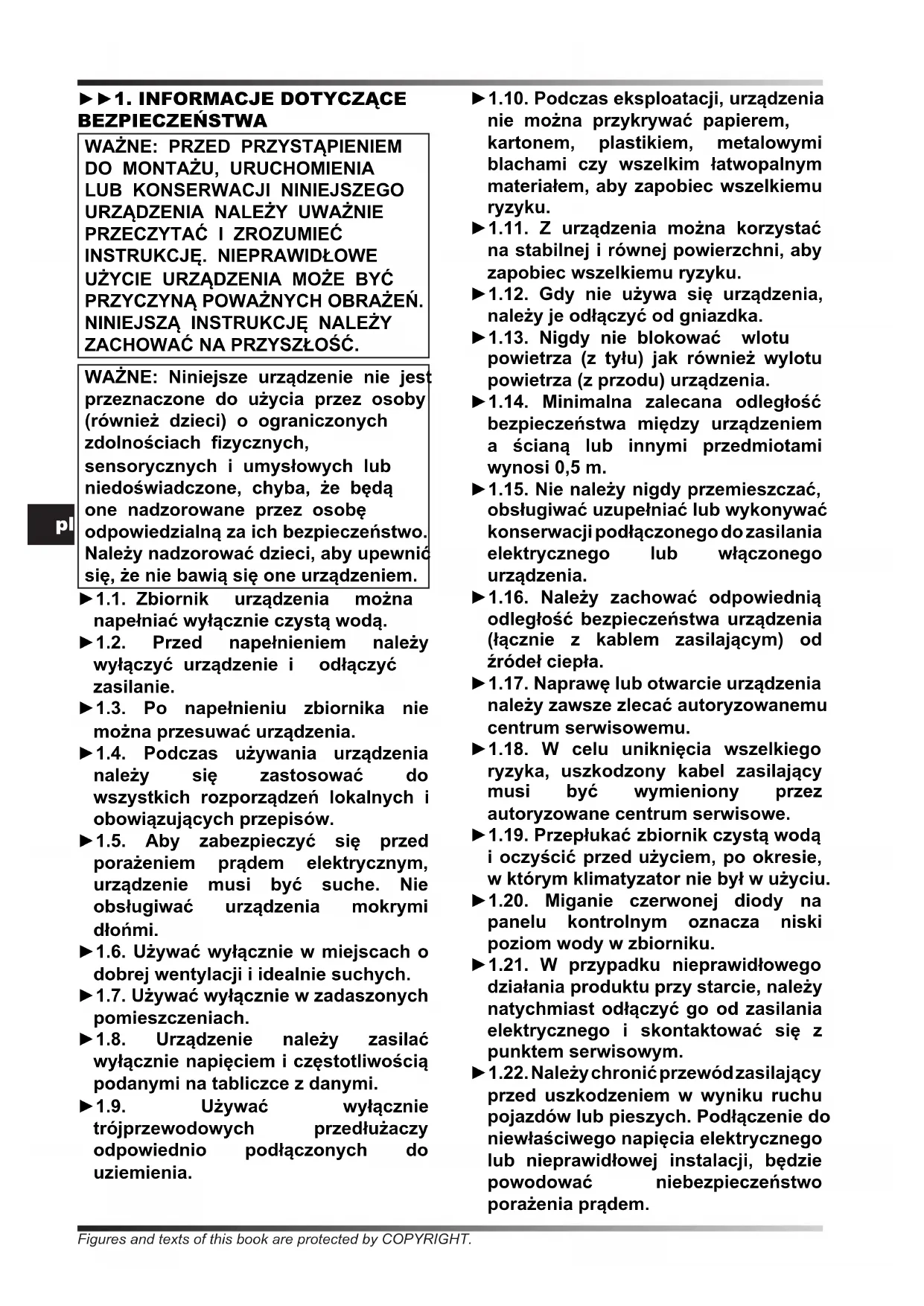 ZACHOWAĆ NA PRZYSZŁOŚĆ. WAŻNE: Niniejsze urządzenie nie jest przeznaczone do użycia przez osoby (również dzieci) o ograniczonych zdolnościach zycznych, sensorycznych i umysłowych lub niedoświadczone, chyba, że będą one nadzorowane przez osobę odpowiedzialną za ich bezpieczeństwo. Należy nadzorować dzieci, aby upewnić się, że nie bawią się one urządzeniem. ►1.1. Zbiornik urządzenia można napełniać wyłącznie czystą wodą. ►1.2. Przed napełnieniem należy wyłączyć urządzenie i odłączyć zasilanie. ►1.3. Po napełnieniu zbiornika nie można przesuwać urządzenia. ►1.4. Podczas używania urządzenia należy się zastosować do wszystkich rozporządzeń lokalnych i obowiązujących przepisów. ►1.5. Aby zabezpieczyć się przed porażeniem prądem elektrycznym, urządzenie musi być suche. Nie obsługiwać urządzenia mokrymi dłońmi. ►1.6. Używać wyłącznie w miejscach o dobrej wentylacji i idealnie suchych. ►1.7. Używać wyłącznie w zadaszonych pomieszczeniach. ►1.8. Urządzenie należy zasilać wyłącznie napięciem i częstotliwością podanymi na tabliczce z danymi. ►1.9. Używać wyłącznie trójprzewodowych przedłużaczy odpowiednio podłączonych do uziemienia. ►1.10. Podczas eksploatacji, urządzenia nie można przykrywać papierem, kartonem, plastikiem, metalowymi blachami czy wszelkim łatwopalnym materiałem, aby zapobiec wszelkiemu ryzyku. ►1.11. Z urządzenia można korzystać na stabilnej i równej powierzchni, aby zapobiec wszelkiemu ryzyku. ►1.12. Gdy nie używa się urządzenia, należy je odłączyć od gniazdka. ►1.13. Nigdy nie blokować wlotu powietrza (z tyłu) jak również wylotu powietrza (z przodu) urządzenia. ►1.14. Minimalna zalecana odległość bezpieczeństwa między urządzeniem a ścianą lub innymi przedmiotami wynosi 0,5 m. ►1.15. Nie należy nigdy przemieszczać, obsługiwać uzupełniać lub wykonywać konserwacji podłączonego do zasilania elektrycznego lub włączonego urządzenia. ►1.16. Należy zachować odpowiednią odległość bezpieczeństwa urządzenia (łącznie z kablem zasilającym) od źródeł ciepła. ►1.17. Naprawę lub otwarcie urządzenia należy zawsze zlecać autoryzowanemu centrum serwisowemu. ►1.18. W celu uniknięcia wszelkiego ryzyka, uszkodzony kabel zasilający musi być wymieniony przez autoryzowane centrum serwisowe. ►1.19. Przepłukać zbiornik czystą wodą i oczyścić przed użyciem, po okresie, w którym klimatyzator nie był w użyciu. ►1.20. Miganie czerwonej diody na panelu kontrolnym oznacza niski poziom wody w zbiorniku. ►1.21. W przypadku nieprawidłowego działania produktu przy starcie, należy natychmiast odłączyć go od zasilania elektrycznego i skontaktować się z punktem serwisowym. ►1.22. Należy chronić przewód zasilający przed uszkodzeniem w wyniku ruchu pojazdów lub pieszych. Podłączenie do niewłaściwego napięcia elektrycznego lub nieprawidłowej instalacji, będzie powodować niebezpieczeństwo porażenia prądem. Figures and texts of this book are protected by COPYRIGHT.pl ►1.23. Warunki użytkowania: A) Temperatura powietrza: 18°C do 45°C; Temperatura wody: <45°C. B) Napięcie w źródle zasilania nie może przekraczać wymaganego napięcia o (+/-) 5%. C) Dopływ powietrza musi być wolny od kurzu, zanieczyszczeń lub powinno być zastosowane dodatkowe oczyszczanie. ►►2. ODPAKOWANIE ►2.1. Usunąć wszystkie materiały opakowania użyte do wysyłki urządzenia i zlikwidować je zgodnie z obowiązującymi przepisami. ►2.2. Wyjąć wszystkie elementy z opakowania. ►2.3. Sprawdzić ewentualne uszkodzenia powstałe na skutek transportowania. Jeżeli urządzenie jest uszkodzone, należy natychmiast poinformować sprzedawcę, u którego zostało ono kupione. ►►3. MONTAŻ Urządzenie wyposażono w kółka, aby ułatwić przemieszczanie. Zależnie od modelu, kółka mogą już być zainstalowane lub są do zainstalowania. Komponenty ze śrubami i nakrętkami niezbędne do montażu, znajdują się w opakowaniu (Rys. 1). ►►4. FUNKCJONOWANIE OSTRZEŻENIE: Przed włączeniem urządzenia należy dokładnie przeczytać
