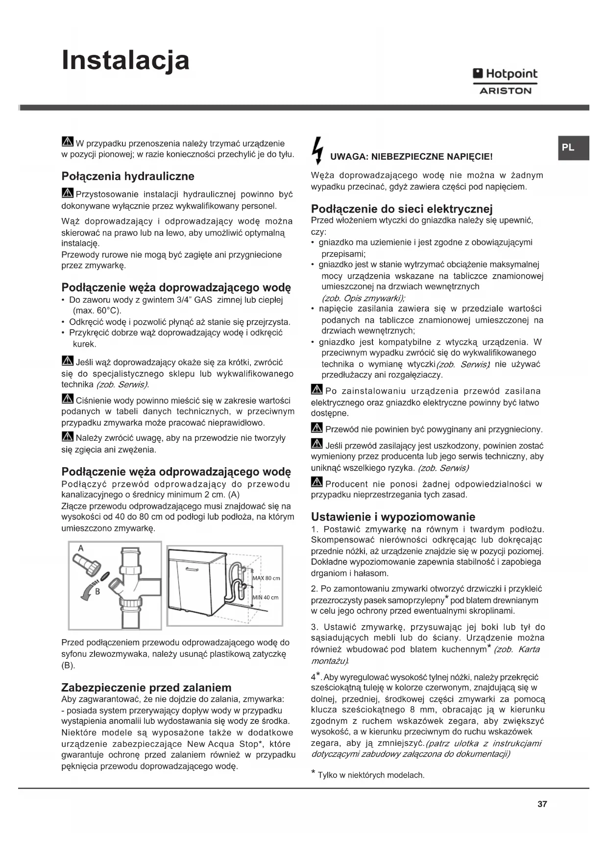 Ciśnienie wody powinno mieścić się w zakresie wartości podanych w tabeli danych technicznych, w przeciwnym przypadku zmywarka może pracować nieprawidłowo.Należy zwrócić uwagę, aby na przewodzie nie tworzyły się zgięcia ani zwężenia. Podłączenie węża odprowadzającego wodę Podłączyć przewód odprowadzający do przewodu kanalizacyjnego o średnicy minimum 2 cm. (A)Złącze przewodu odprowadzającego musi znajdować się na wysokości od 40 do 80 cm od podłogi lub podłoża, na którym umieszczono zmywarkę.Przed podłączeniem przewodu odprowadzającego wodę do syfonu zlewozmywaka, należy usunąć plastikową zatyczkę (B). Zabezpieczenie przed zalaniem Aby zagwarantować, że nie dojdzie do zalania, zmywarka:- posiada system przerywający dopływ wody w przypadku wystąpienia anomalii lub wydostawania się wody ze środka.Niektóre modele są wyposażone także w dodatkowe urządzenie zabezpieczające New Acqua Stop*, które gwarantuje ochronę przed zalaniem również w przypadku pęknięcia przewodu doprowadzającego wodę. UWAGA: NIEBEZPIECZNE NAPIĘCIE! Węża doprowadzającego wodę nie można w żadnym wypadku przecinać, gdyż zawiera części pod napięciem. Podłączenie do sieci elektrycznej Przed włożeniem wtyczki do gniazdka należy się upewnić, czy: