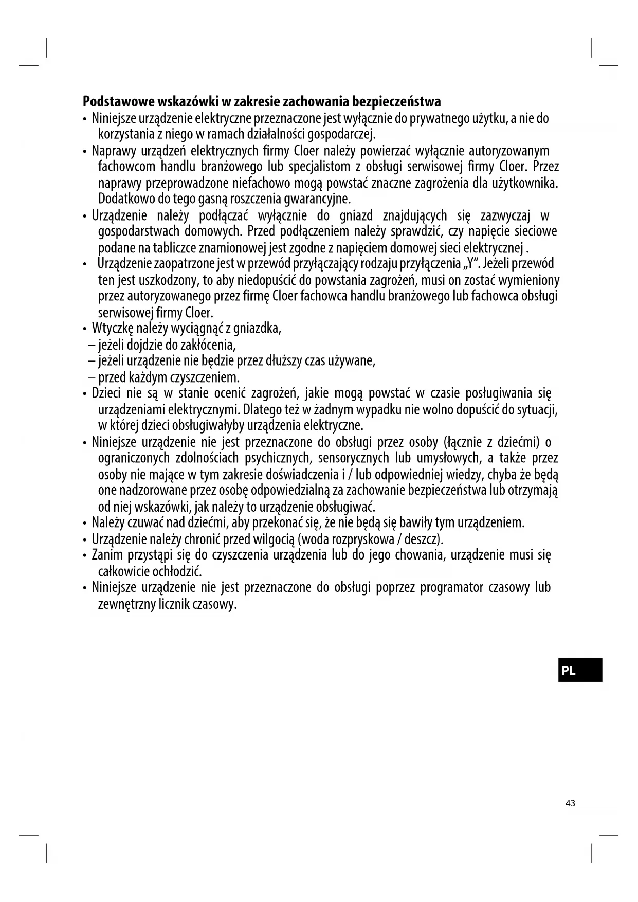 W przypadku, gdy urzadzenia firmy Cloer jest uszkodzone, nalezy zworcić sie do sprezedawcy lub autoryzanego punktu serwisowej firmy Cloer. Urzadzenia elektryczne firmy Cloer odpowiadajęactualnym wytycznym UE i spelniajaść bezpieczność.