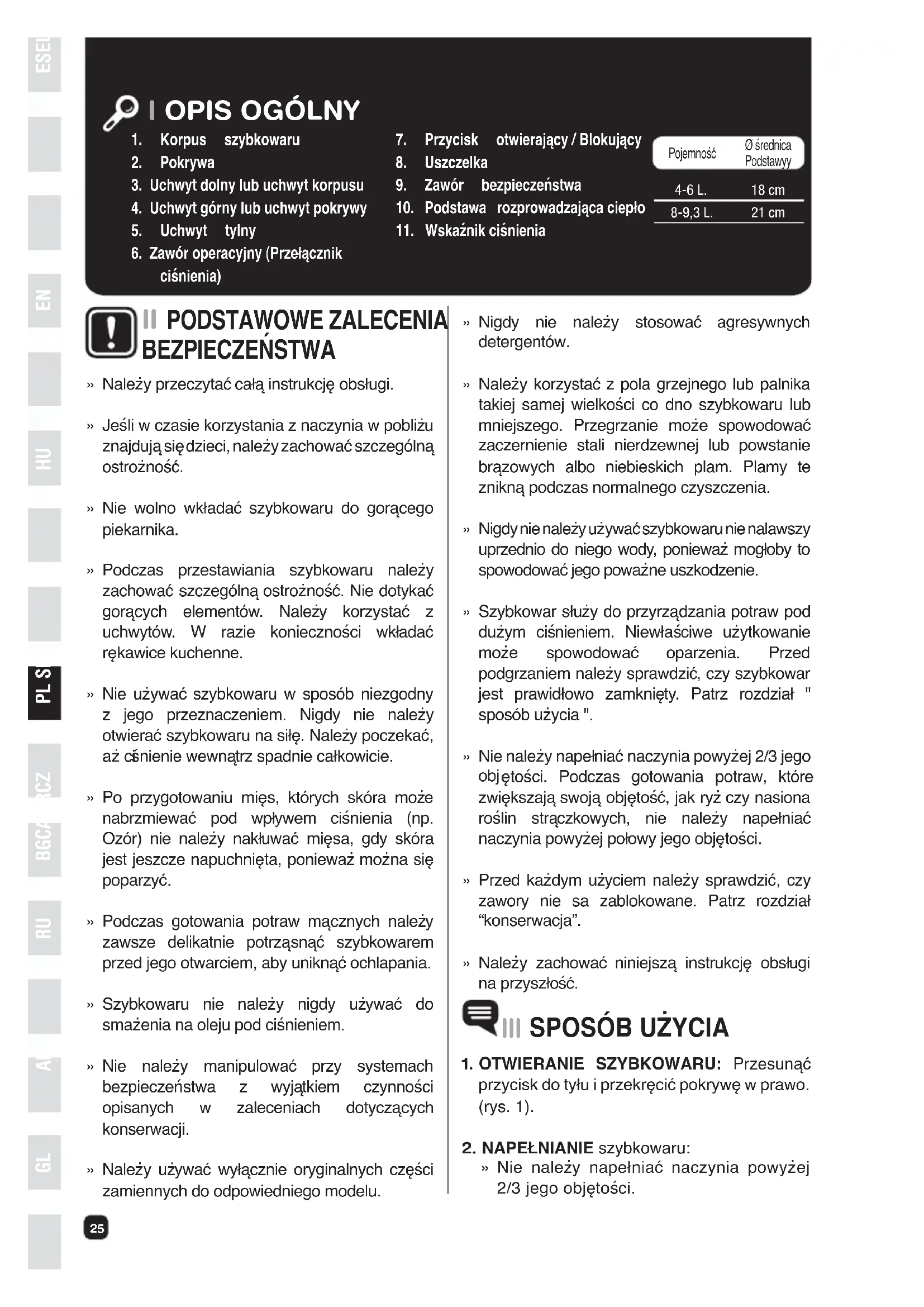 » Nie należy napełniać naczynia powyżej 2/3 jego objętości. Pojemność Ø średnica Podstawyy 4-6 L. 8-9,3 L. 18 cm 21 cm » Należy przeczytać całą instrukcję obsługi. » Jeśli w czasie korzystania z naczynia w pobliżu znajdują się dzieci, należy zachować szczególną ostrożność. » Nie wolno wkładać szybkowaru do gorącego piekarnika. » Podczas przestawiania szybkowaru należy zachować szczególną ostrożność. Nie dotykać gorących elementów. Należy korzystać z uchwytów. W razie konieczności wkładać rękawice kuchenne. » Nie używać szybkowaru w sposób niezgodny z jego przeznaczeniem. Nigdy nie należy otwierać szybkowaru na siłę. Należy poczekać, aż ci śnienie wewnątrz spadnie całkowicie. » Po przygotowaniu mięs, których skóra może nabrzmiewać pod wpływem ciśnienia (np. Ozór) nie należy nakłuwać mięsa, gdy skóra jest jeszcze napuchnięta, ponieważ można się poparzyć. » Podczas gotowania potraw mącznych należy zawsze delikatnie potrząsnąć szybkowarem przed jego otwarciem, aby uniknąć ochlapania. » Szybkowaru nie należy nigdy używać do smażenia na oleju pod ciśnieniem. » Nie należy manipulować przy systemach bezpieczeństwa z wyjątkiem czynności opisanych w zaleceniach dotyczących konserwacji. » Należy używać wyłącznie oryginalnych części zamiennych do odpowiedniego modelu.