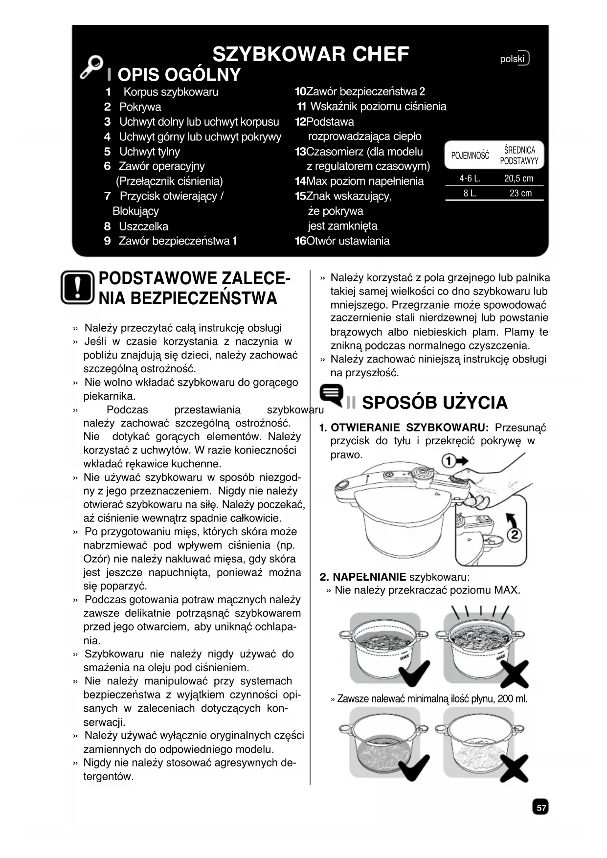 Zawsze nalewać minimalną ilość płynu, 200 ml. SZYBKOWAR CHEF POJEMNOŚĆ ŚREDNICA PODSTAWYY 4-6 L. 8 L. 20,5 cm 23 cm » Należy przeczytać całą instrukcję obsługi » Jeśli w czasie korzystania z naczynia w pobliżu znajdują się dzieci, należy zachować szczególną ostrożność. » Nie wolno wkładać szybkowaru do gorącego piekarnika. » Podczas przestawiania szybkowaru należy zachować szczególną ostrożność. Nie dotykać gorących elementów. Należy korzystać z uchwytów. W razie konieczności wkładać rękawice kuchenne. » Nie używać szybkowaru w sposób niezgod- ny z jego przeznaczeniem. Nigdy nie należy otwierać szybkowaru na siłę. Należy poczekać, aż ciśnienie wewnątrz spadnie całkowicie. » Po przygotowaniu mięs, których skóra może nabrzmiewać pod wpływem ciśnienia (np. Ozór) nie należy nakłuwać mięsa, gdy skóra jest jeszcze napuchnięta, ponieważ można się poparzyć. » Podczas gotowania potraw mącznych należy zawsze delikatnie potrząsnąć szybkowarem przed jego otwarciem, aby uniknąć ochlapa- nia. » Szybkowaru nie należy nigdy używać do smażenia na oleju pod ciśnieniem. » Nie należy manipulować przy systemach bezpieczeństwa z wyjątkiem czynności opi- sanych w zaleceniach dotyczących kon- serwacji. » Należy używać wyłącznie oryginalnych części zamiennych do odpowiedniego modelu. » Nigdy nie należy stosować agresywnych de- tergentów. PODSTAWOWE ZALECE-