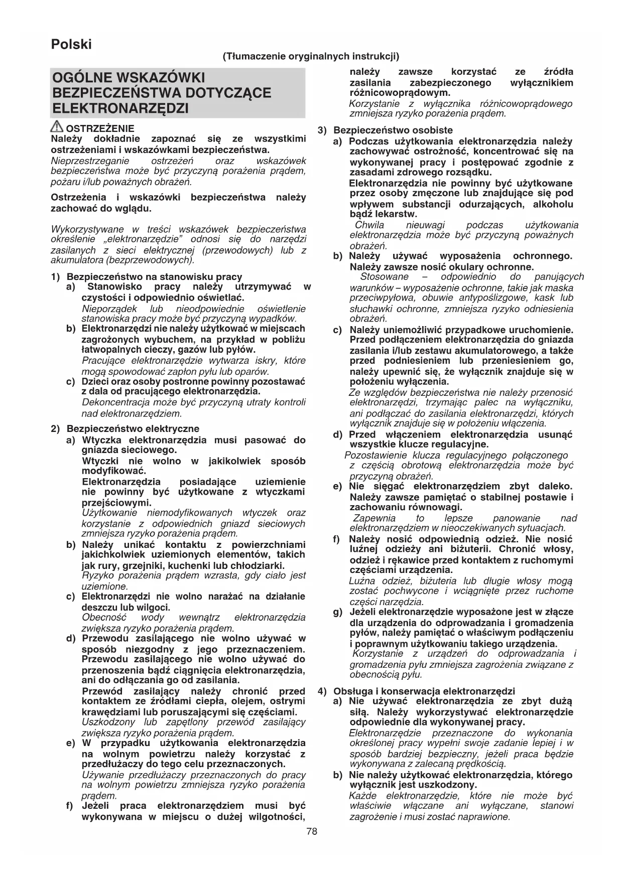 ELEKTRONARZĘDZI OSTRZEŻENIE Należy dokładnie zapoznać się ze wszystkimi ostrzeżeniami i wskazówkami bezpieczeństwa. Nieprzestrzeganie ostrzeżeń oraz wskazówek bezpieczeństwa może być przyczyną porażenia prądem, pożaru i/lub poważnych obrażeń. Ostrzeżenia i wskazówki bezpieczeństwa należy zachować do wglądu. Wykorzystywane w treści wskazówek bezpieczeństwa określenie „elektronarzędzie” odnosi się do narzędzi zasilanych z sieci elektrycznej (przewodowych) lub z akumulatora (bezprzewodowych).