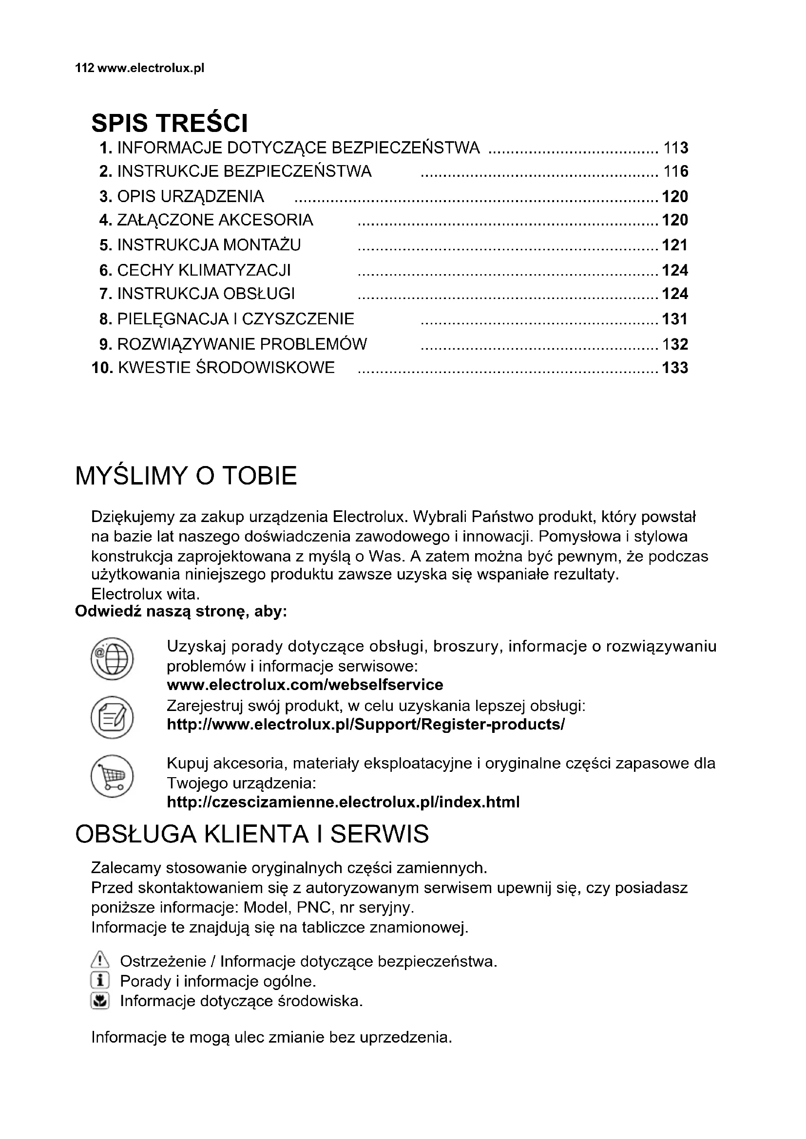 Dziękujemy za zakup urządzenia Electrolux. Wybrali Państwo produkt, który powstał na bazie lat naszego doświadczenia zawodowego i innowacji. Pomysłowa i stylowa konstrukcja zaprojektowana z myślą o Was. A zatem można być pewnym, że podczas użytkowania niniejszego produktu zawsze uzyska się wspaniałe rezultaty. Electrolux wita. Zalecamy stosowanie oryginalnych części zamiennych. Przed skontaktowaniem się z autoryzowanym serwisem upewnij się, czy posiadasz poniższe informacje: Model, PNC, nr seryjny. Informacje te znajdują się na tabliczce znamionowej. Informacje te mogą ulec zmianie bez uprzedzenia. Ostrzeżenie / Informacje dotyczące bezpieczeństwa. Porady i informacje ogólne. Informacje dotyczące środowiska. Uzyskaj porady dotyczące obsługi, broszury, informacje o rozwiązywaniu problemów i informacje serwisowe: www.electrolux.com/webselfservice Odwiedź naszą stronę, aby: Zarejestruj swój produkt, w celu uzyskania lepszej obsługi: http://www.electrolux.pl/Support/Register-products/ Kupuj akcesoria, materiały eksploatacyjne i oryginalne części zapasowe dla Twojego urządzenia: http://czescizamienne.electrolux.pl/index.html