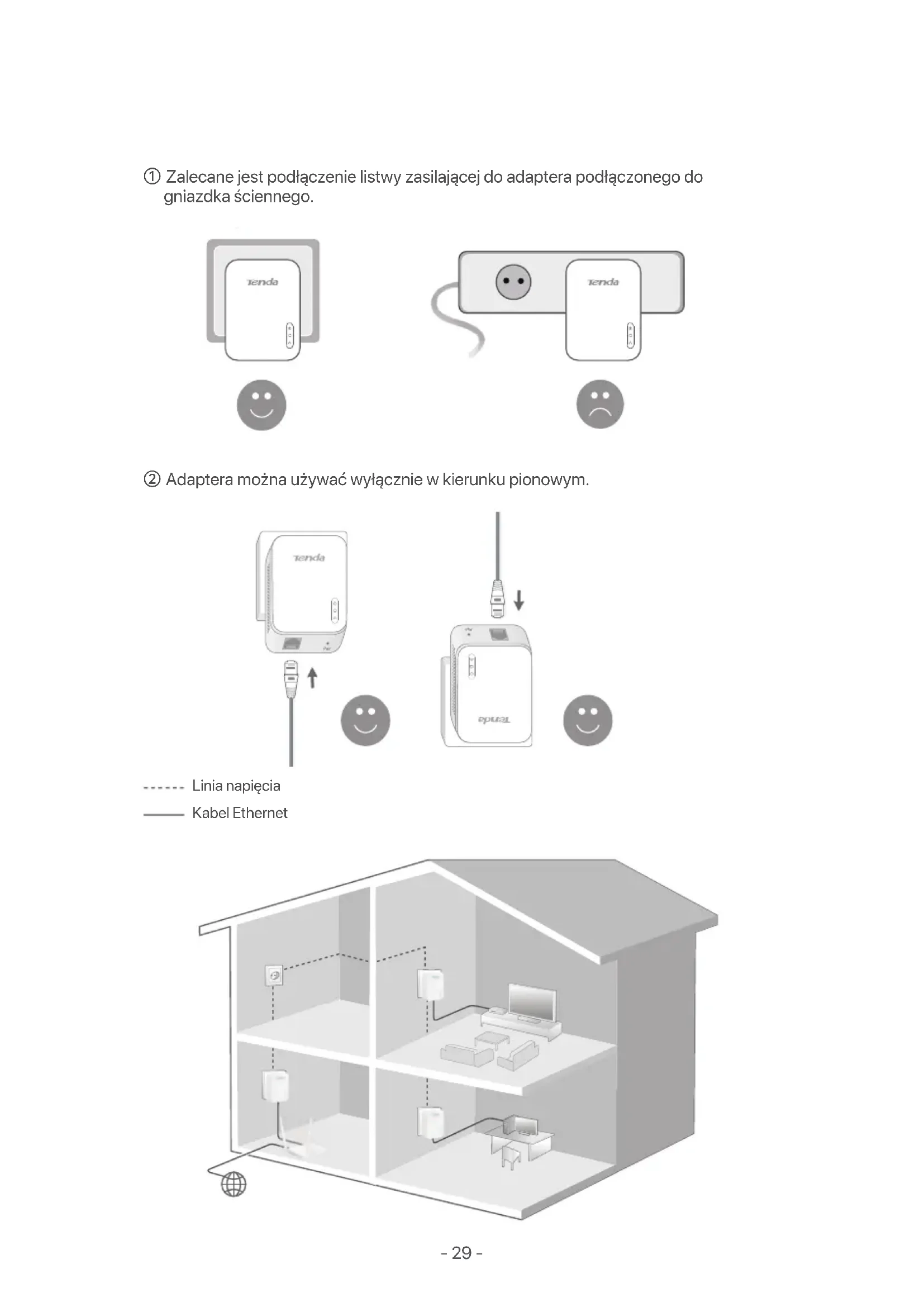 - Utilisez le bouton Pair pour le coupler à nouveau avec un autre adaptateur du réseau CPL. A3: Essayez les méthodes suivantes:- 29 - Polski Uwaga ② Adaptera można używać wyłącznie w kierunku pionowym. ① Zalecane jest podłączenie listwy zasilającej do adaptera podłączonego do gniazdka ściennego. Linia napięcia Kabel Ethernet-30- Podłącz adapter do portu LAN routera, aby uzyskać dostęp do Internetu, i podłącz go do pobliskiego gniazdka ściennego. Podłącz drugi adapter do urządzenia przewodowego, takiego jak dekoder, i podłącz go do gniazdka ściennego. Poczekaj, aż wskaźniki LED PLC dwóch adapterów zaświecą się światłem ciągłym.-31- (Opcjonalnie) Zabezpiecz swoją sieć Powerline