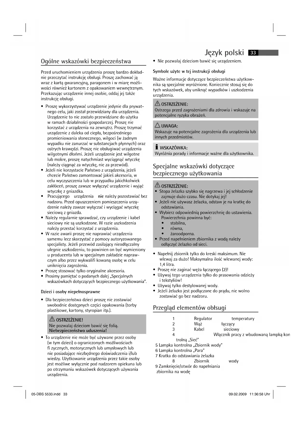 - Jeżeli żelazko jest podłączone do prądu, nie wolno zostawiać go bez nadzoru. Przegląd elementów obłsugi 1 Regulator temperatury 2 Wąż łączący 3 Kabel sieciowy 4 Włącznik pracy z wbudowaną lampką kon- trolną „Sieć” 5 Lampka kontrolna „Zbiornik wody” 6 Lampka kontrolna „Para“ 7 Kratka do odstawiania żelazka 8 Zbiornik wody 9 Zamknięcie/otwór do napełniania zbiornika na wodę 05-DBS 5533.indd 3305-DBS 5533.indd 33 09.02.2009 11:36:58 Uhr09.02.2009 11:36:58 UhrJęzyk polski