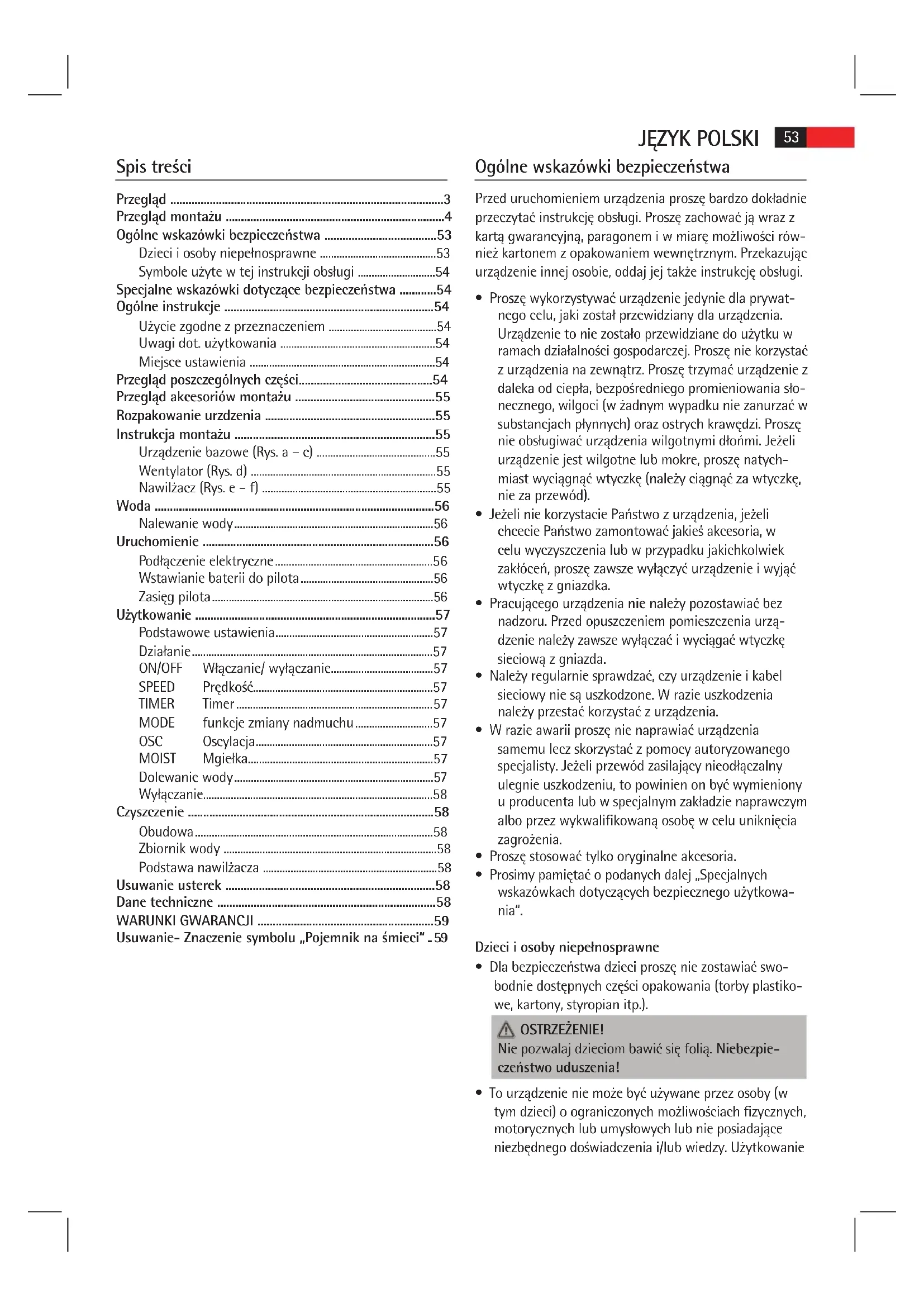 - Nie stawiaj urządzenia bezpośrednio obok pieca lub innego źródła gorąca. UWAGA: Zintegrowany nawilżacz działa dzięki ultradźwiękom. Dźwięk może przeszkadzać zwierzętom. Ogólne instrukcje Użycie zgodne z przeznaczeniem Urządzenie może być użyte jako wentylator i/ lub nawil- żacz. Jest przeznaczone tylko do tego celu i tylko do tego celu może być używane. Urządzenie może być używane tylko w sposób opisany w instrukcji obsługi. Nie wolno używać go do celów zarobkowych. Każde inne użycie jest uważane za niezgodne z przezna- czeniem i może spowodować szkody materialne a także szkody osobowe. ETV - Elektro-Technische Vertriebsgesellschaft mbH nie odpowiada za szkody spowodowane użyciem urządzenia niezgodnym z przeznaczeniem. Uwagi dot. użytkowania Można użyć tego urządzenia w celu poprawy wilgotności powietrza w suchych miejscach. Zapewnia to następujące korzyści: