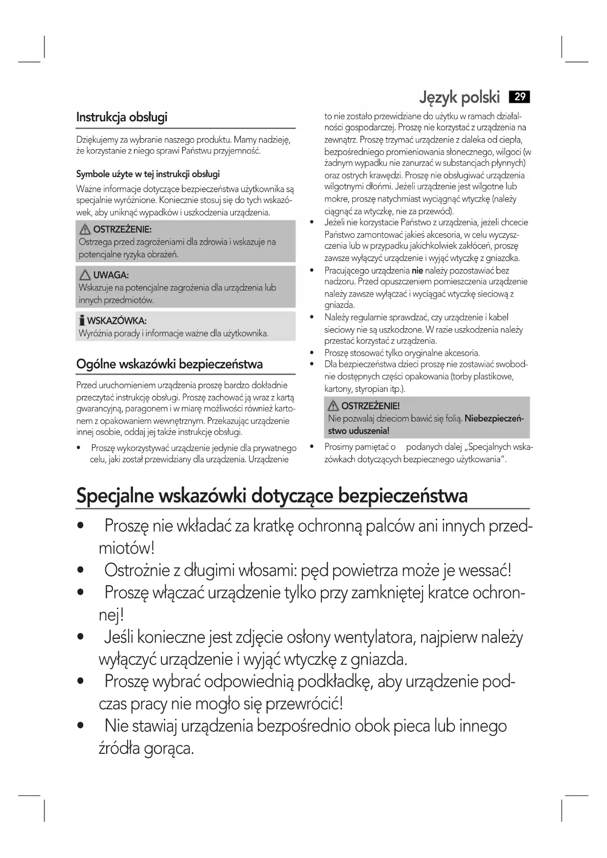 Instrukcja obsługi Dziękujemy za wybranie naszego produktu. Mamy nadzieję, że korzystanie z niego sprawi Państwu przyjemność.Symbole użyte w tej instrukcji obsługiWażne informacje dotyczące bezpieczeństwa użytkownika są specjalnie wyróżnione. Koniecznie stosuj się do tych wskazó-wek, aby uniknąć wypadków i uszkodzenia urządzenia. OSTRZEŻENIE: Ostrzega przed zagrożeniami dla zdrowia i wskazuje na potencjalne ryzyka obrażeń. UWAGA: Wskazuje na potencjalne zagrożenia dla urządzenia lub innych przedmiotów. WSKAZÓWKA:Wyróżnia porady i informacje ważne dla użytkownika. Ogólne wskazówki bezpieczeństwa Przed uruchomieniem urządzenia proszę bardzo dokładnie przeczytać instrukcję obsługi. Proszę zachować ją wraz z kartą gwarancyjną, paragonem i w miarę możliwości również karto-nem z opakowaniem wewnętrznym. Przekazując urządzenie innej osobie, oddaj jej także instrukcję obsługi.• Proszęwykorzystywaćurządzeniejedyniedlaprywatnegocelu, jaki został przewidziany dla urządzenia. Urządzenie to nie zostało przewidziane do użytku w ramach działal-ności gospodarczej. Proszę nie korzystać z urządzenia na zewnątrz. Proszę trzymać urządzenie z daleka od ciepła, bezpośredniego promieniowania słonecznego, wilgoci (w żadnym wypadku nie zanurzać w substancjach płynnych) oraz ostrych krawędzi. Proszę nie obsługiwać urządzenia wilgotnymidłońmi.Jeżeliurządzeniejestwilgotnelubmokre, proszę natychmiast wyciągnąć wtyczkę (należy ciągnąć za wtyczkę, nie za przewód). • JeżeliniekorzystaciePaństwozurządzenia,jeżelichceciePaństwo zamontować jakieś akcesoria, w celu wyczysz-czenia lub w przypadku jakichkolwiek zakłóceń, proszę zawsze wyłączyć urządzenie i wyjąć wtyczkę z gniazdka.• Pracującegourządzenianie należy pozostawiać bez nadzoru. Przed opuszczeniem pomieszczenia urządzenie należy zawsze wyłączać i wyciągać wtyczkę sieciową z gniazda.• Należyregularniesprawdzać,czyurządzenieikabelsieciowy nie są uszkodzone. W razie uszkodzenia należy przestać korzystać z urządzenia.• Proszęstosowaćtylkooryginalneakcesoria.• Dlabezpieczeństwadzieciproszęniezostawiaćswobod-nie dostępnych części opakowania (torby plastikowe, kartony, styropian itp.). OSTRZEŻENIE!Nie pozwalaj dzieciom bawić się folią. Niebezpieczeń-stwo uduszenia!• Prosimypamiętaćo podanychdalej„Specjalnychwska-zówkach dotyczących bezpiecznego użytkowania“. Specjalne wskazówki dotyczące bezpieczeństwa