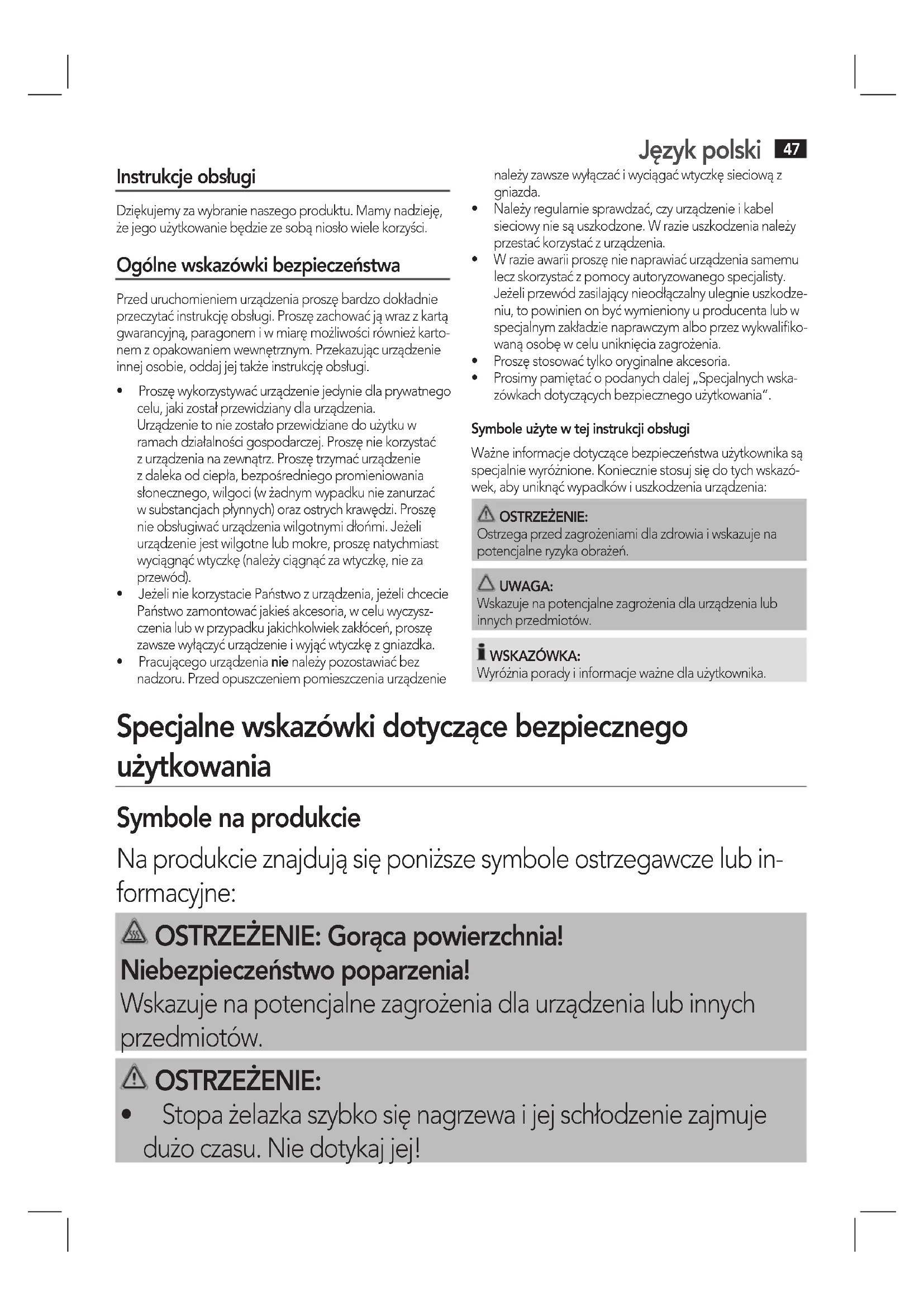 Instrukcje obsługi Dziękujemy za wybranie naszego produktu. Mamy nadzieję, że jego użytkowanie będzie ze sobą niosło wiele korzyści. Ogólne wskazówki bezpieczeństwa Przed uruchomieniem urządzenia proszę bardzo dokładnie przeczytać instrukcję obsługi. Proszę zachować ją wraz z kartą gwarancyjną, paragonem i w miarę możliwości również karto-nem z opakowaniem wewnętrznym. Przekazując urządzenie innej osobie, oddaj jej także instrukcję obsługi.• Proszęwykorzystywaćurządzeniejedyniedlaprywatnegocelu, jaki został przewidziany dla urządzenia. Urządzenie to nie zostało przewidziane do użytku w ramach działalności gospodarczej. Proszę nie korzystać z urządzenia na zewnątrz. Proszę trzymać urządzenie z daleka od ciepła, bezpośredniego promieniowania słonecznego, wilgoci (w żadnym wypadku nie zanurzać w substancjach płynnych) oraz ostrych krawędzi. Proszę nie obsługiwać urządzenia wilgotnymi dłońmi. Jeżeli urządzenie jest wilgotne lub mokre, proszę natychmiast wyciągnąć wtyczkę (należy ciągnąć za wtyczkę, nie za przewód).• JeżeliniekorzystaciePaństwozurządzenia,jeżelichceciePaństwo zamontować jakieś akcesoria, w celu wyczysz-czenia lub w przypadku jakichkolwiek zakłóceń, proszę zawsze wyłączyć urządzenie i wyjąć wtyczkę z gniazdka.• Pracującegourządzenianie należy pozostawiać bez nadzoru. Przed opuszczeniem pomieszczenia urządzenie należy zawsze wyłączać i wyciągać wtyczkę sieciową z gniazda.• Należyregularniesprawdzać,czyurządzenieikabelsieciowy nie są uszkodzone. W razie uszkodzenia należy przestać korzystać z urządzenia.• Wrazieawariiproszęnienaprawiaćurządzeniasamemulecz skorzystać z pomocy autoryzowanego specjalisty. Jeżeli przewód zasilający nieodłączalny ulegnie uszkodze-niu, to powinien on być wymieniony u producenta lub w specjalnym zakładzie naprawczym albo przez wykwalifiko-waną osobę w celu uniknięcia zagrożenia.• Proszęstosowaćtylkooryginalneakcesoria.• Prosimypamiętaćopodanychdalej„Specjalnychwska-zówkach dotyczących bezpiecznego użytkowania“.Symbole użyte w tej instrukcji obsługiWażne informacje dotyczące bezpieczeństwa użytkownika są specjalnie wyróżnione. Koniecznie stosuj się do tych wskazó-wek, aby uniknąć wypadków i uszkodzenia urządzenia: OSTRZEŻENIE:Ostrzega przed zagrożeniami dla zdrowia i wskazuje na potencjalne ryzyka obrażeń. UWAGA:Wskazuje na potencjalne zagrożenia dla urządzenia lub innych przedmiotów. WSKAZÓWKA:Wyróżnia porady i informacje ważne dla użytkownika. Specjalne wskazówki dotyczące bezpiecznego użytkowania Symbole na produkcie Na produkcie znajdują się poniższe symbole ostrzegawcze lub in- formacyjne: OSTRZEŻENIE: Gorąca powierzchnia! Niebezpieczeństwo poparzenia! Wskazuje na potencjalne zagrożenia dla urządzenia lub innych przedmiotów. OSTRZEŻENIE: