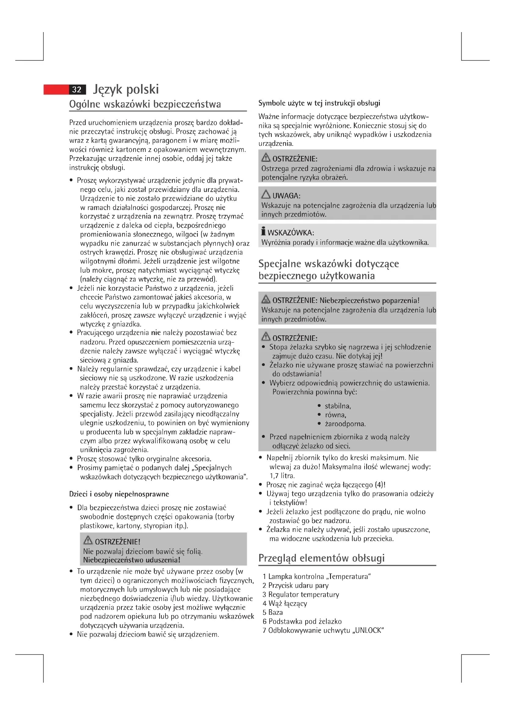 - Prosimy pamiętać o podanych dalej „Specjalnych wskazówkach dotyczących bezpiecznego użytkowania“. Dzieci i osoby niepełnosprawne