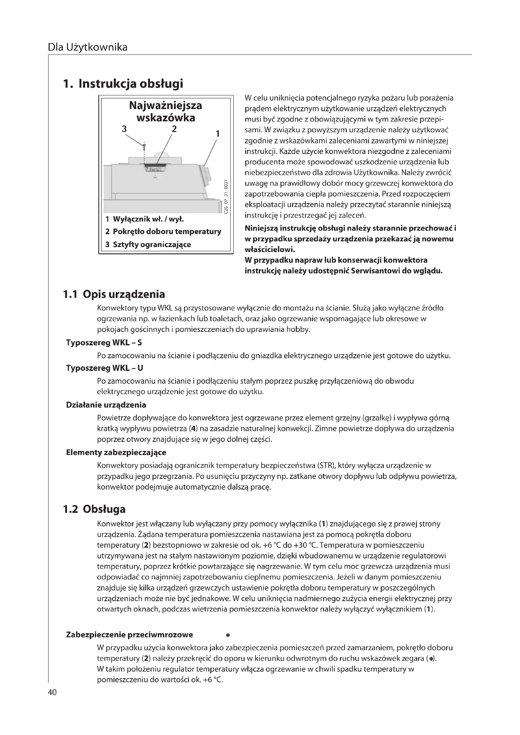 Konwektor jest wlaczany lub wyluczany przy pomocy wylacznika (1) znajdujacego sie z sprawej strony urzadzenia. Zadana temperatura pomieszczenia nastawiana jest za pomocag Pokretla doboru temperature (2) bezstopniowo w zakresie od ok. +6^ do +30^. Temperatura w pomieszczeniu utrzmywana jest na sta tym nestawionym poziomie, Dzieks wbudowanemu w urzadzenia regulatorowi temperature, poprzej krótkie powtarzajcse sie nagrzewanie. W tym celu moc grzewcza urzadzenia musi odpowiadać co najmiej zapotrzebowaniu cieplnemu pomieszczenia. Jeźeli w danym pomieszczeniu znajduje sie kila urzadzen grzewczych ustawienie Pokretla doboru temperature w poszczeugólnych urzadzeniach möglich nie byc jaknekawe. W celu uniknięcia nadmiernego zuzycia energii elektrycznej przy otwartych oknach, podczas wietrzenia pomieszczenia konwektor naleź wylaczyc wylacznikiem (1).