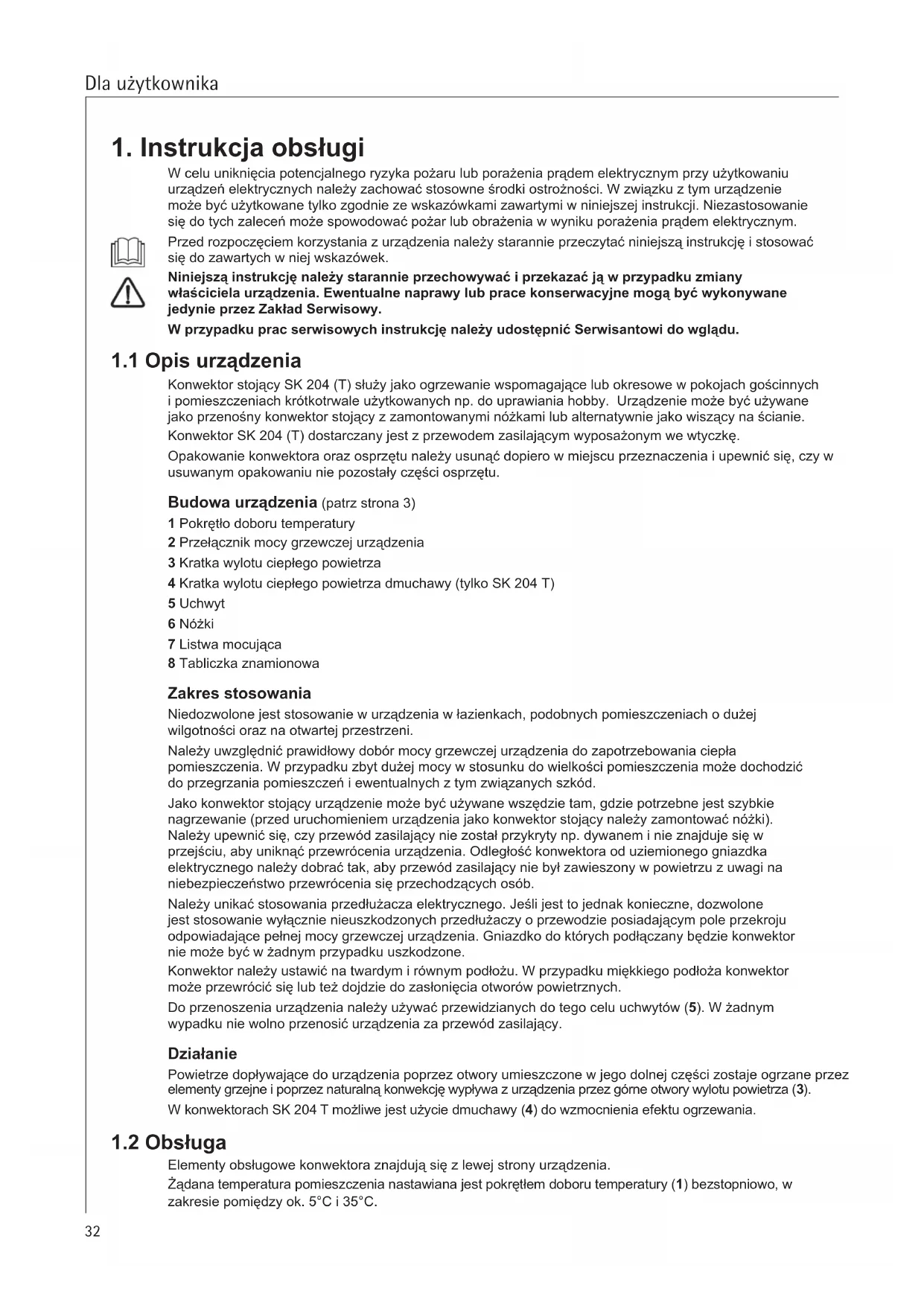 Konwektor stojacy SK 204 (T) sluzy jako ogrzewanie wspomagajce lub okresowe w pokojach gościnnych i pomieszczeniach krótkotrawe uzytkowanych np. do uprawiania hobby. Urzadzenia要去 byc uzywane jako przyenosny konwektor stojacy z zamontowanymi noźkami lub alternatywnie jako wiszenia na scianie. Konwektor SK 204 (T) dostarczny jest z przywodem zasilajczym wyposzaźonym we wtyczne.