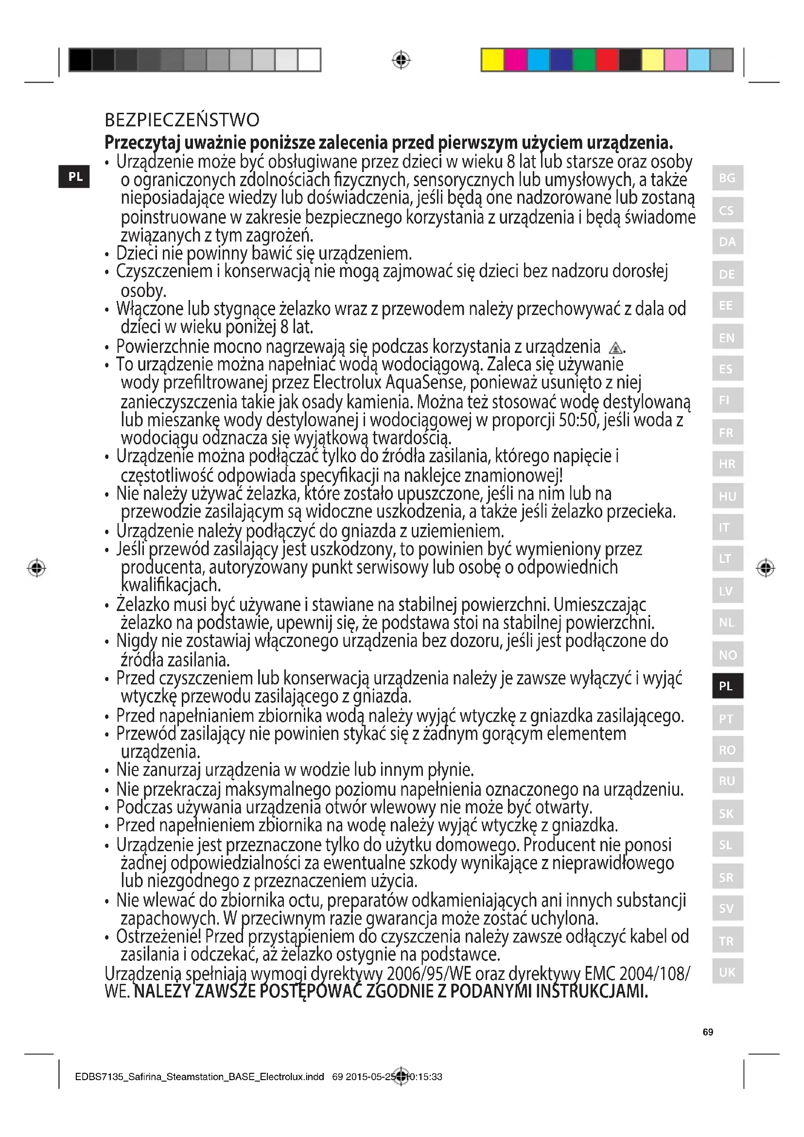 EDBS7135_Safirina_Steamstation_BASE_Electrolux.indd 68 2015-05-25 10:15:33PL BEZPIECZEŃSTWO Przeczytaj uważnie poniższe zalecenia przed pierwszym użyciem urządzenia.