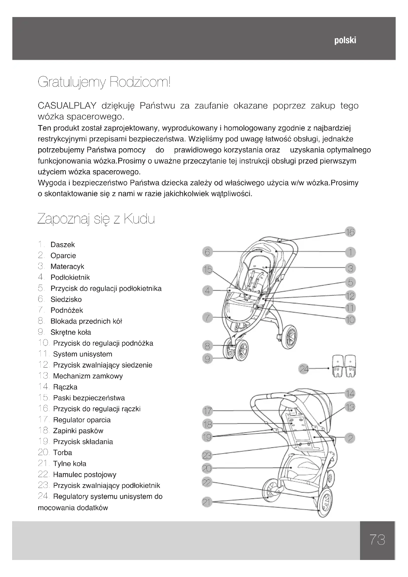 mocowaniadodatków Gratulujemy Rodzicom! CASUALPLAY dziękuję Państwu za zaufanie okazane poprzez zakup tego wózka spacerowego. Tenproduktzostałzaprojektowany,wyprodukowanyihomologowanyzgodnieznajbardziej restrykcyjnymiprzepisamibezpieczeństwa.Wzięliśmypoduwagęłatwośćobsługi,jednakże potrzebujemyPaństwapomocy do prawidłowegokorzystaniaoraz uzyskaniaoptymalnego funkcjonowaniawózka.Prosimyouważneprzeczytanietejinstrukcjiobsługiprzedpierwszym użyciemwózkaspacerowego. WygodaibezpieczeństwoPaństwadzieckazależyodwłaściwegoużyciaw/wwózka.Prosimy oskontaktowaniesięznamiwraziejakichkolwiekwątpliwości. Zapoznaj się z Kudu polski74