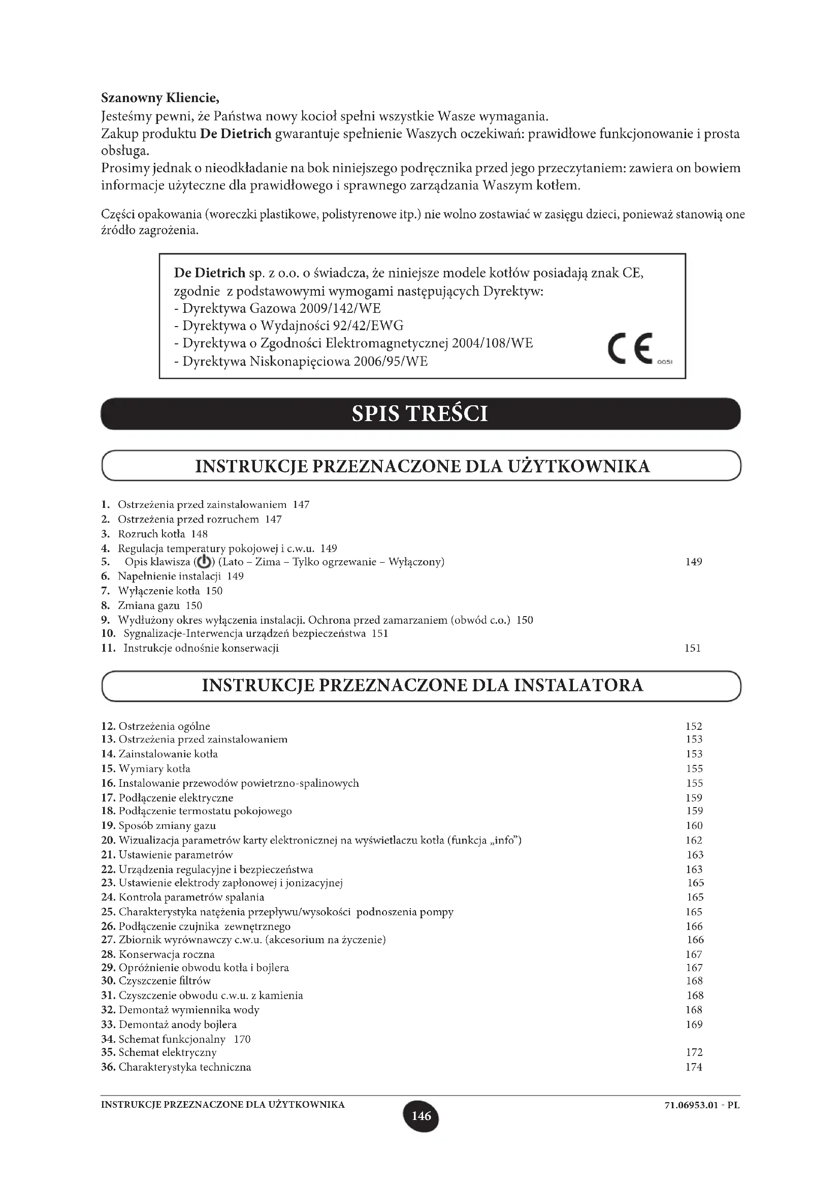 De Dietrich sp. z o.o. o świadcza, że niniejsze modele kotłów posiadają znak CE, zgodnie z podstawowymi wymogami następujących Dyrektyw: - Dyrektywa Gazowa 2009/142/WE - Dyrektywa o Wydajności 92/42/EWG - Dyrektywa o Zgodności Elektromagnetycznej 2004/108/WE - Dyrektywa Niskonapięciowa 2006/95/WE147 71.06953.01 - PL