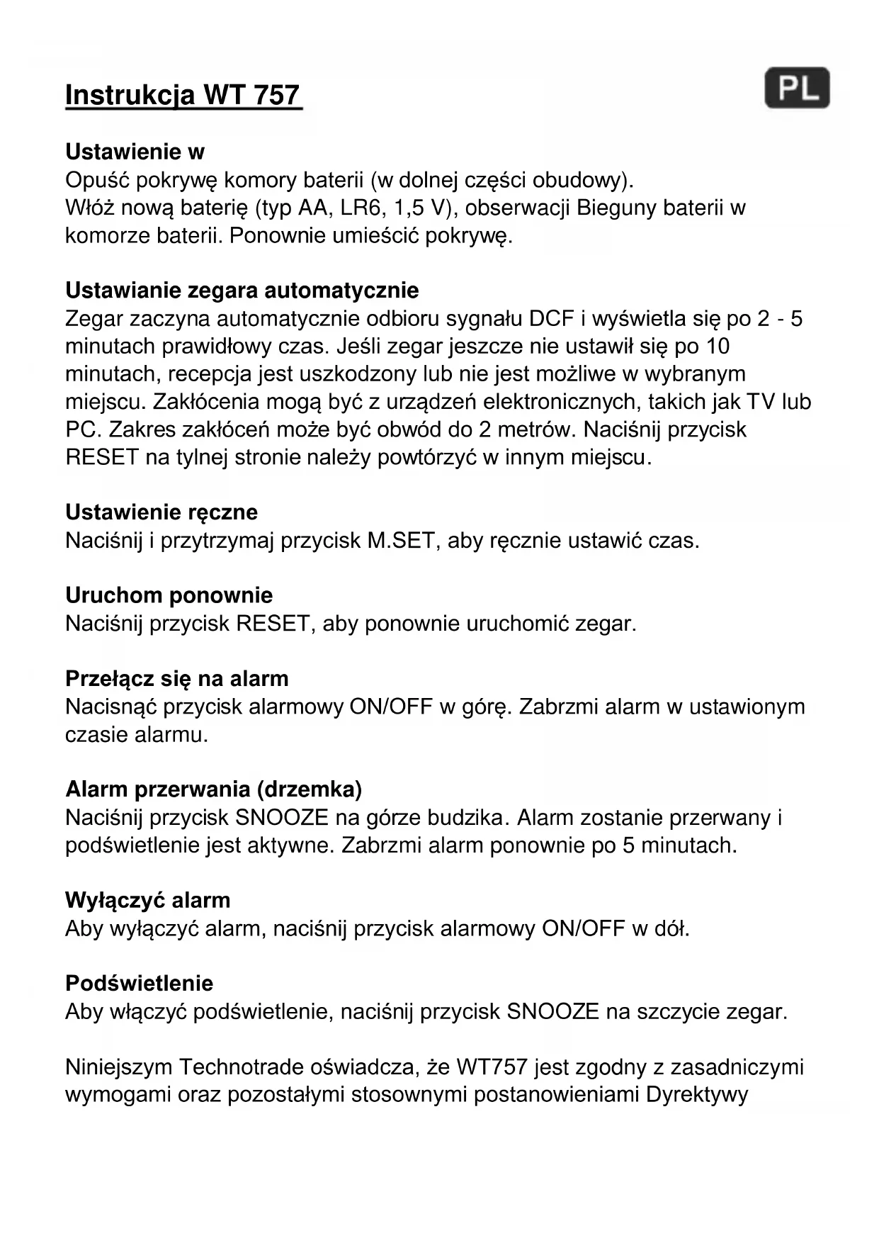 Niniejszym Technotrade oswiadcza, ze WT757 jest zgodny z zasadniczymi wymogami oraz pozostymi stosownymi postanowieniami Dyrektywy