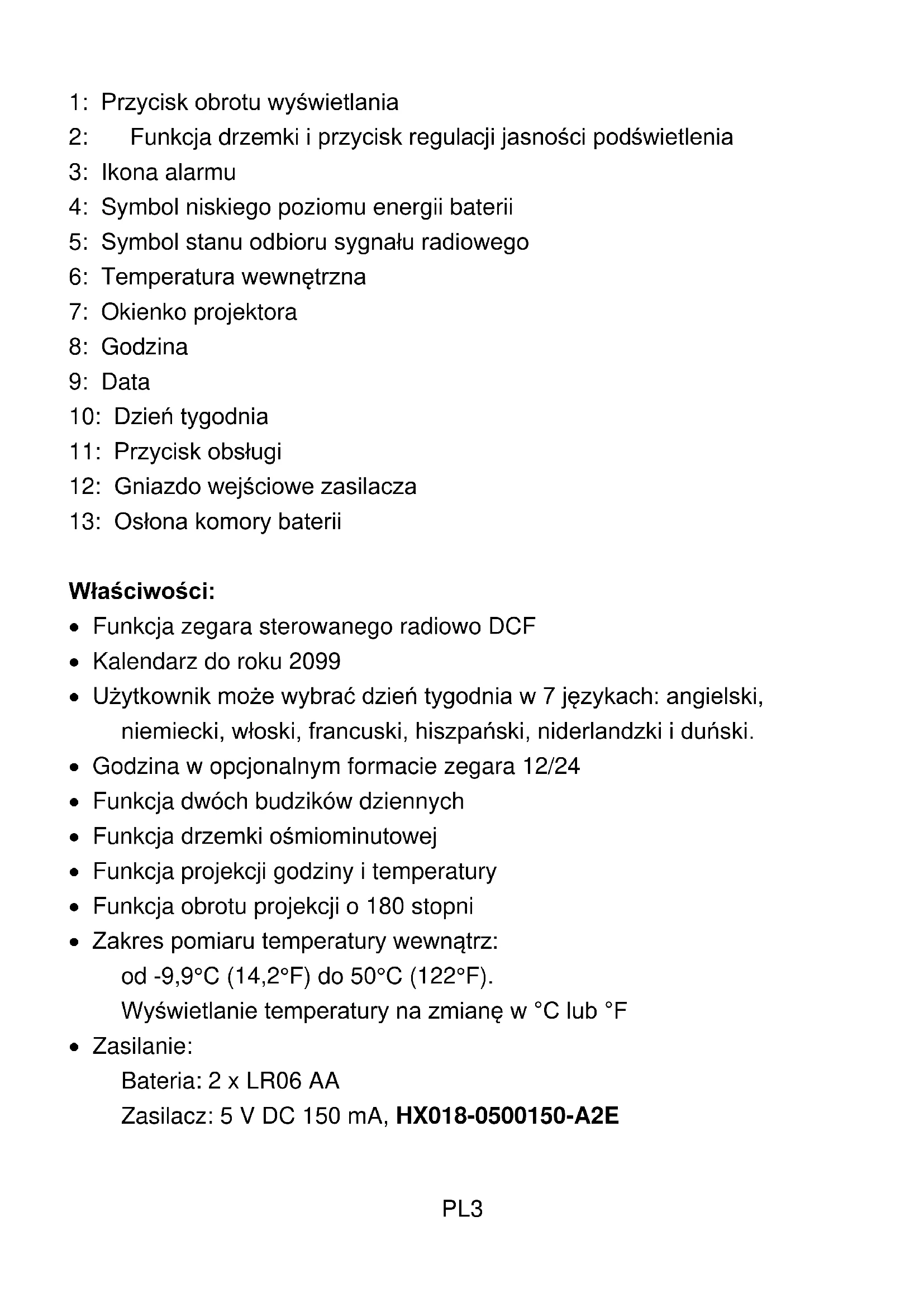 Nacisnagy przycisk „, aby potwierdzić ustawuminium i przyjeść do kolejnégo elementu menu. Kolejnosć opcji w menu ustawości jest następułąca: RCC on/off→12/24Hr →Time zone →Hour →Minute →Format of Date (D/M or M/D) →Year →Month →Date →Language of week days - Nacisnac przycisk „", aby potwierdzic ostatnie ustawuminium i zamknac tryb konfiguracje oraz powrócić do trybu wyświetlania zagara.